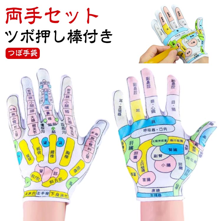 手ツボグローブ 手袋マッサージ ツボが見える手袋 手ツボ ツボ押し棒付き 疲れ緩和 肌に優しい ストレス解消 マッサージ 両面印刷ツボ 手のひら マッサージグローブ ツボ押し グッズ 伸縮性 洗濯OK 男女兼用 敬老の日 健康グローブ つぼ手袋
