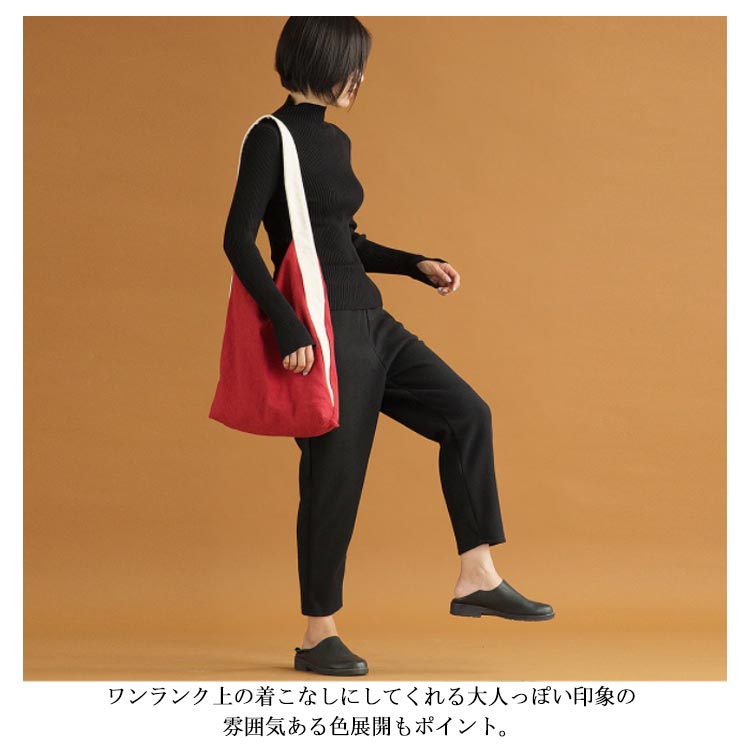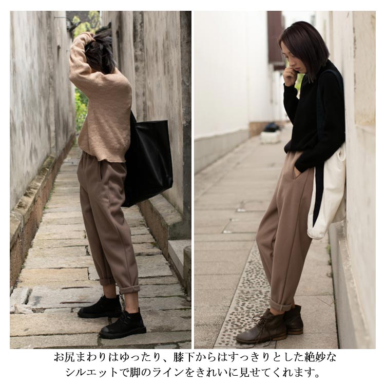 | 大人ゆるカジュアルのリラックスパンツ! お尻まわりはゆったり、膝下からはすっきりとした絶妙なシルエットで脚のラインをきれいに見せてくれます。 華奢な足首を見せることで、一段と女性らしい雰囲気に。 ワンランク上の着こなしにしてくれる大人っぽい印象の雰囲気ある色展開もポイント。 | |