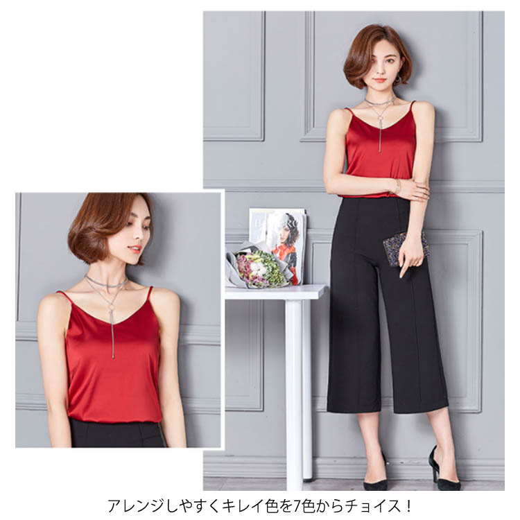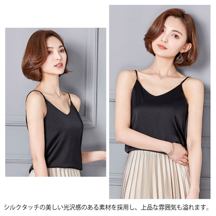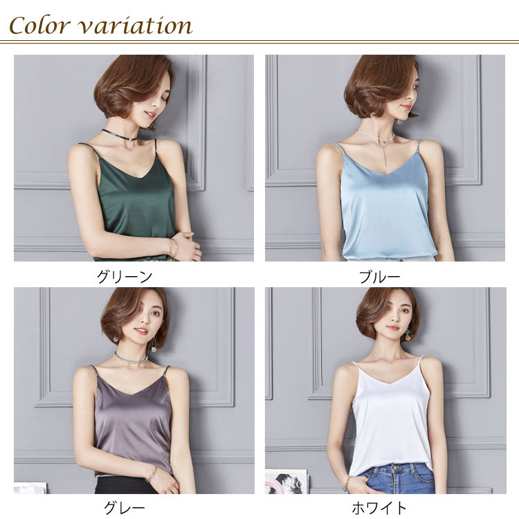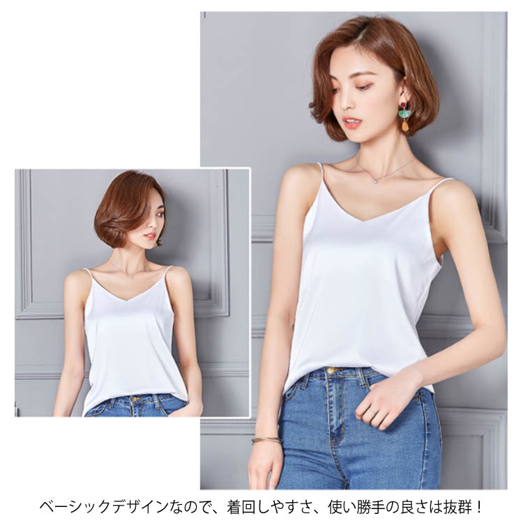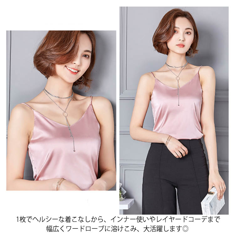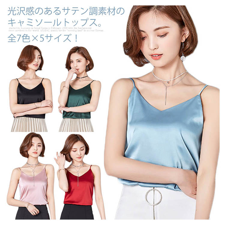 | 全7色×5サイズ!光沢感のあるサテン調素材のキャミソールトップス。 ベーシックデザインなので、着回しやすさ、使い勝手の良さは抜群! 広がったVネックdesignなので、鎖骨ラインがきれいに見せてくれます。 シルクタッチの美しい光沢感のある素材を採用し、上品な雰囲気も溢れます。 アレンジしやすくキレイ色を7色からチョイス! 1枚でヘルシーな着こなしから、インナー使いやレイヤードコーデまで幅広くワードローブに溶けこみ、大活躍します◎ | |
