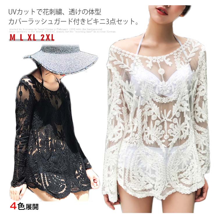 《送料無料》水着 体型カバー ラッシュガードセット ビキニ 水着 3点セット セクシー 可愛い スイムウェア UVカット シースルー 日焼け防止 長袖ラッシュガード 黒 白 ビーチウエア 体型カバー 大きサイズ