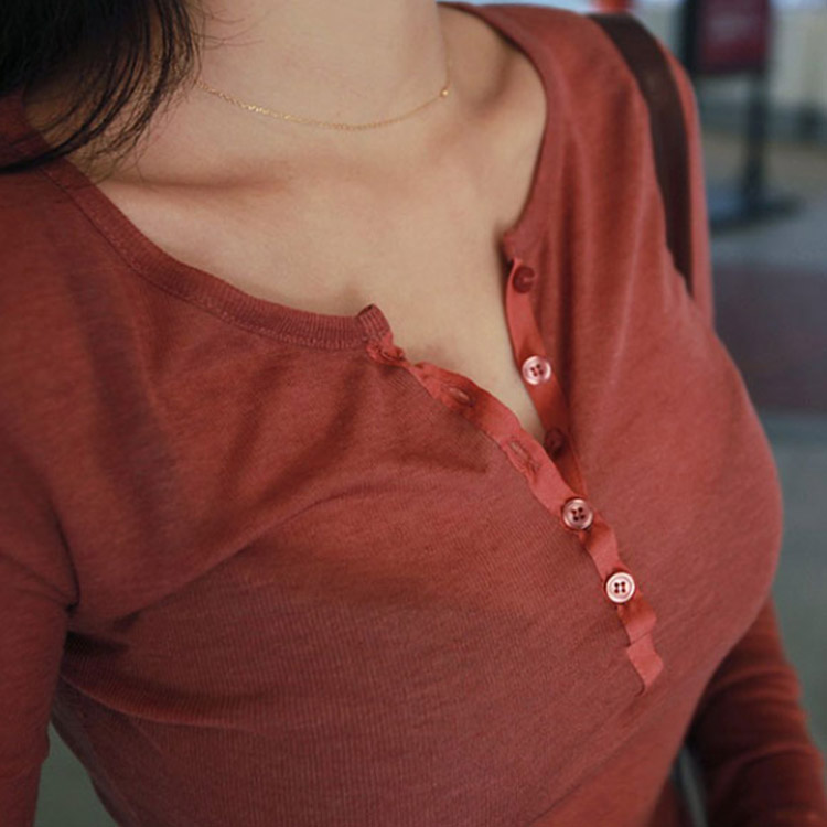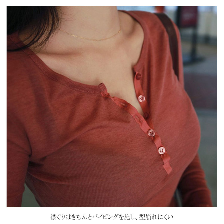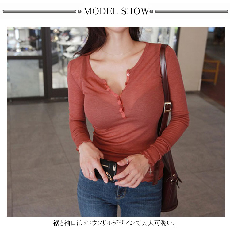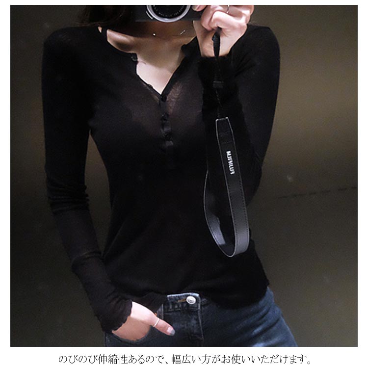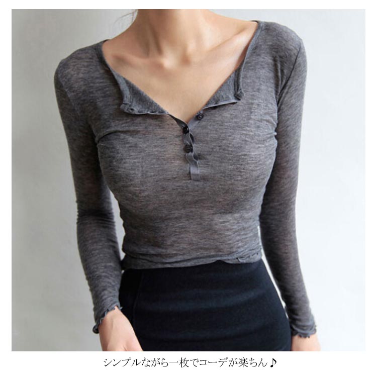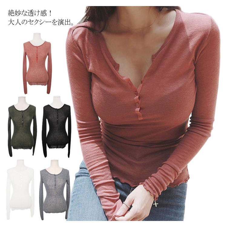 送料無料 透ける Tシャツ ヘンリネック セクシー レディース 長袖 カットソー トップス 深Vネック のびのび 伸縮性 ボタン 無地 シンプル タイト スリム ストレッチ インナー 夏 秋