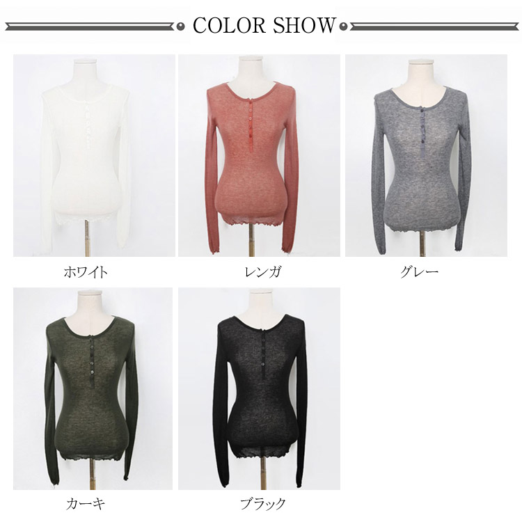 | 絶妙な透け感!大人のセクシーを演出。 裾と袖口はメロウフリルデザインで大人可愛い。 流行に左右されないシンプルデザイン、オールシズン着用できるのも嬉しいポイント。 フロントボタンのつけ具合でセクシーにもカジュアルにも楽しめる長袖Tシャツ。 のびのび伸縮性あるので、幅広い方がお使いいただけます。 シンプルながら一枚でコーデが楽ちん♪ | |