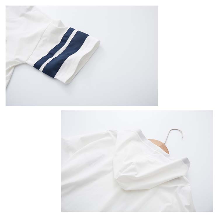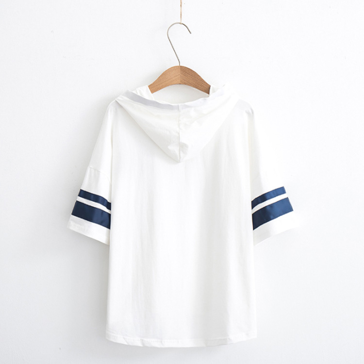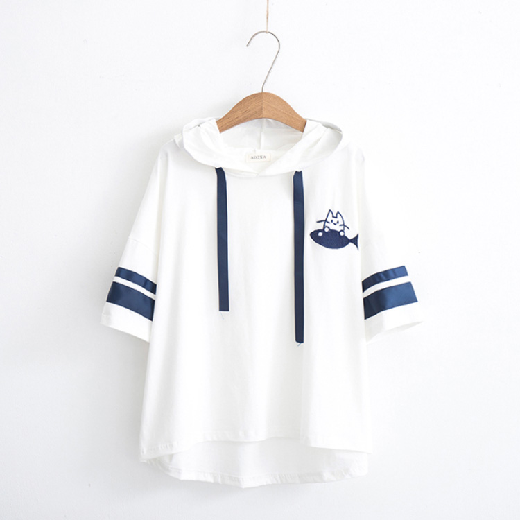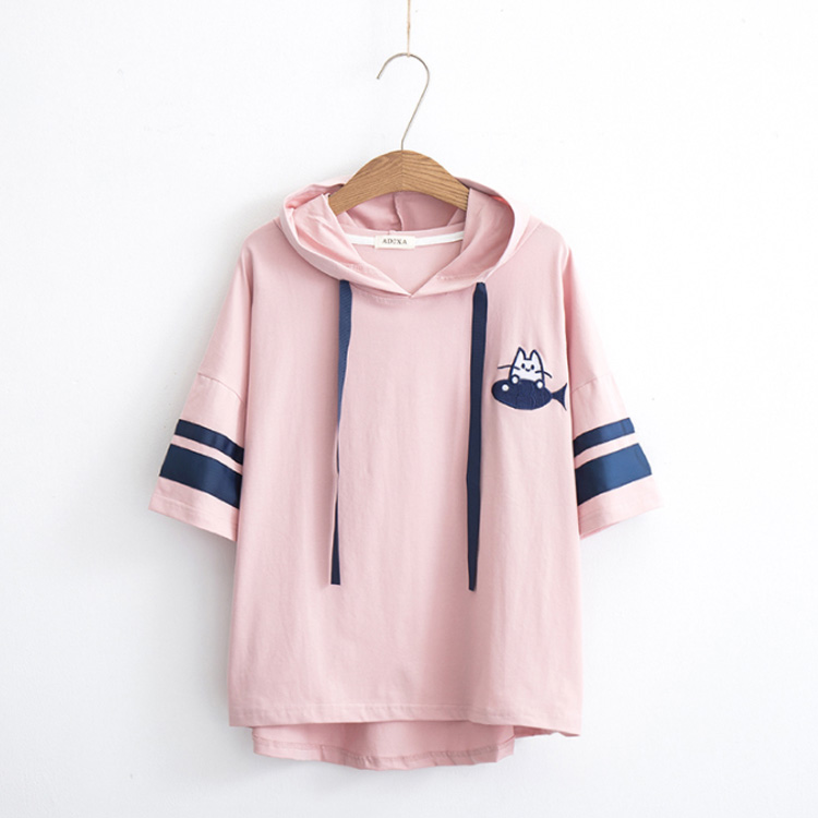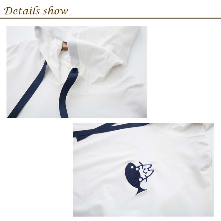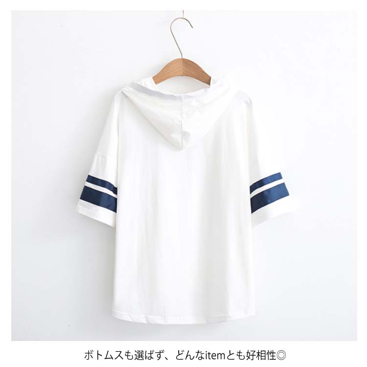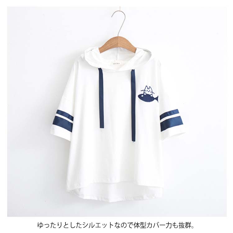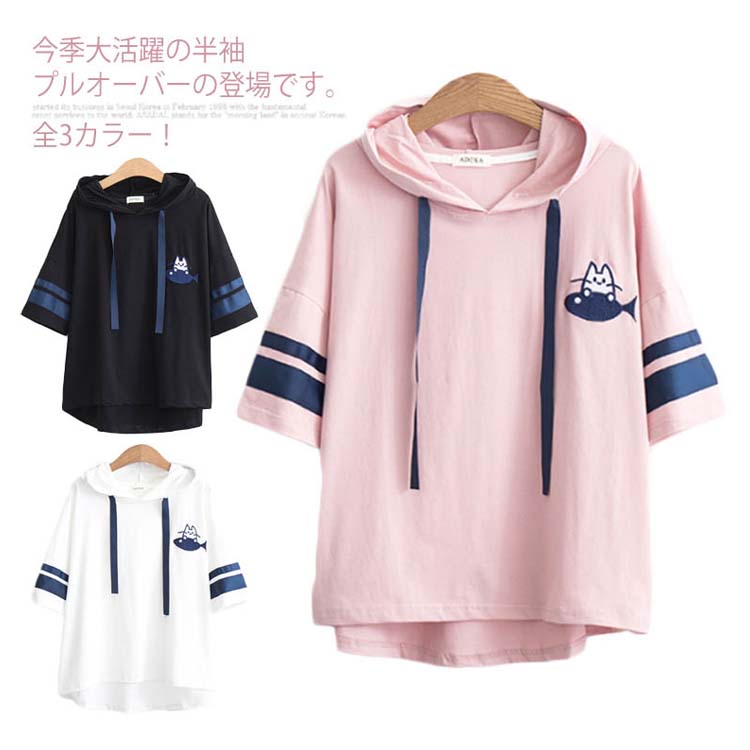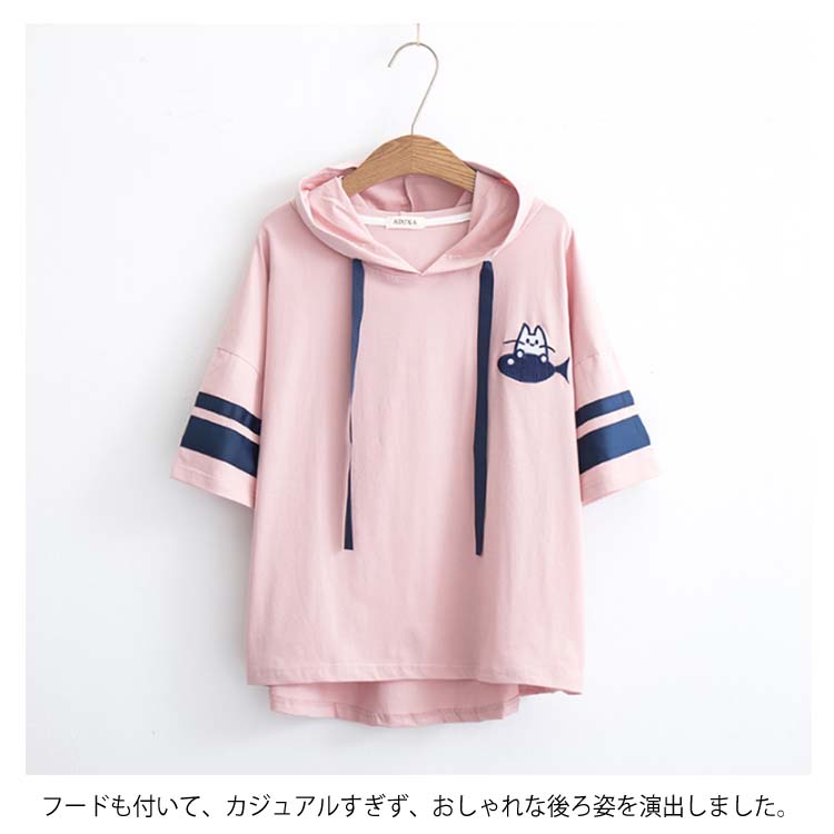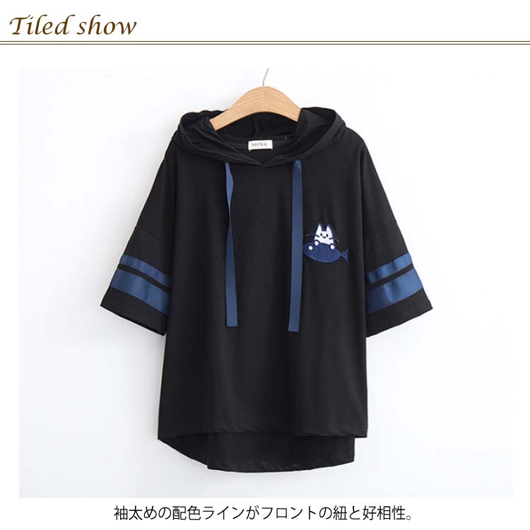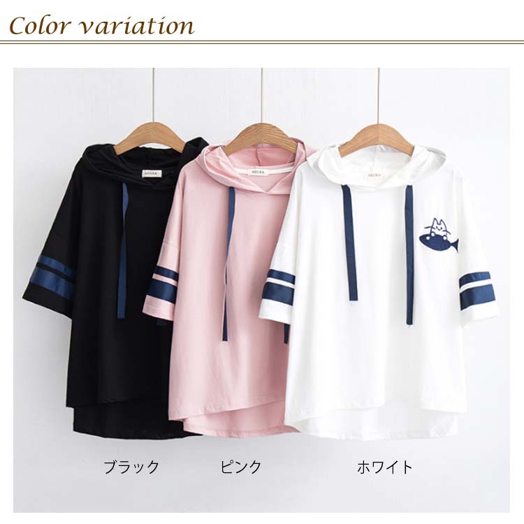 送料無料 全3カラー!フード付きtシャツ 春服 夏服 トレーナー パーカー プルオーバー トップス tシャツ ロングtシャツ 五分袖 配色ライン ネコがら 綿 大人 可愛い カジュアル 通学
