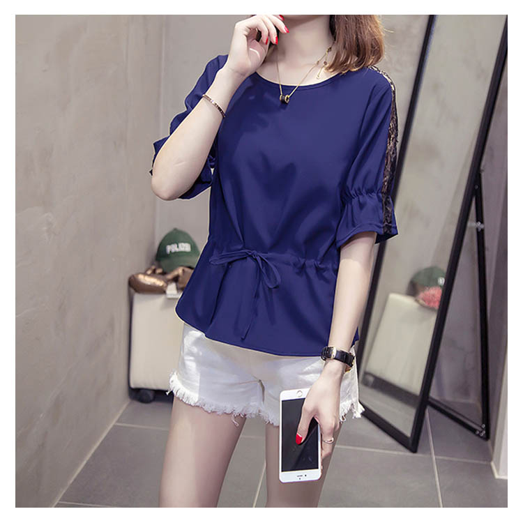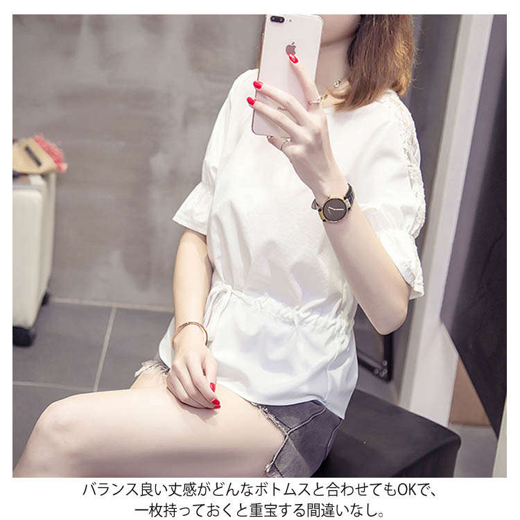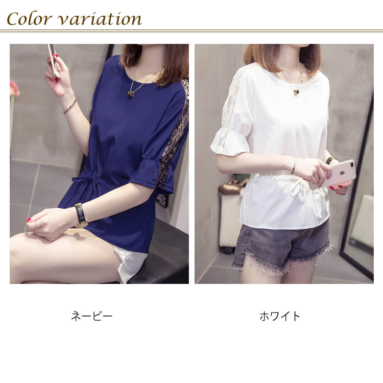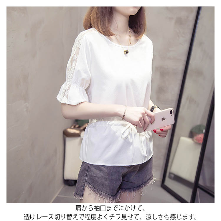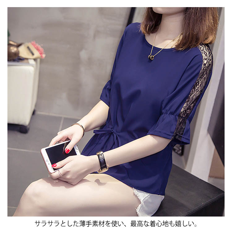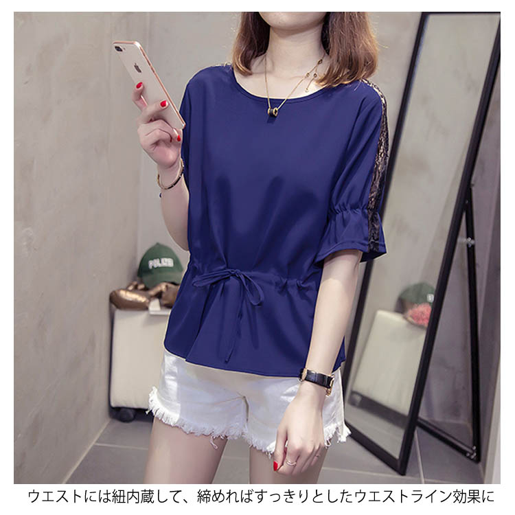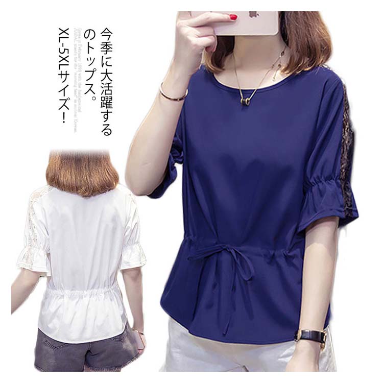 《送料無料》XL-5XLサイズ!袖レース切り替え×ウエスト紐がポイント。トップス レディース ブラウス 袖レース 切り替え 5分袖ブラウス ラウンドネック ショート丈 夏服 夏物 大きサイズ シンプル 無地