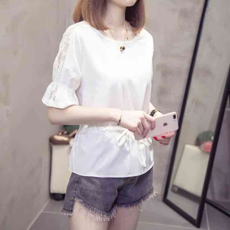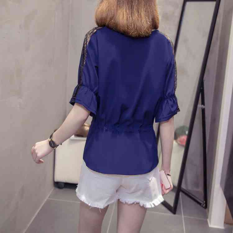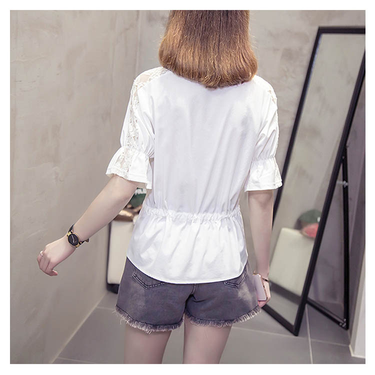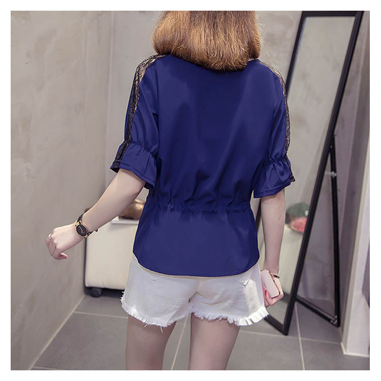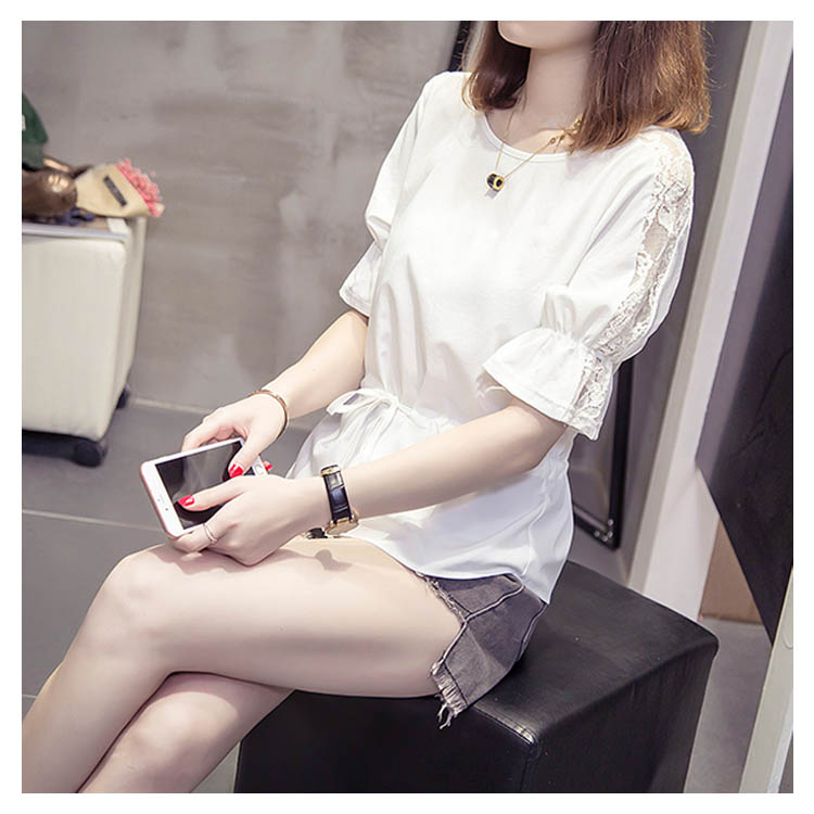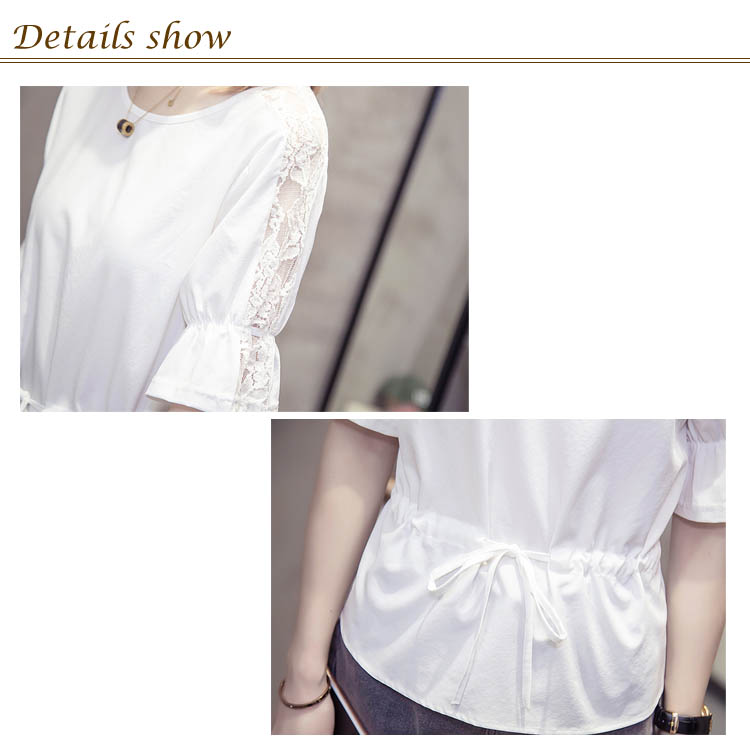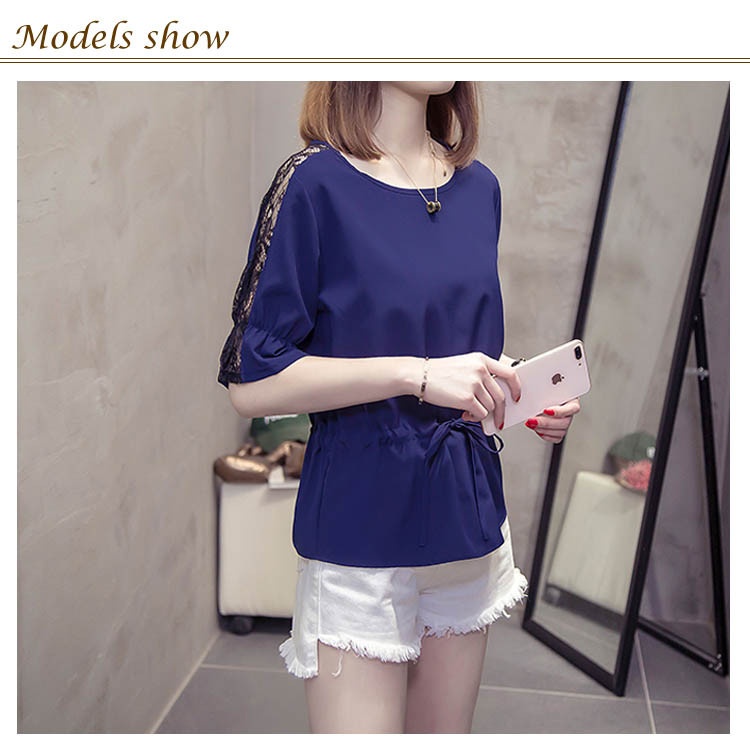 《送料無料》XL-5XLサイズ!袖レース切り替え×ウエスト紐がポイント。トップス レディース ブラウス 袖レース 切り替え 5分袖ブラウス ラウンドネック ショート丈 夏服 夏物 大きサイズ シンプル 無地