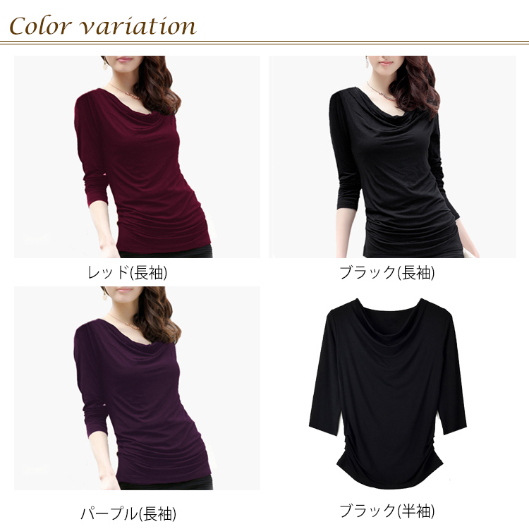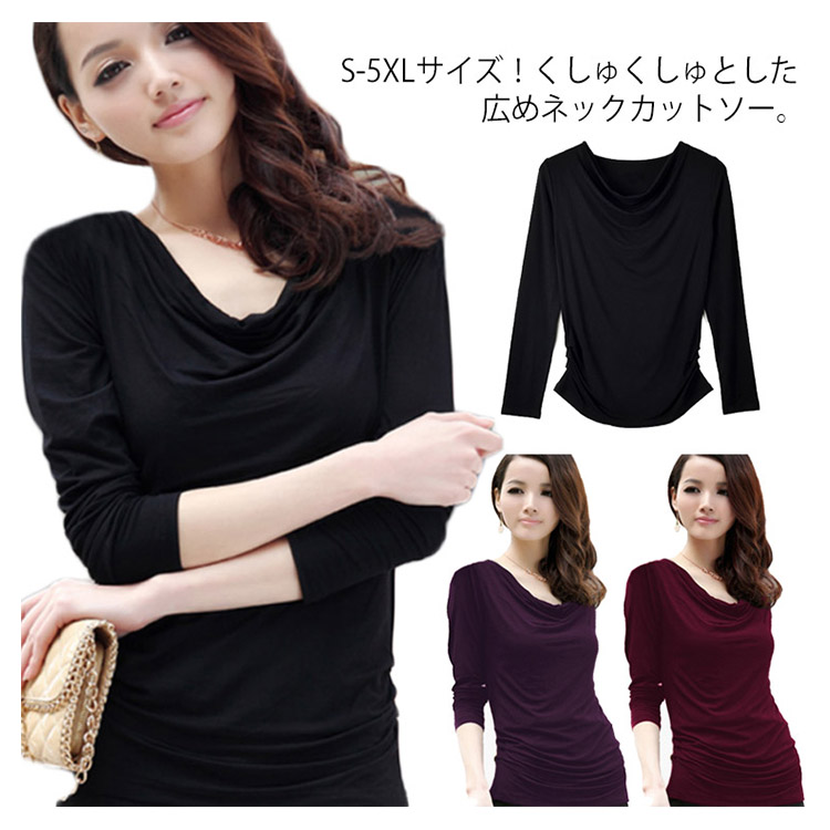 | S-5XLサイズ!くしゅくしゅとした広めネックカットソー。 広がったネックdesignでデコルテラインをきれいにみせて、女性らしさをアピール。 半袖と長袖の2種類揃い、伸びがよくタイトなスタイルなのに窮屈感がなくノンストレスで一日中快適に過ごせます。 ベーシックワンカラーなので、幅広く使えるのも魅力。 ボトムスを選ばず、カジュアルからキレイめコーデまで着回しのきく万能な1枚です。 | |