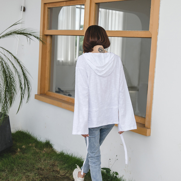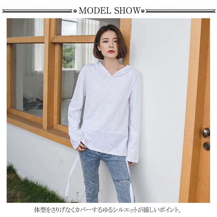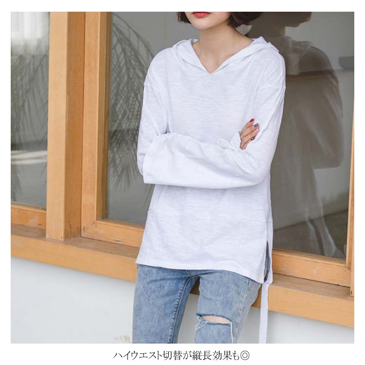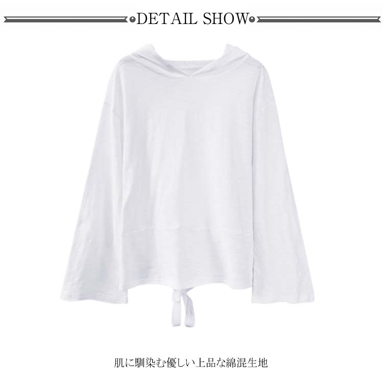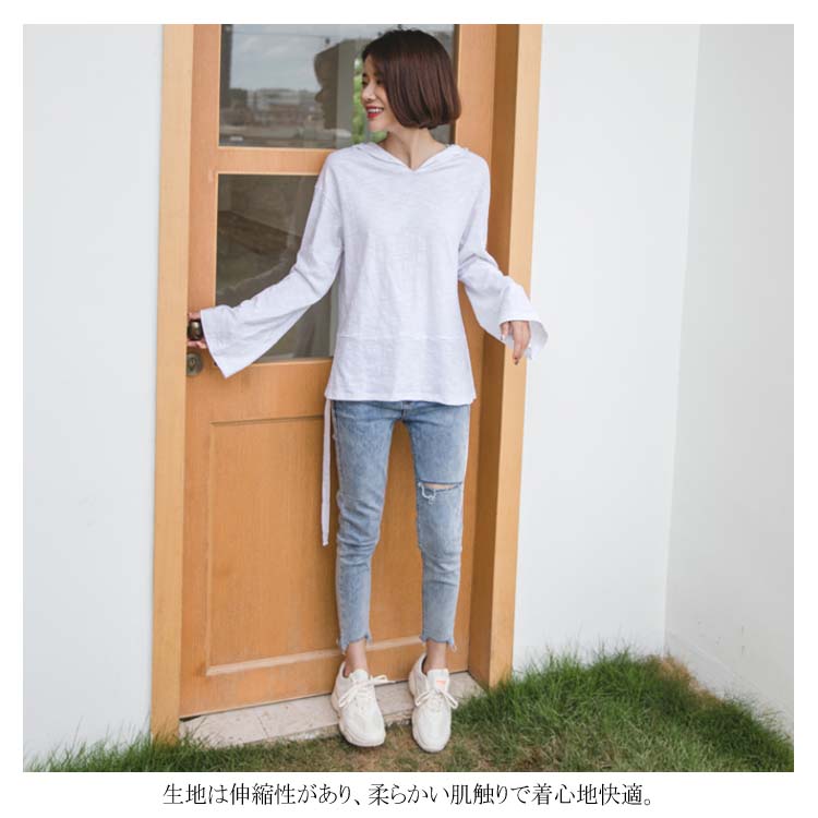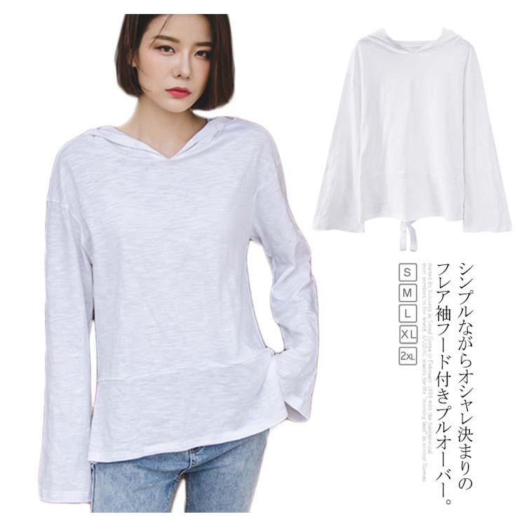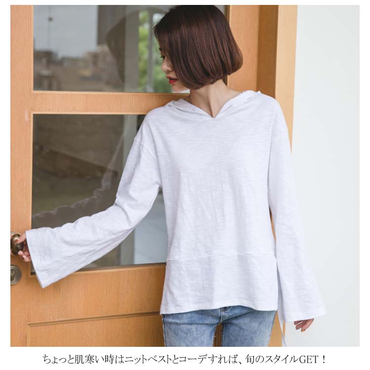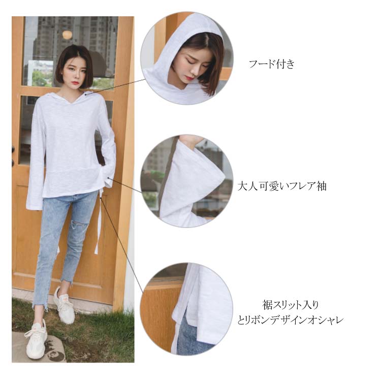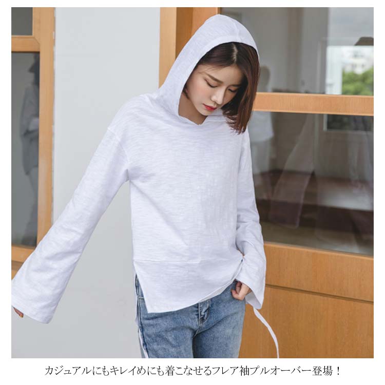送料無料 フード付きプルオーバー 長袖カットソー レディース トップス パーカー 天竺綿 フレア袖 フレアスリーブ スリット入り カジュアル オシャレ トレンド 秋 春 ゆるシルエット 体型カバー 着痩せ