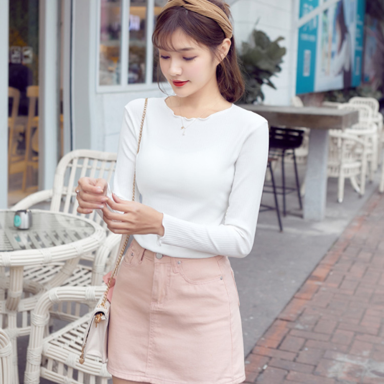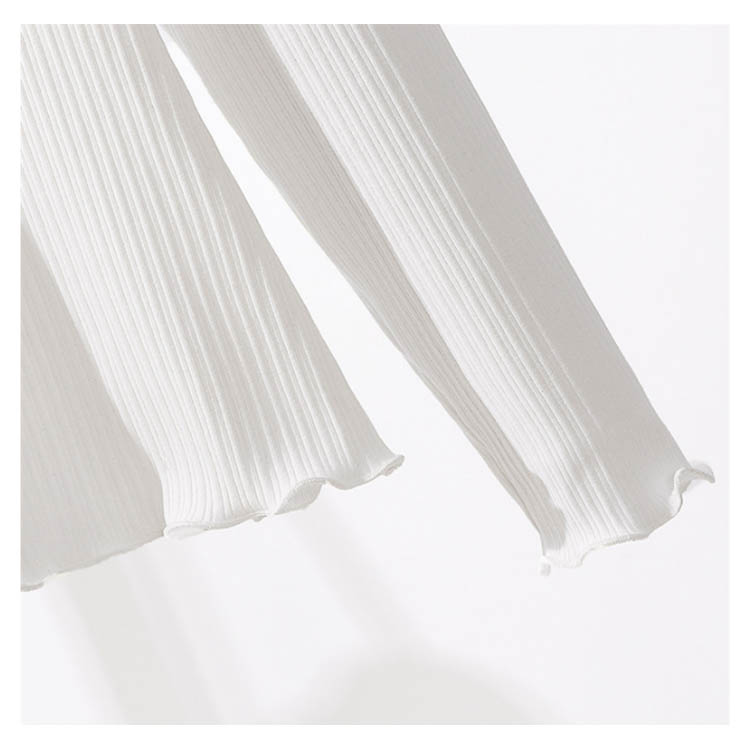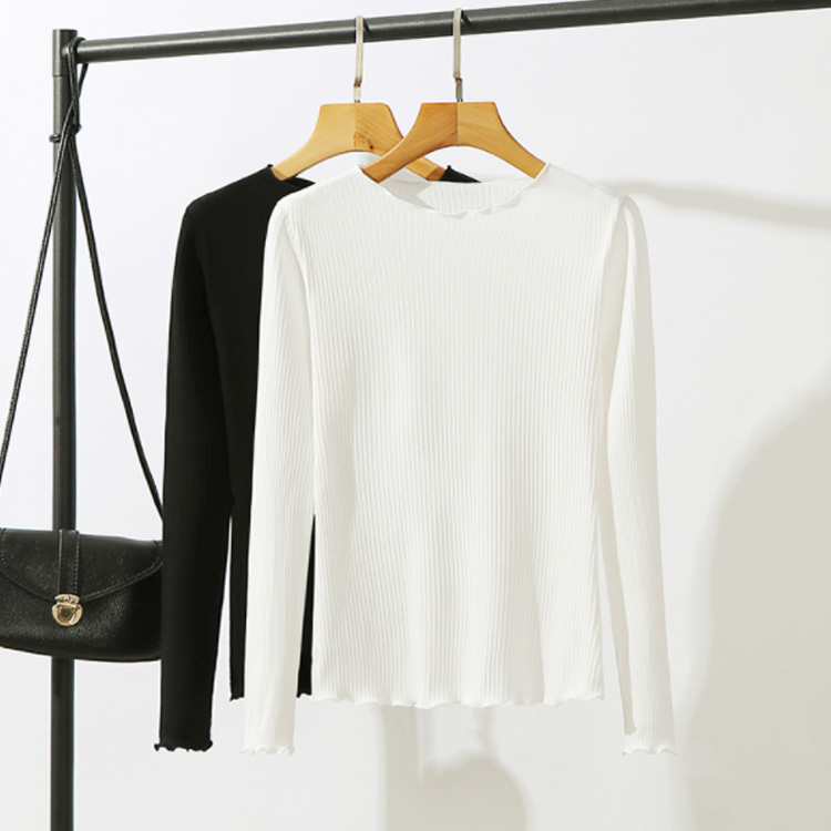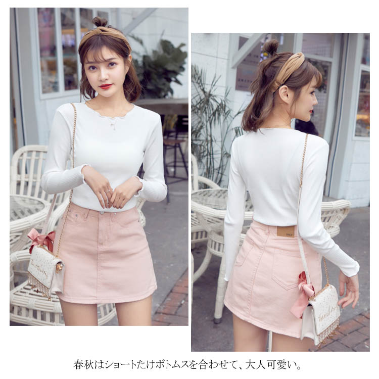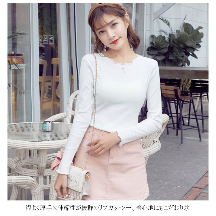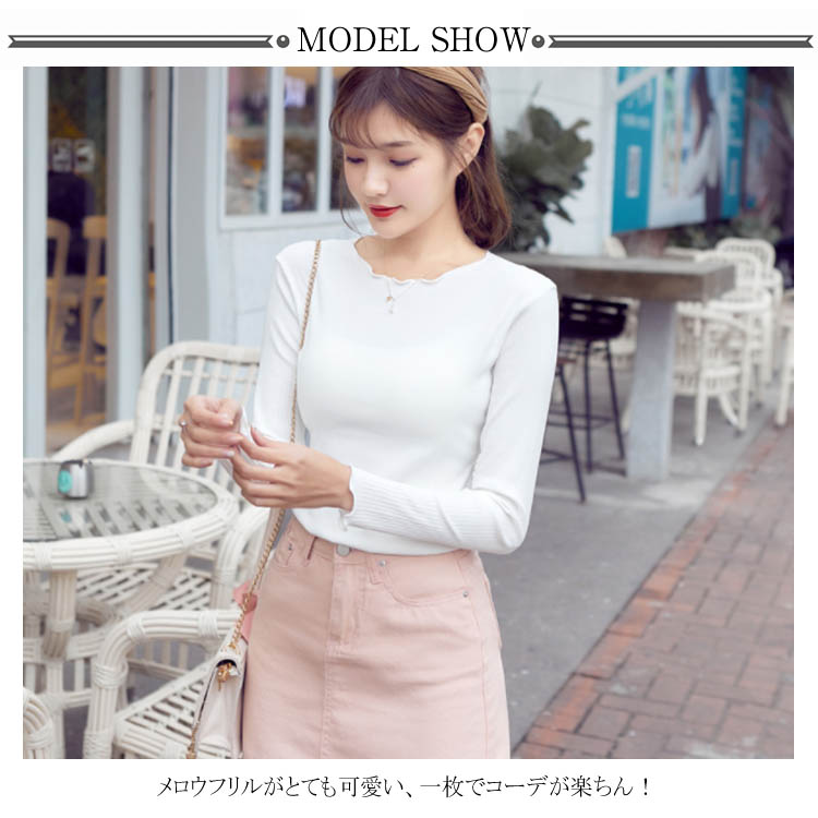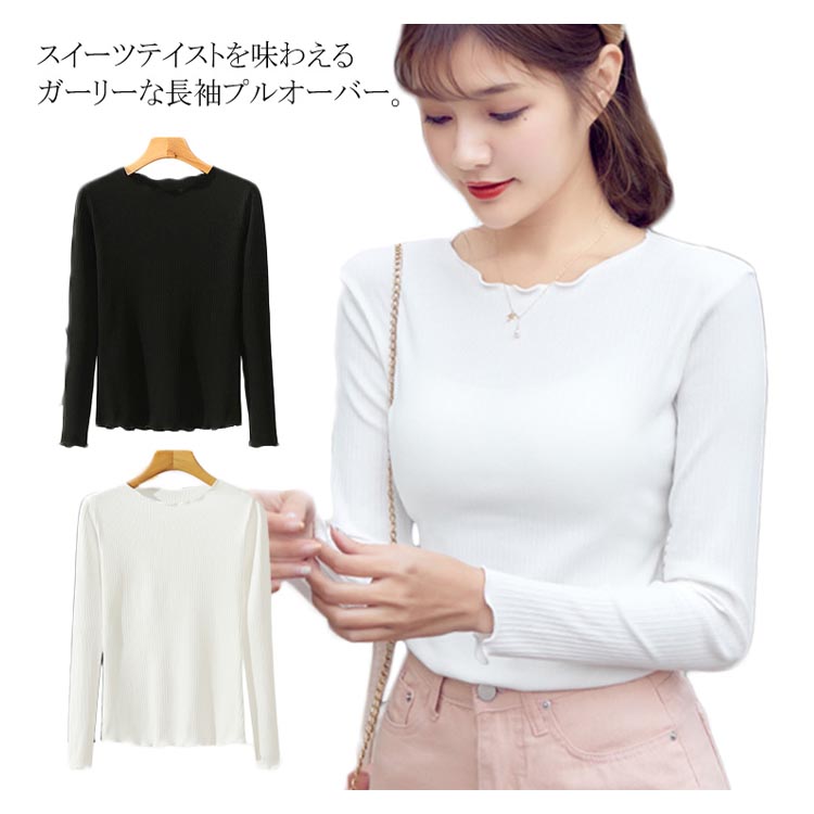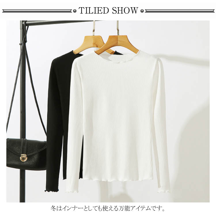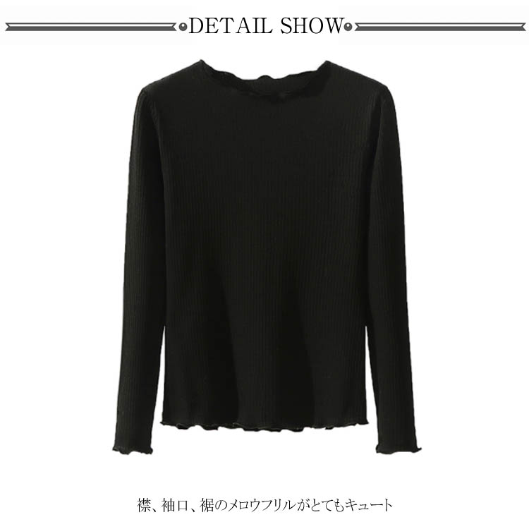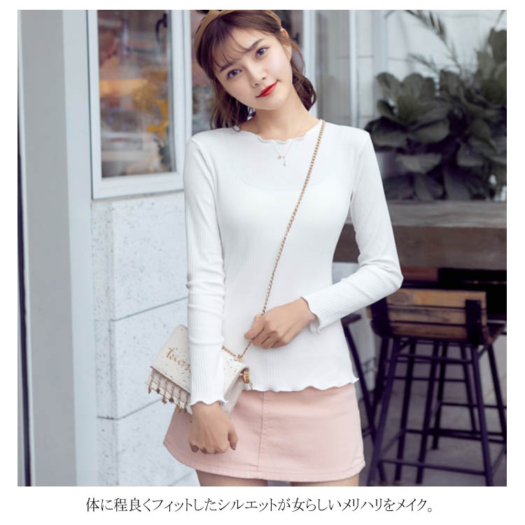 送料無料 フリルが可愛い! リブ プルオーバー 長袖 カットソー レディース トップス 長袖プルオーバー リブカットソー インナー フリル 無地 スリム ストレッチ Tシャツ タイト 細身 秋冬 新作 カジュアル レイヤード 重ね着