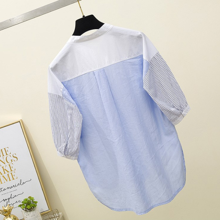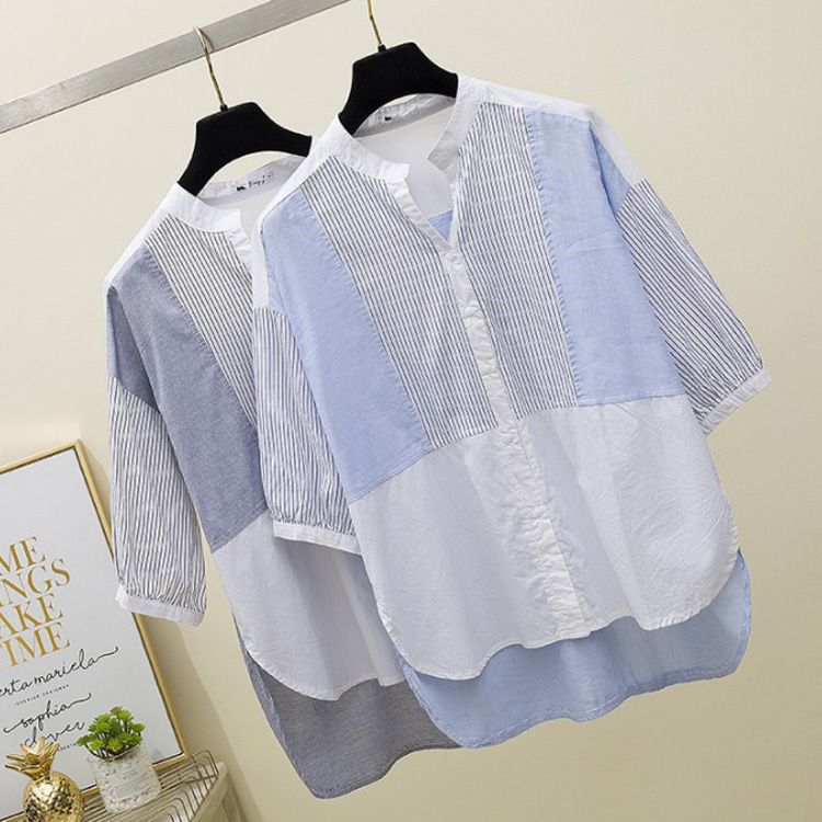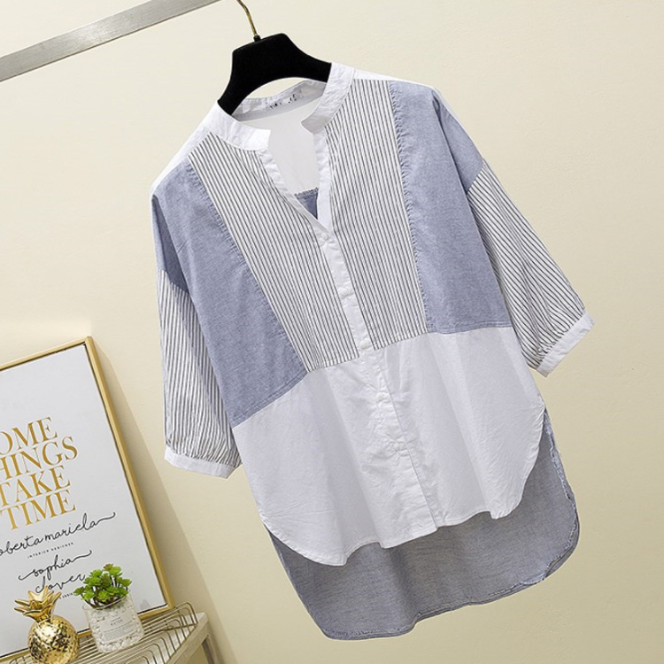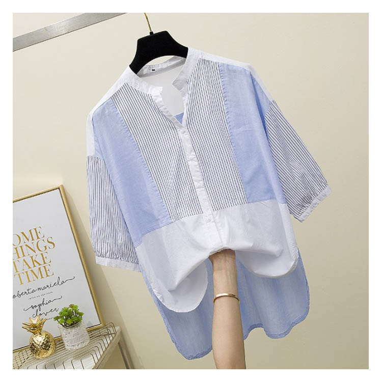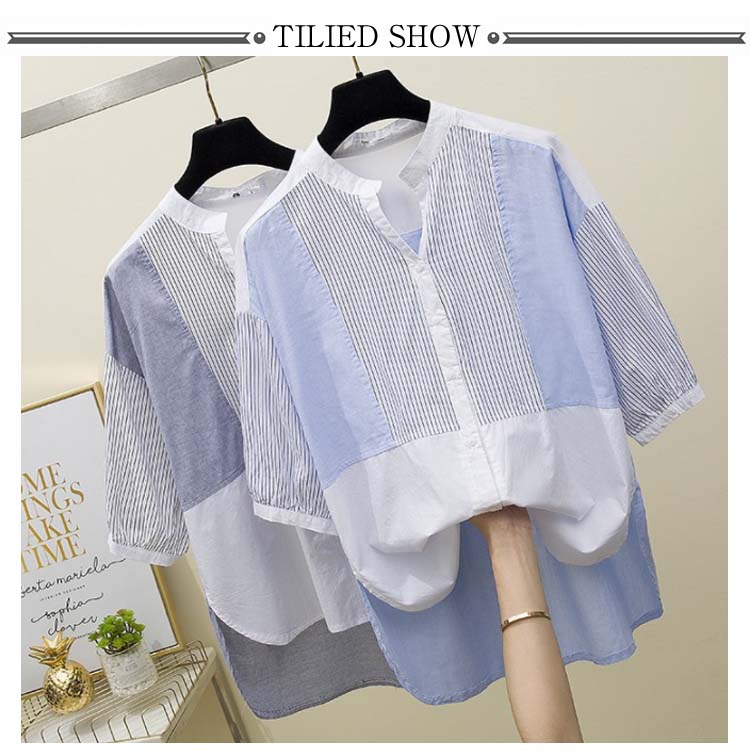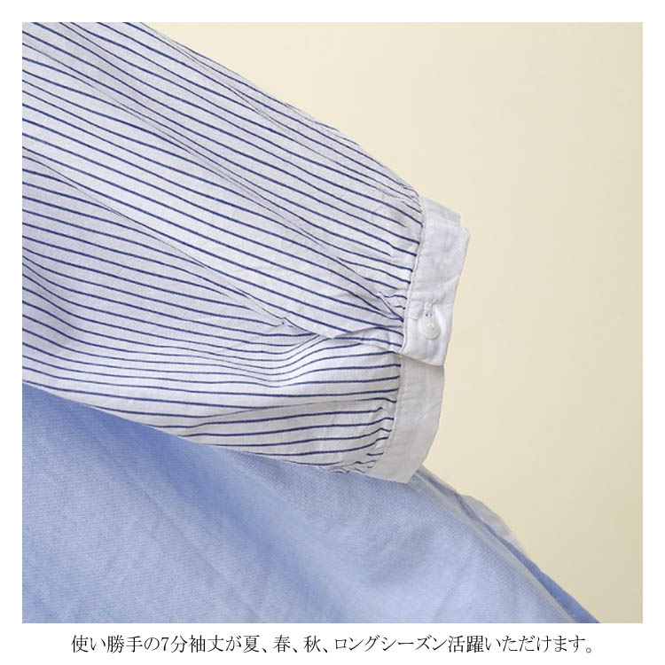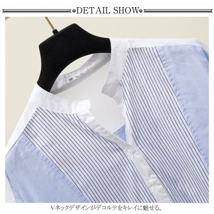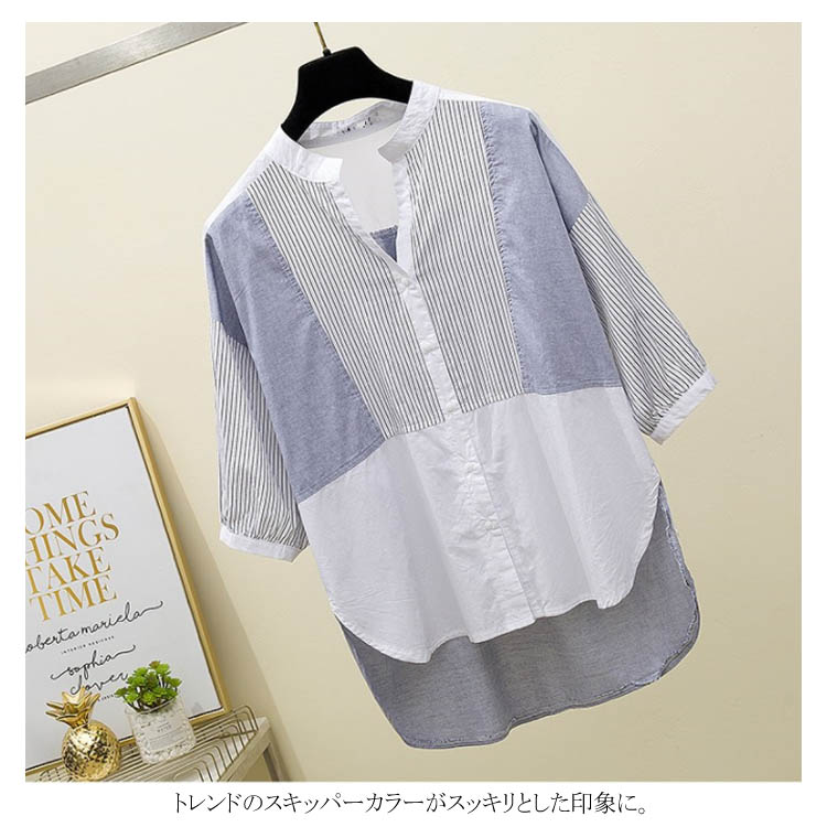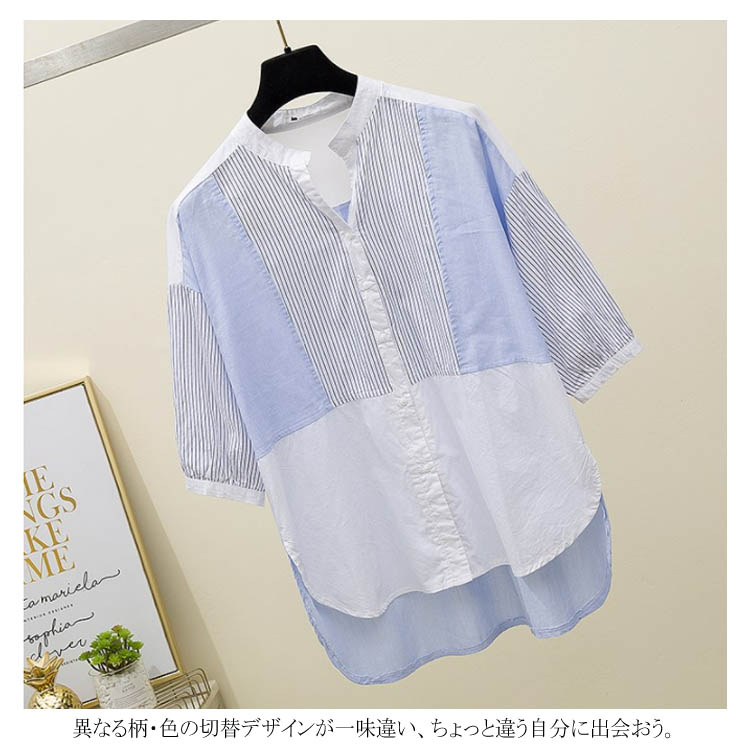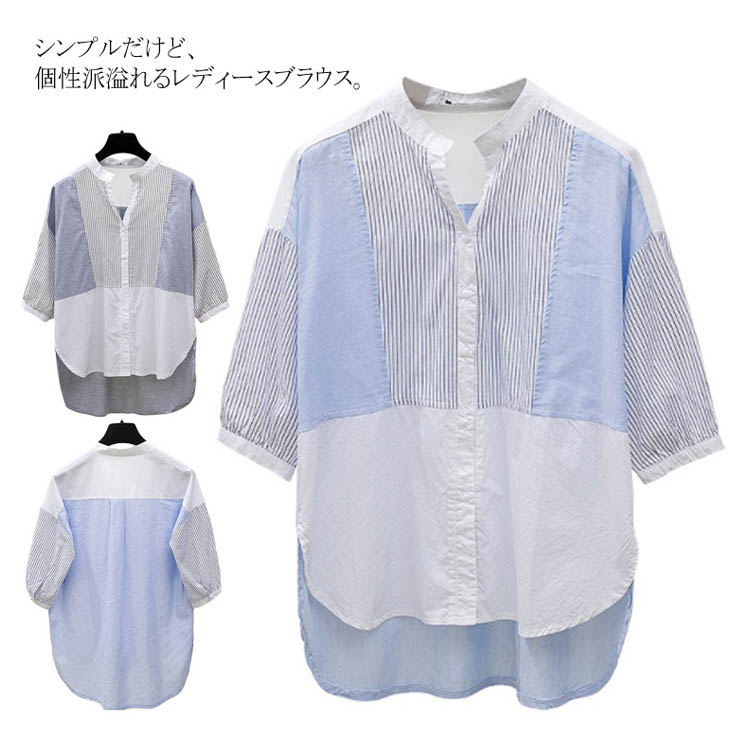 送料無料 5分袖 シャツ ブラウス レディース トップス ストライプ 切替 スキッパーシャツ ゆったり スリット入り ドロップショルダー 個性派 着痩せ オシャレ 40代 50代 60代