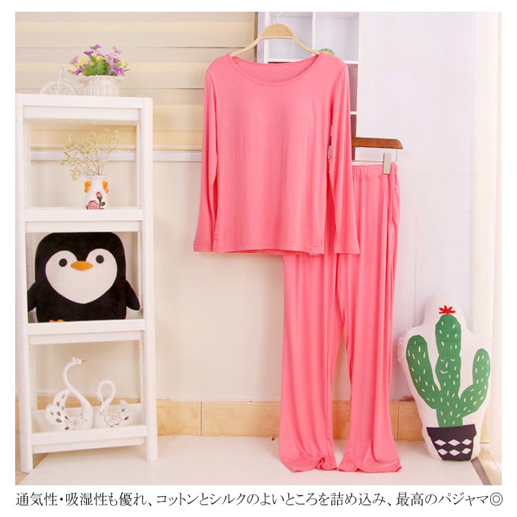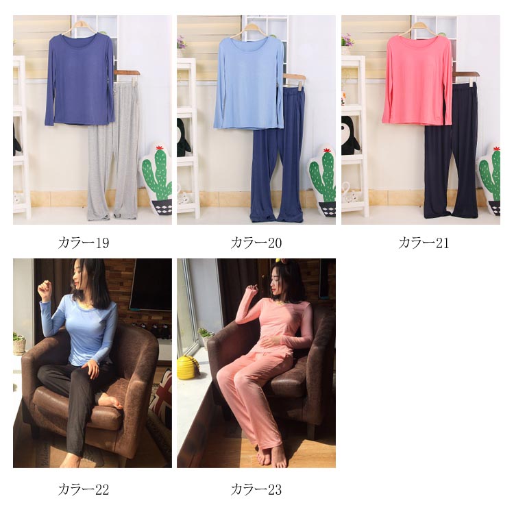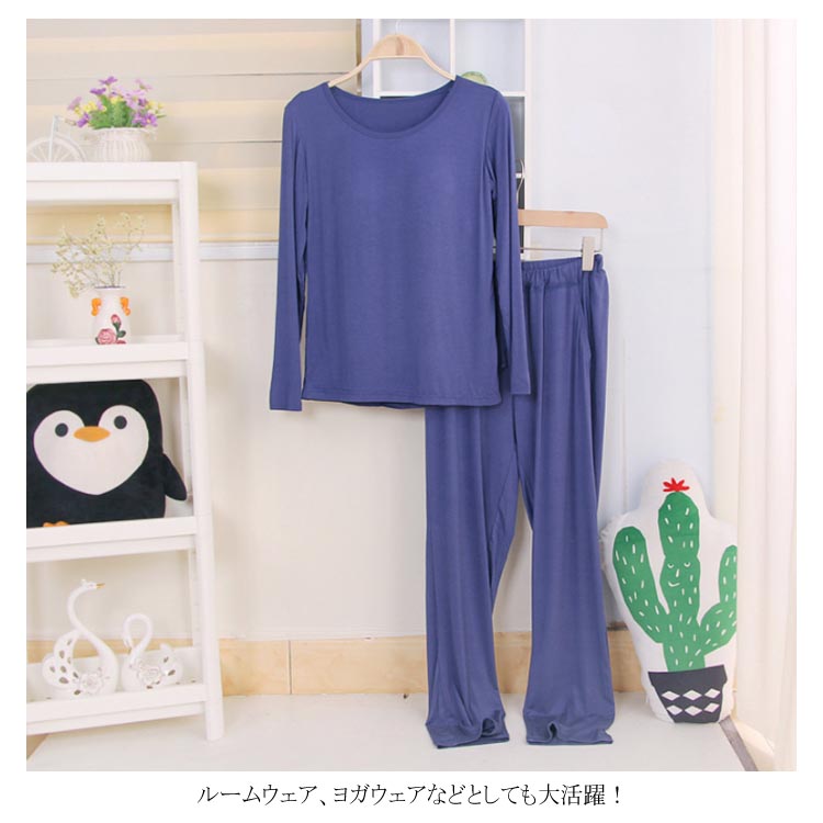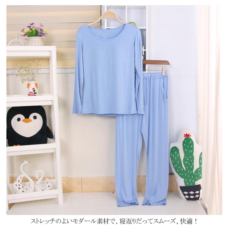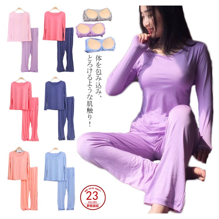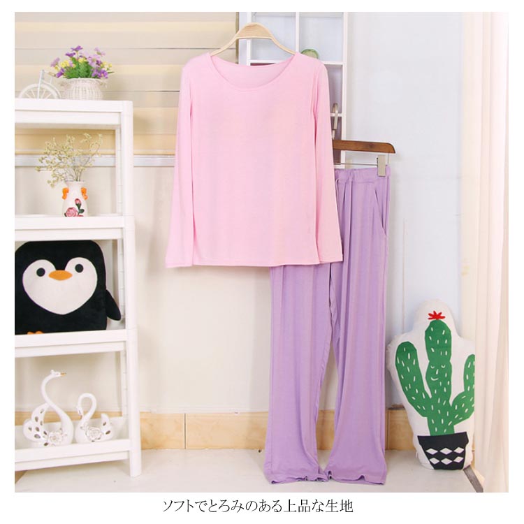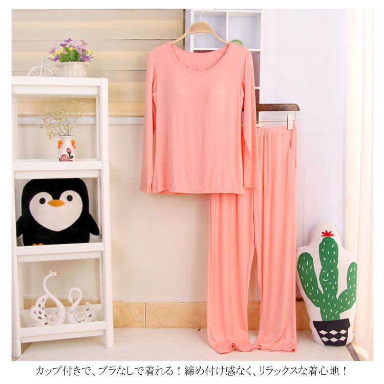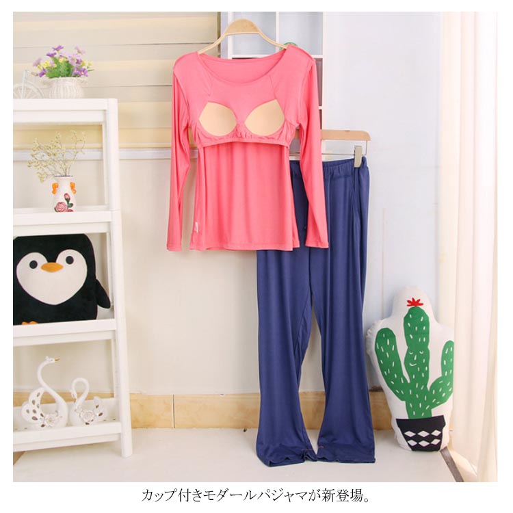 ルームウェア カップ付き パジャマ ブラ付き レディース 長袖 ナイトウェア モダール 上下セット 長パンツ ロングパンツ 長袖 プルオーバー 2点セット ゆったり リラックス ストレスフリー 秋 冬