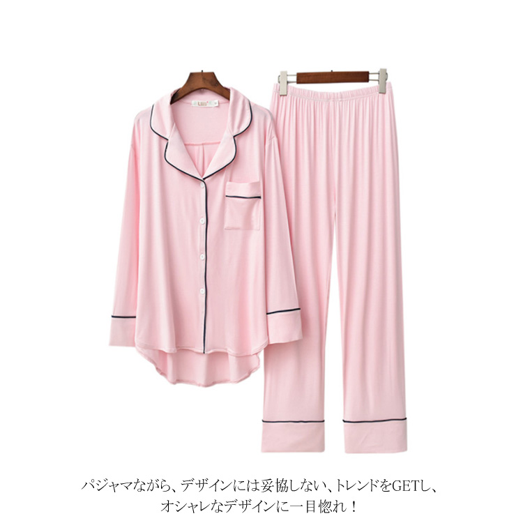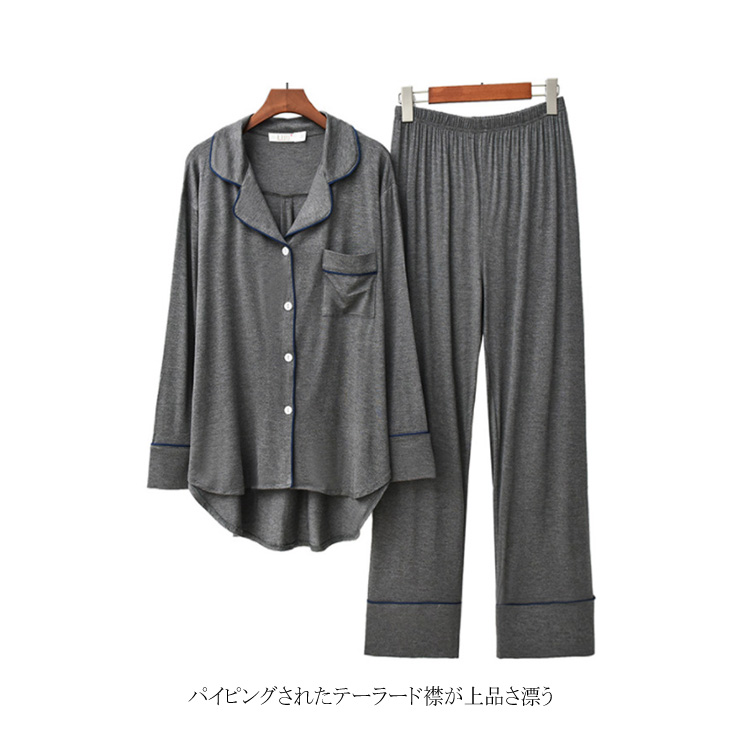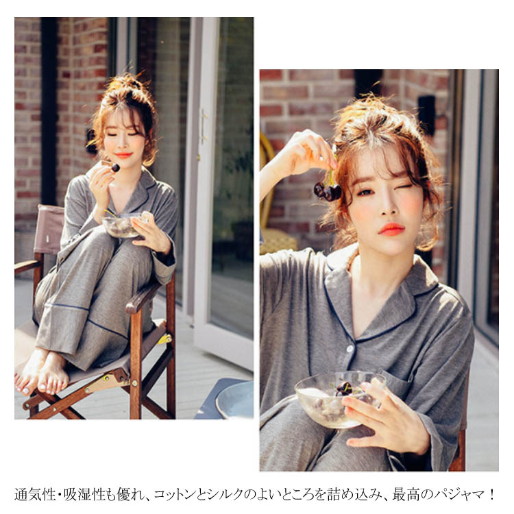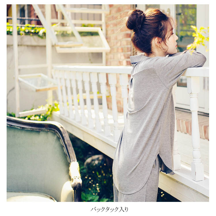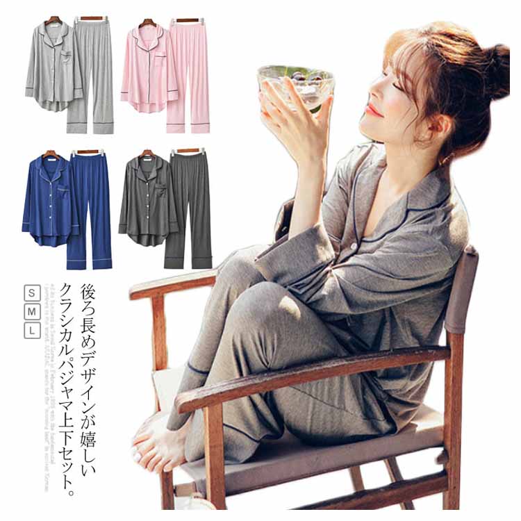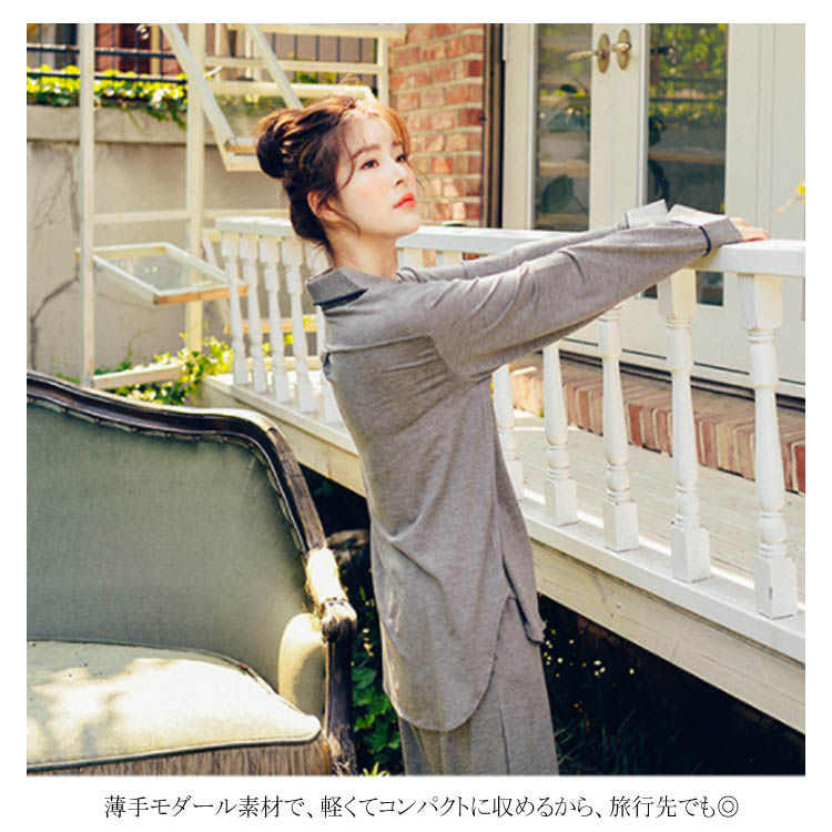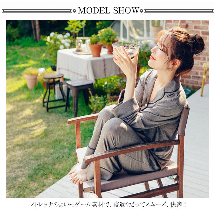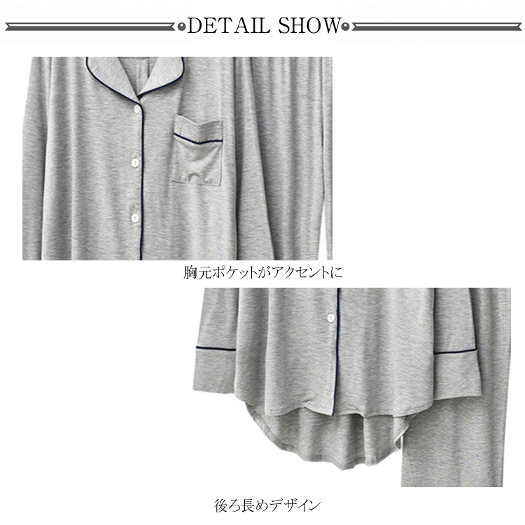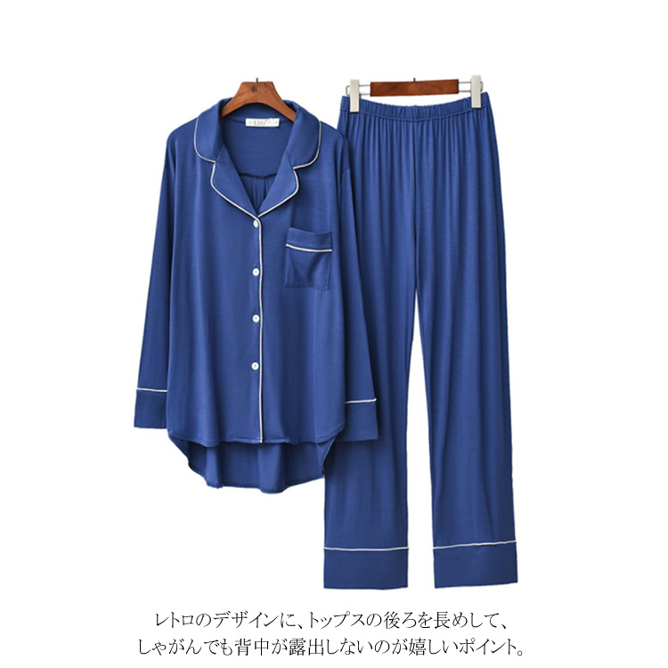 | 後ろ長めデザインが嬉しいクラシカルパジャマ上下セット。 レトロのデザインに、トップスの後ろを長めして、しゃがんでも背中が露出しないのが嬉しいポイント。 パジャマながら、デザインには妥協しない、トレンドをGETし、オシャレなデザインに一目惚れ! 一度着たらやみつきに♪とろんっとした落ち感、シルクのような肌触りにたまらない。 ストレッチのよいモダール素材で、寝返りだってスムーズ、快適! 通気性・吸湿性も優れ、コットンとシルクのよいところを詰め込み、最高のパジャマ! 薄手モダール素材で、軽くてコンパクトに収めるから、旅行先でも◎ マタニティ、入院、部屋着など色々使える人気パジャマです。 | |