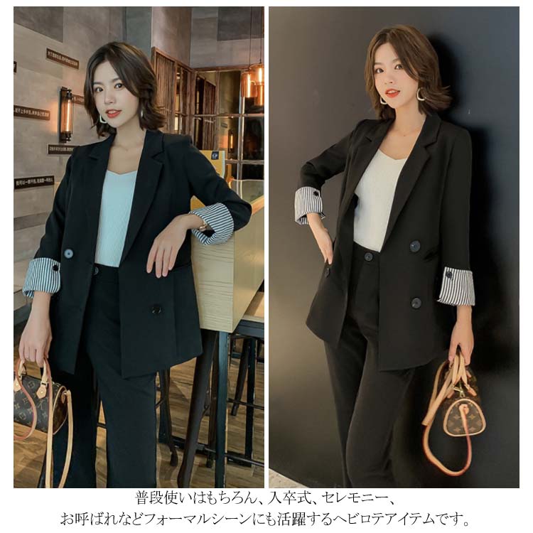 | 絶妙なバランス!アンクルパンツとやや長めのジャケットが縦長効果抜群のパンツスーツです。 ジャケットの袖口にはストライプ柄を見せるロールアップ仕様で、コーデのアクセントに◎ ヒップまですっぽり隠れる丈感とゆとりのあるシルエットが完璧に体型カバーし、着痩せ効果も期待できます。 足首を見せるトレンドのアンクル丈パンツ、ブーツや靴下のオシャレを邪魔せず、スタイリッシュをワンランクアップ。 カジュアルにもキレイめにも◎毎日のオシャレが楽しめるパンツスーツです。 普段使いはもちろん、入卒式、セレモニー、お呼ばれなどフォーマルシーンにも活躍するヘビロテアイテムです。 | |