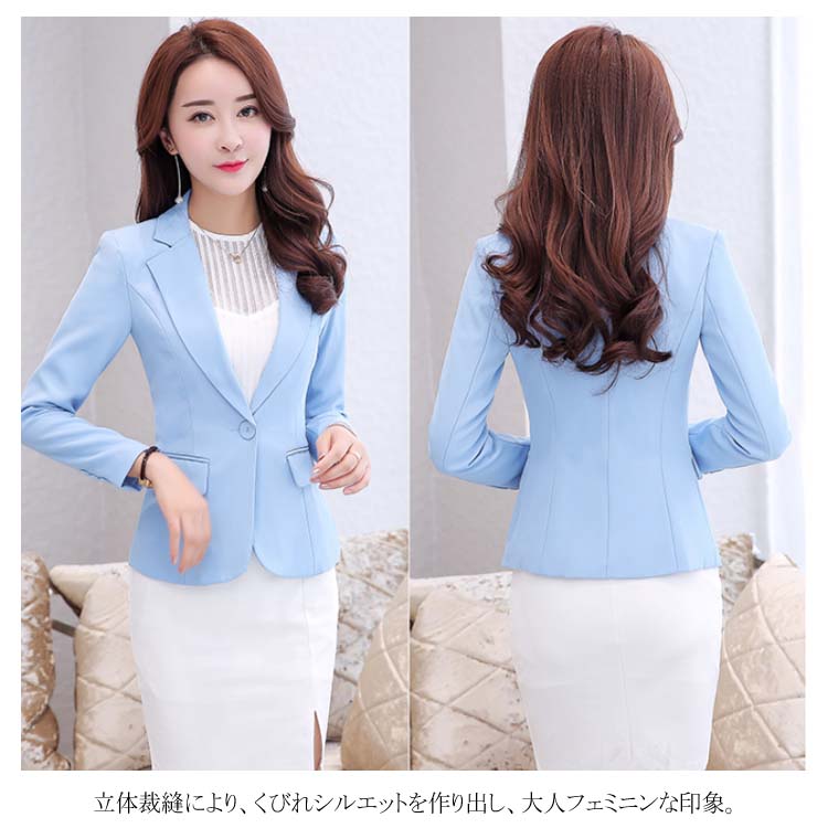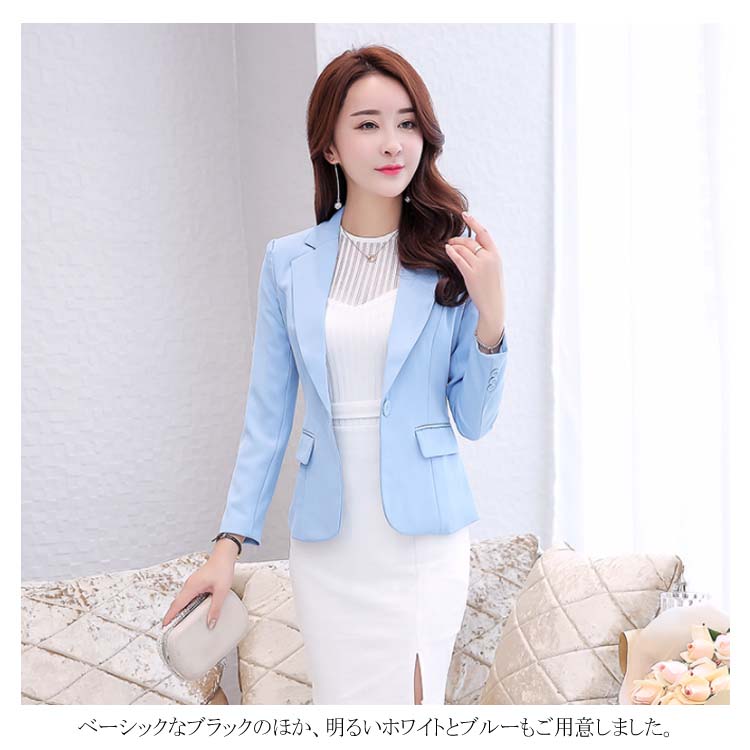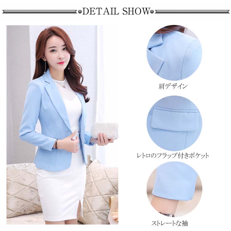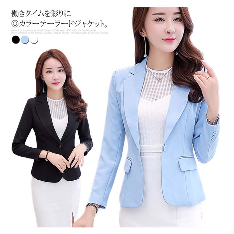 | 働きタイムを彩りに◎カラーテーラードジャケット。 ベーシックなブラックのほか、明るいホワイトとブルーもご用意しました。 立体裁縫により、くびれシルエットを作り出し、大人フェミニンな印象。 程よい丈感がパンツスタイルにもスカートスタイルにもマッチできるから、就活やオフィスに大人気。 シワになりにくい素材を採用し、お手入れ簡単。出張などにバッチリ。 普段着はもちろん、結婚式、入学式、卒園式、発表会、お呼ばれ、二次会などフォーマルシーンも大活躍! | |