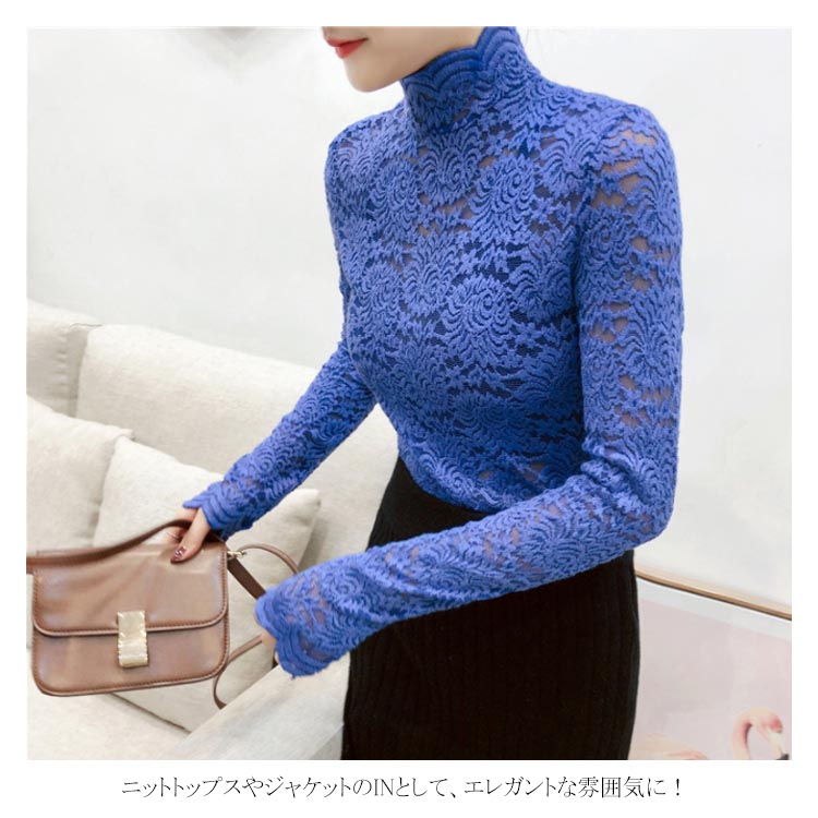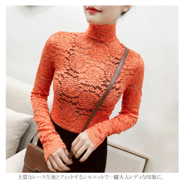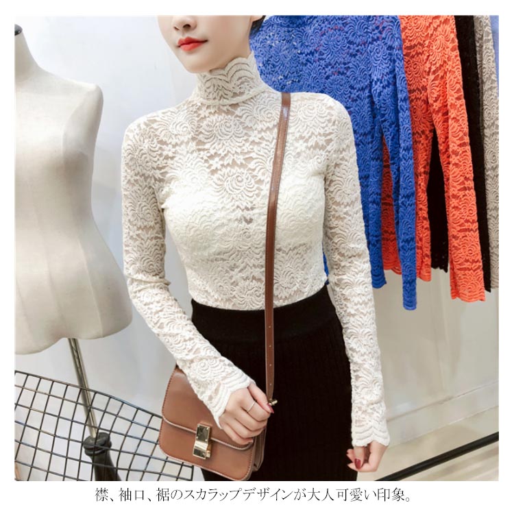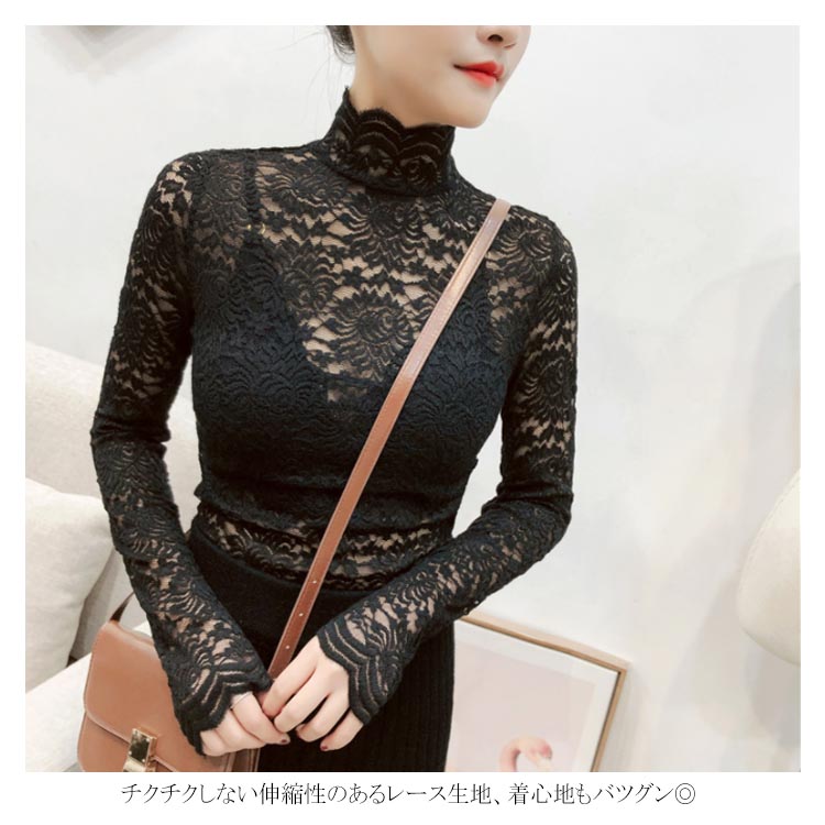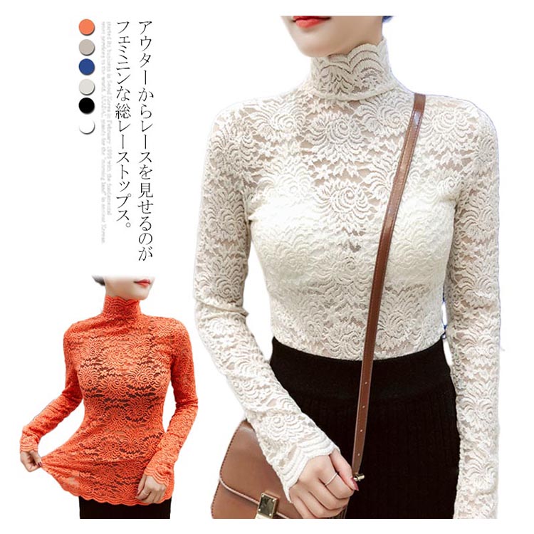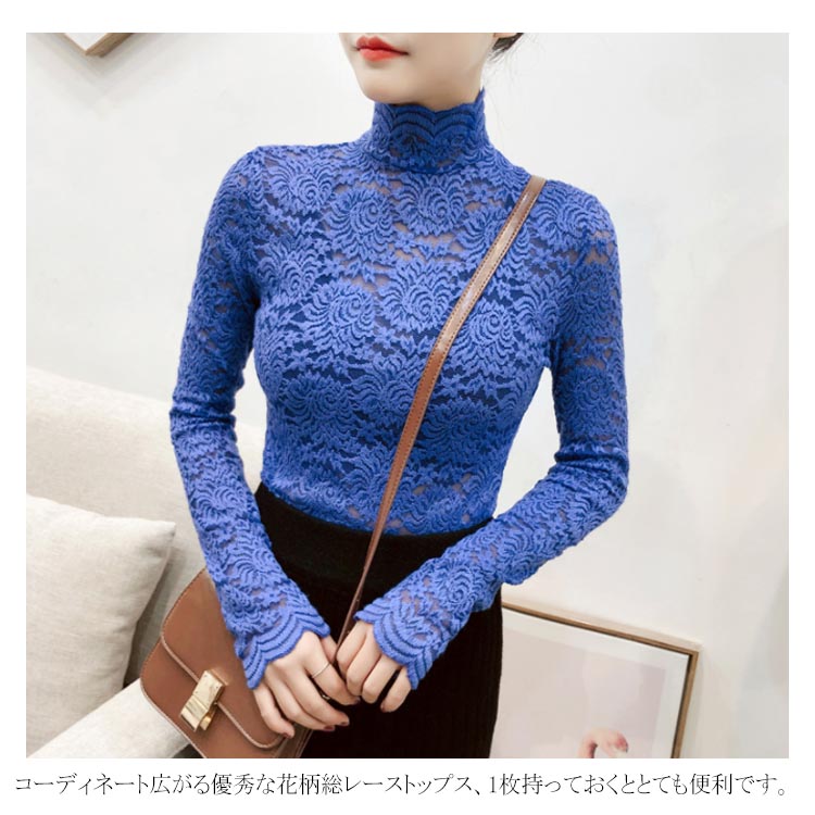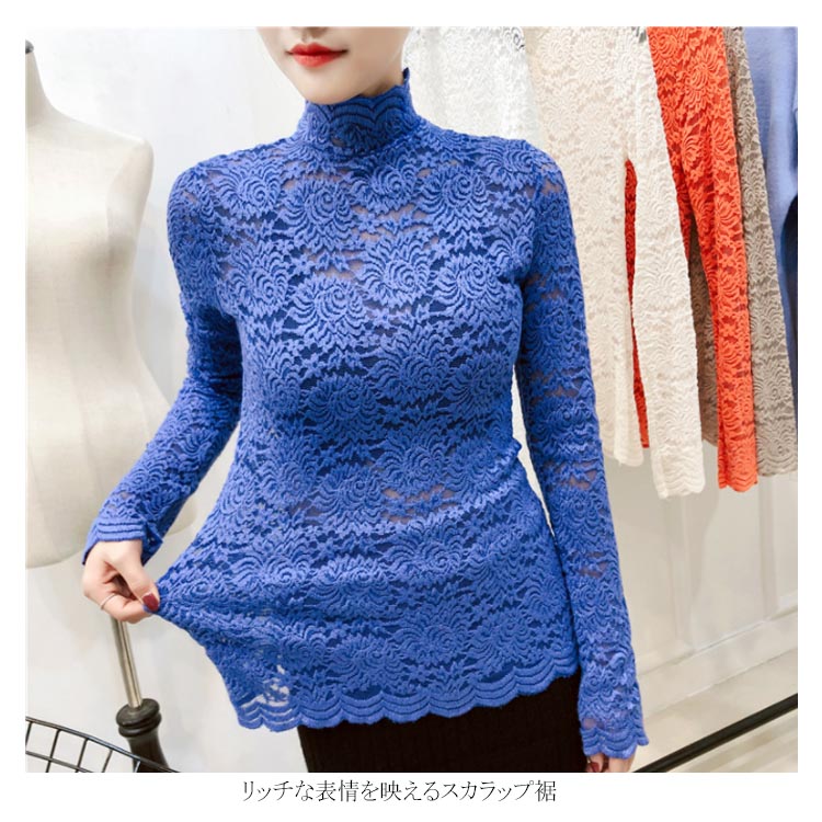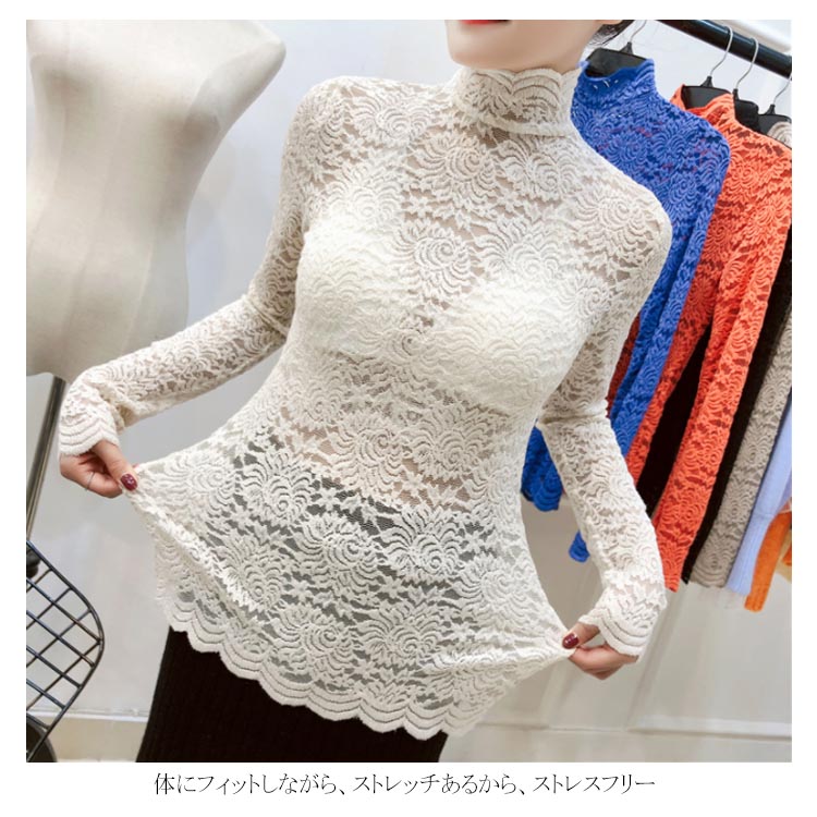 送料無料 総レース トップス 長袖 透かし 花柄レース カットソー レディース ハイネック 透け感 フラワーレース 刺繍ブラウス ストレッチ 伸縮性 透かしレース インナー レイヤード シースル スカラップ 花柄 ベーシック セクシー スリム 20代 30代 40代 50代 秋 冬 春