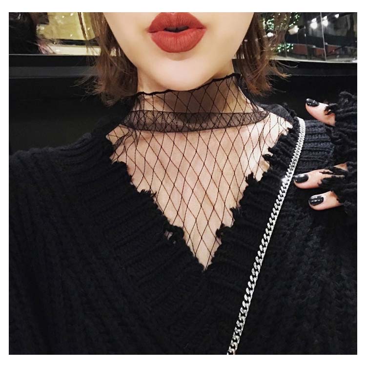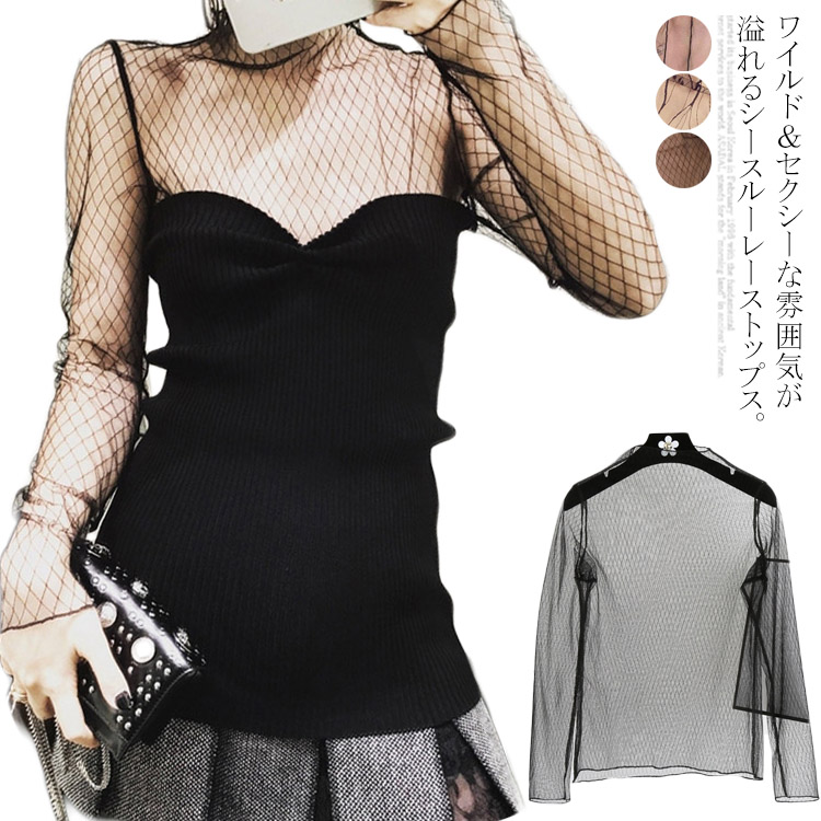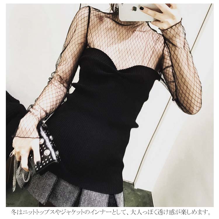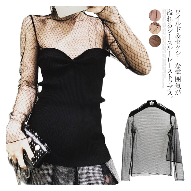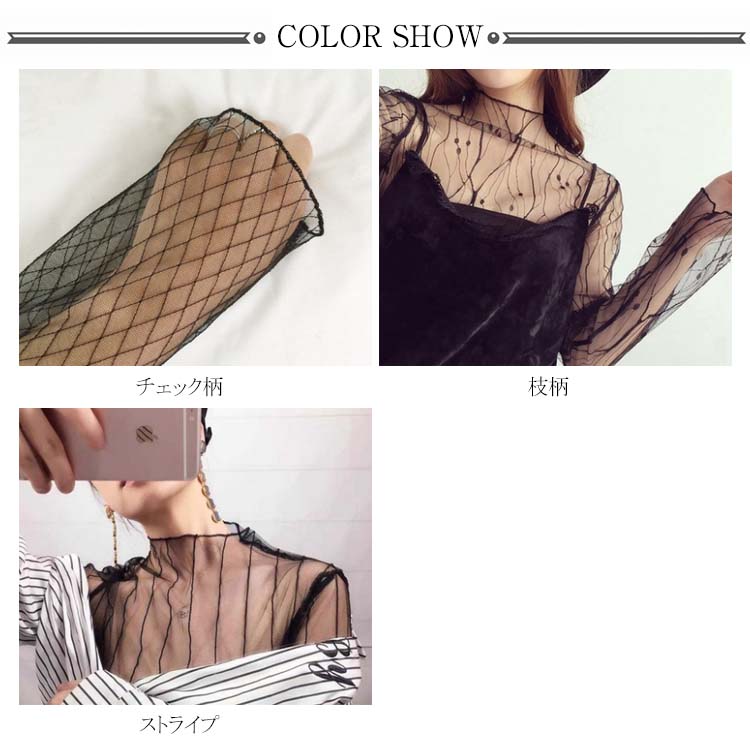 送料無料 シースルーレース トップス セクシー 長袖 透かし 肌見せ レディース レーストップス チュールレースカットソー インナー ハイネック レースブラウス フェミニン チュール シースルー 透け感 オールシーズン 春 夏 秋 冬 プチプラ