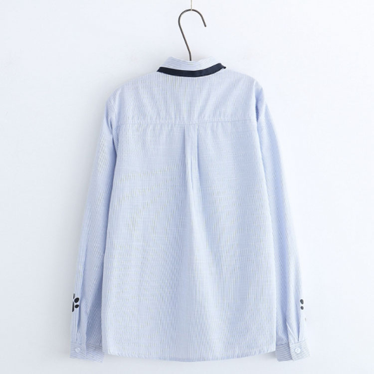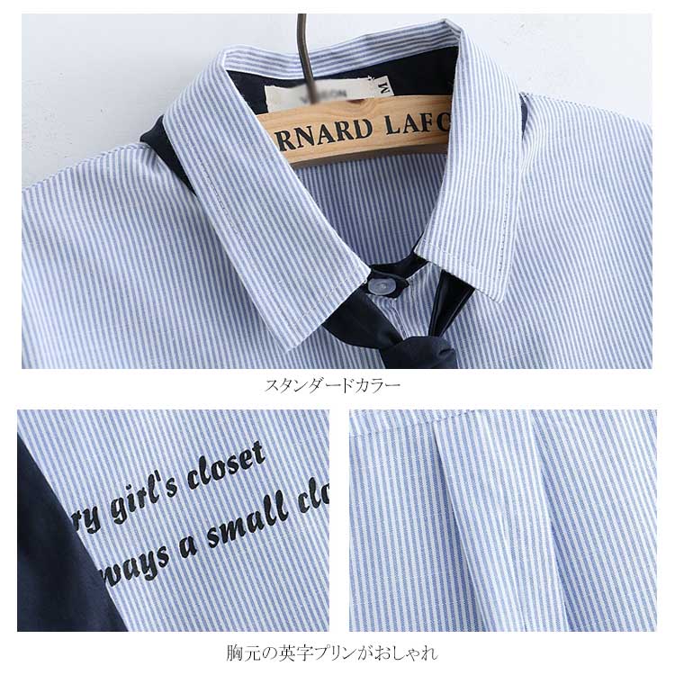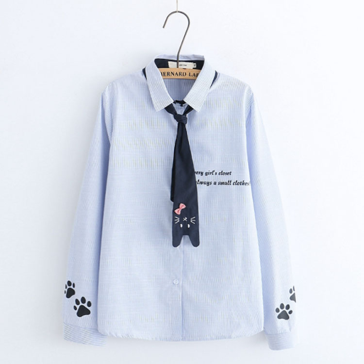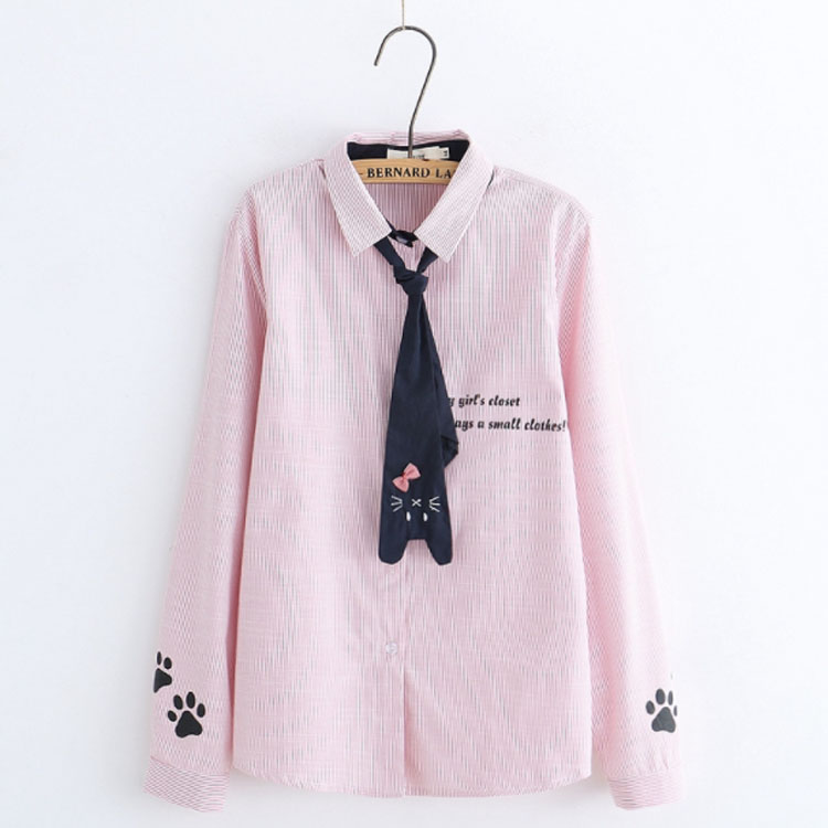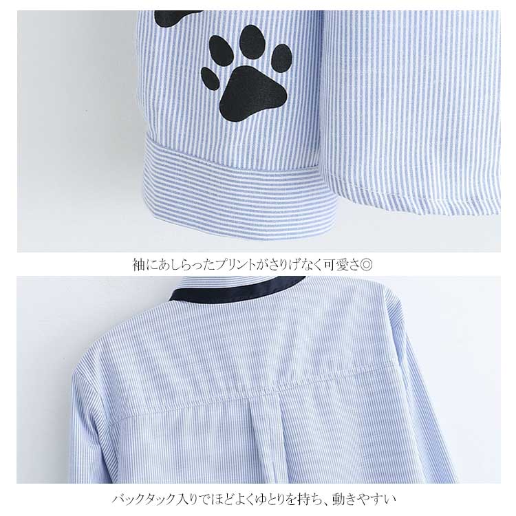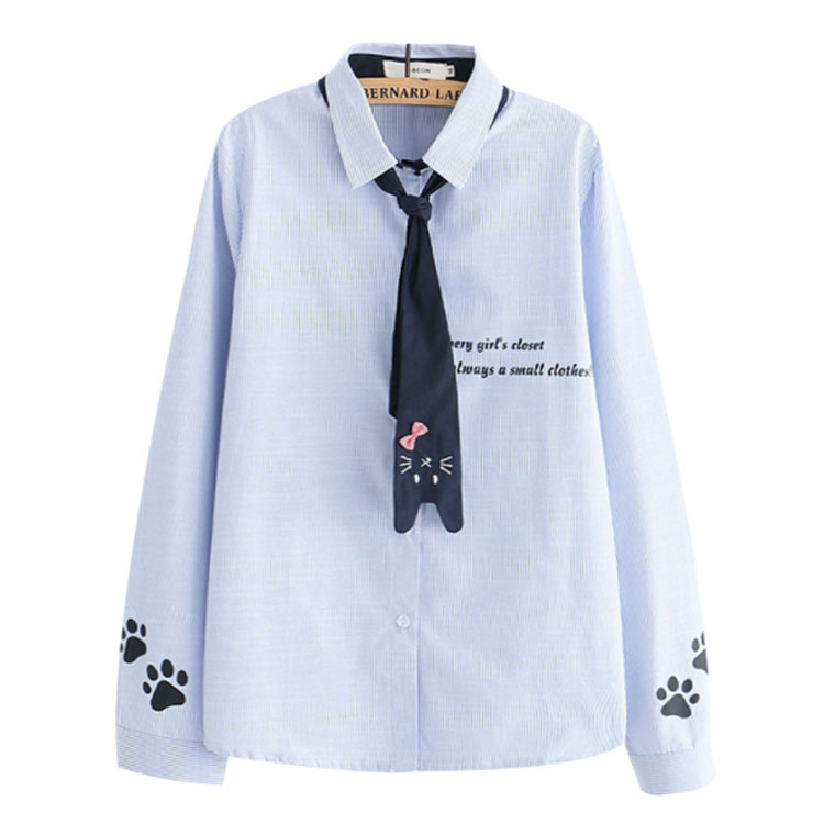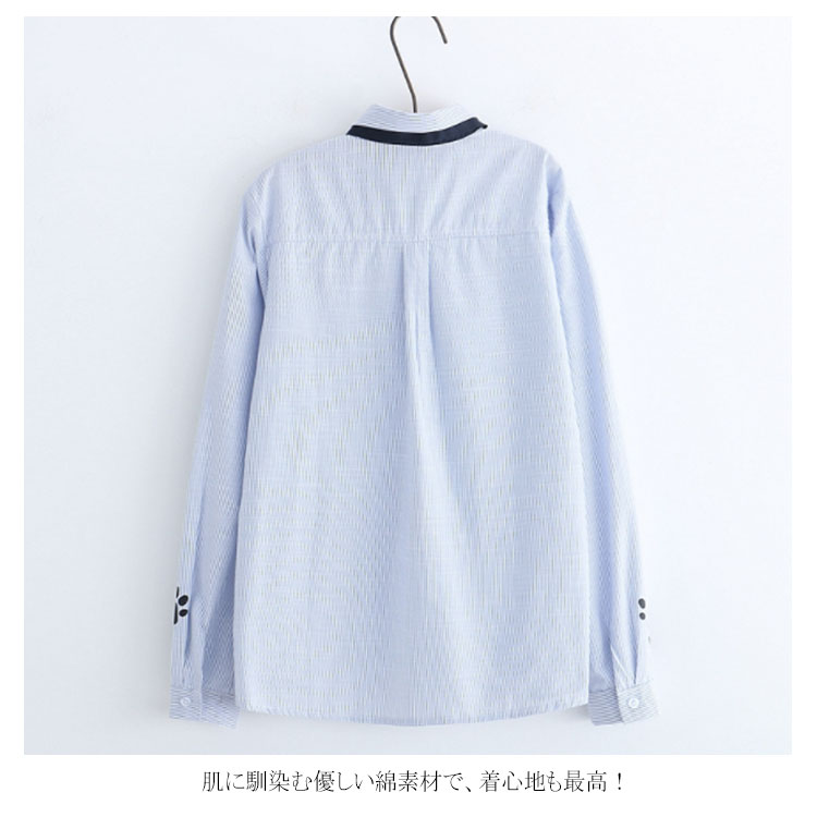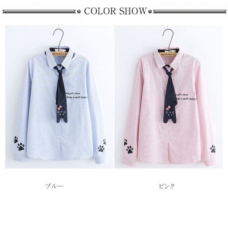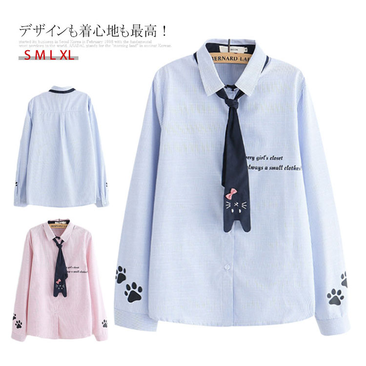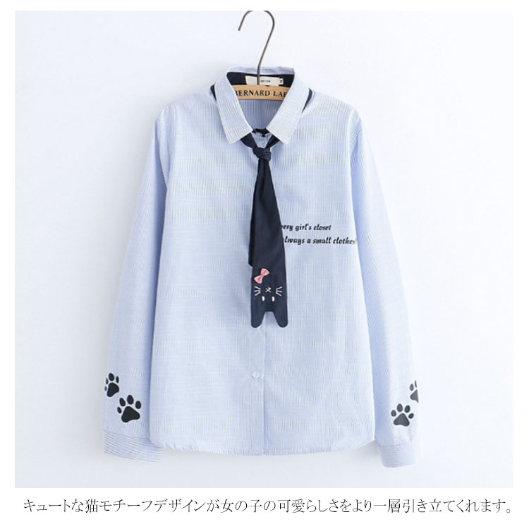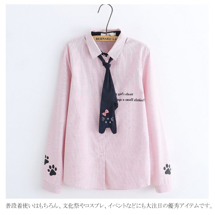ネコ柄刺繍ネクタイ付き! シャツ ブラウス 猫柄 プリント 刺繍 レディース 可愛い シャツブラウス 女の子 ジュニア おしゃれ 森ガール 長袖 ストライプ ブラウス リボン 中学生 高校生 コスチューム コスプレ 学園祭 文化祭