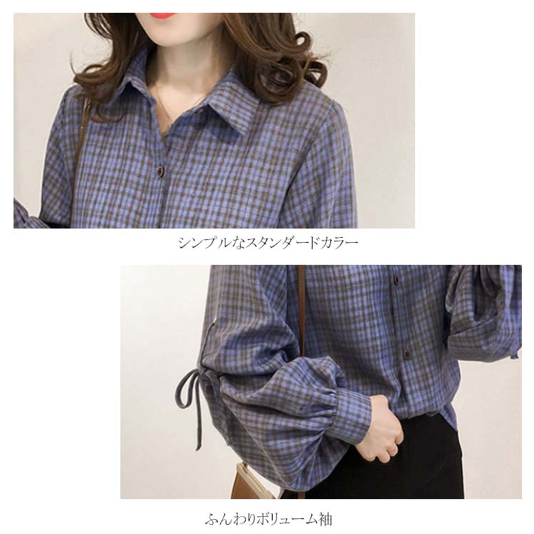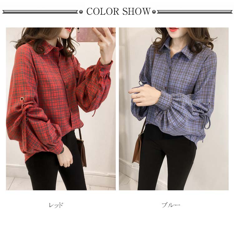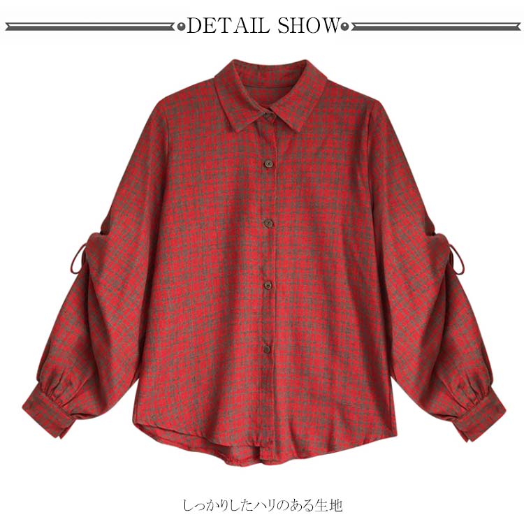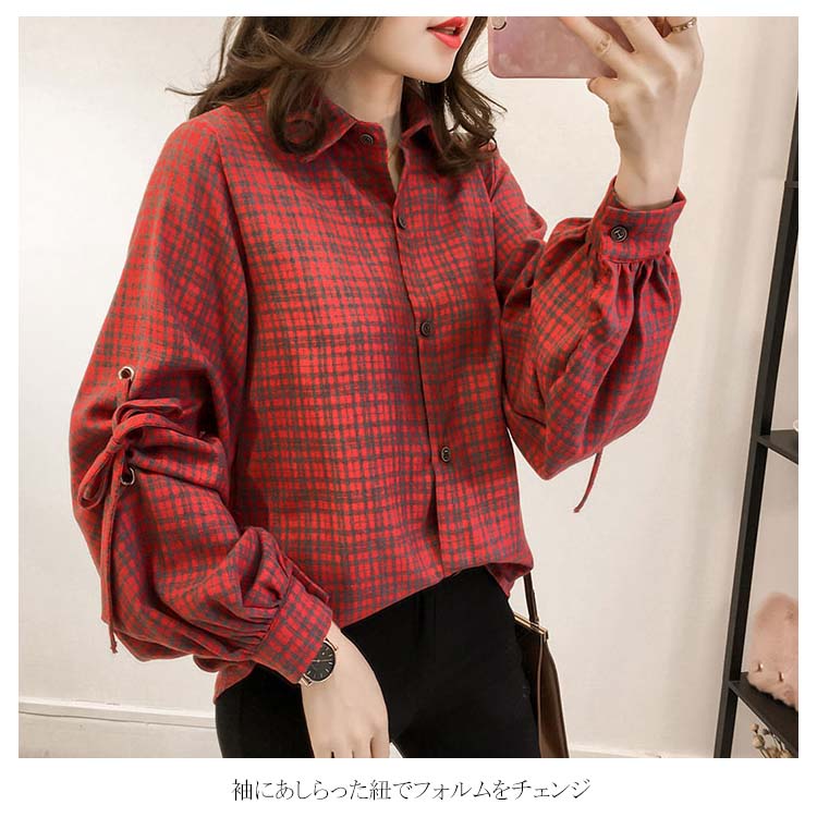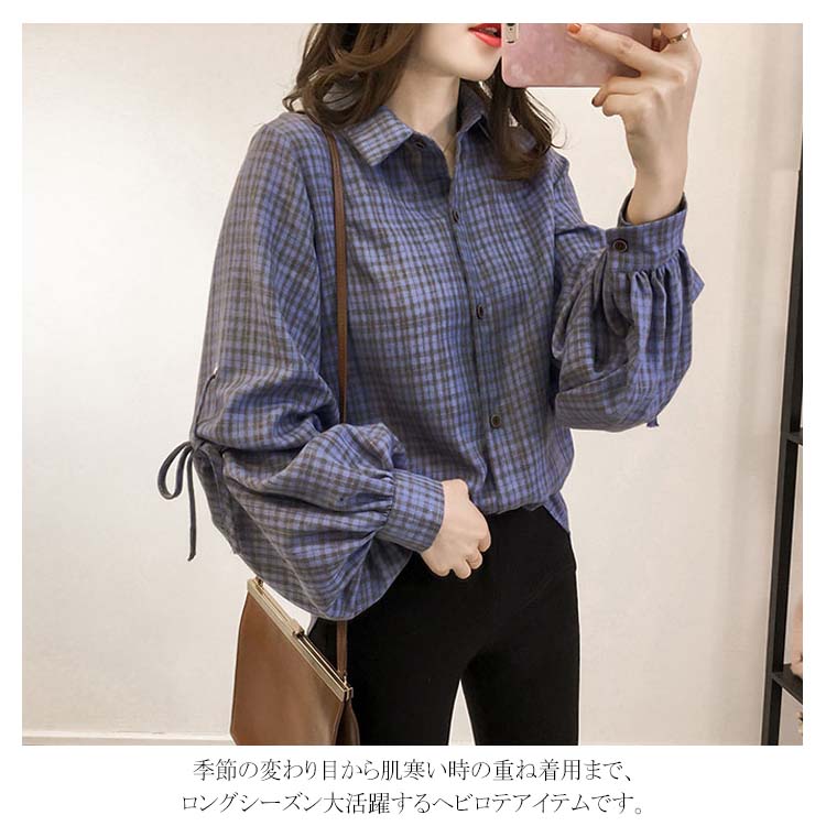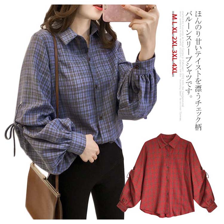 ふんわりボリュームが可愛い♪ チェック柄 ブラウス シャツ シャツブラウス レディース 長袖 バルーンスリーブ オシャレ リボン 可愛い 厚手 大きいサイズ 大人 学生 通学 通勤 お出かけ デート トレンド おしゃれ カジュアル キレイめ