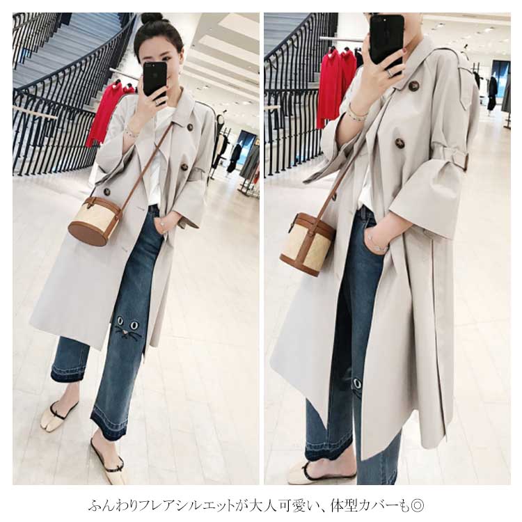 トレンチコート ロングコート レディース フレア 7分袖 アウター ロング丈 コート 大きいサイズ スプリングコート 膝丈 フレア ベルト付き 上品 可愛い オシャレ ライトアウター カジュアル フォーマル 結婚式 二次会 入卒式 卒園式