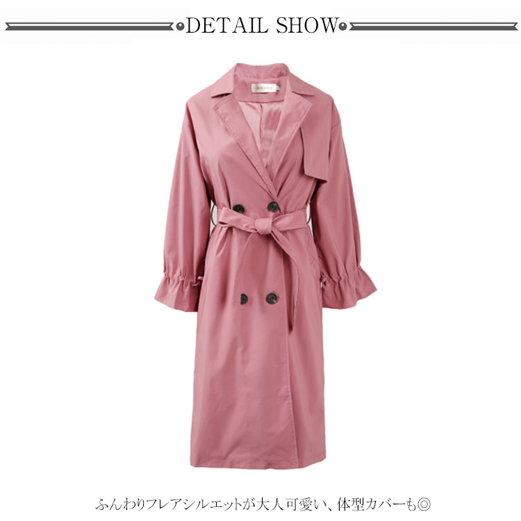 | 女らしさを溢れるトレンチコート。 かたいイメージされがちのトレンチコートコートが違った印象付け♪ 袖紐でキュット締め付けて、ボリュームのあるパフスリーブを作り出し、大人女性の可愛さ&フェミニンさを演出。 ハリのある手触り優しい素材を使用し、上品で抜けた大人女性らしさを演出するしてくれます。 バランスのよい絶妙な丈感はボトムスを選ばず、どんなアイテムにも好相性◎ ON/OFF問わず、これからの季節大活躍するから重宝します。 | |