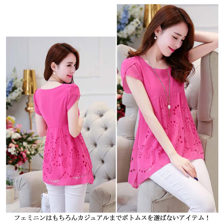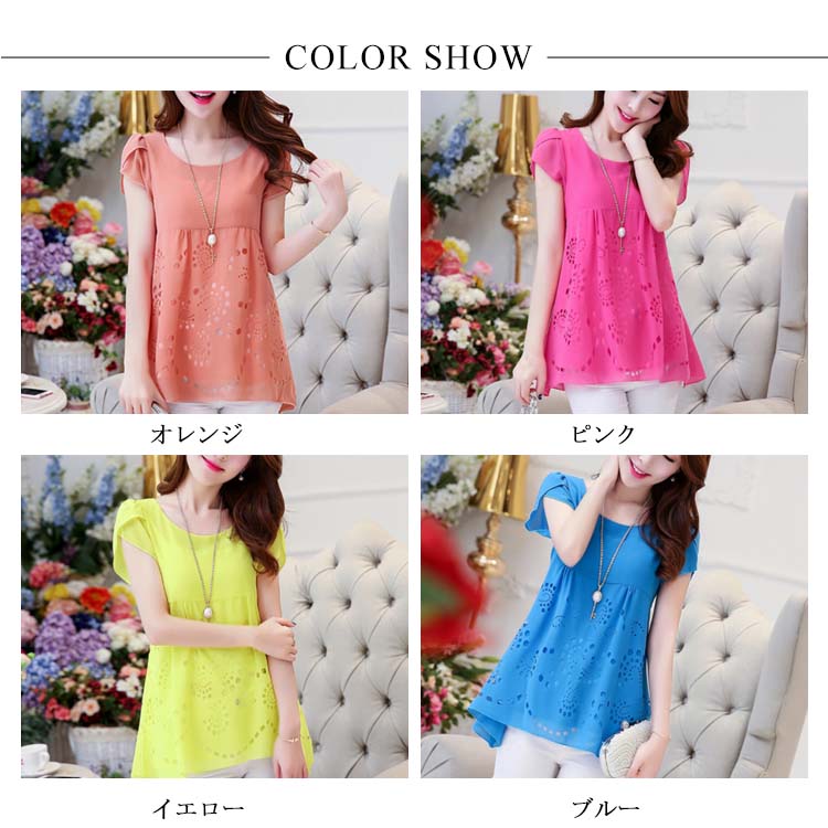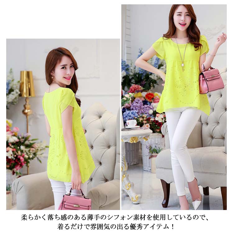 フレア袖 ブラウス シフォン ブラウス トップス レディース 半袖 チュニック シフォンブラウス トップス ブラウス フェミニン