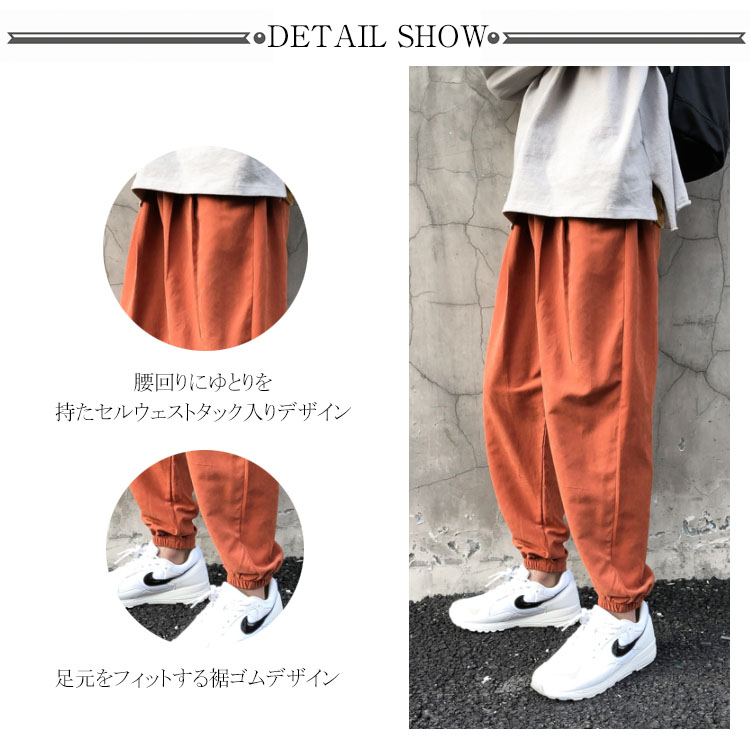 | 季節感溢れるスエードタッチパンツ。 トレンドのルーズなシルエットがおしゃれ決まり! 5色展開!ベーシックカラーから差し色にピッタリのカラーまで、自分好みの色が必見! 下半身を包み込みビッグシルエットが、体型を選ばない、ラフな着こなしを叶っちゃう。 これからの季節大活躍するから重宝します。 | |