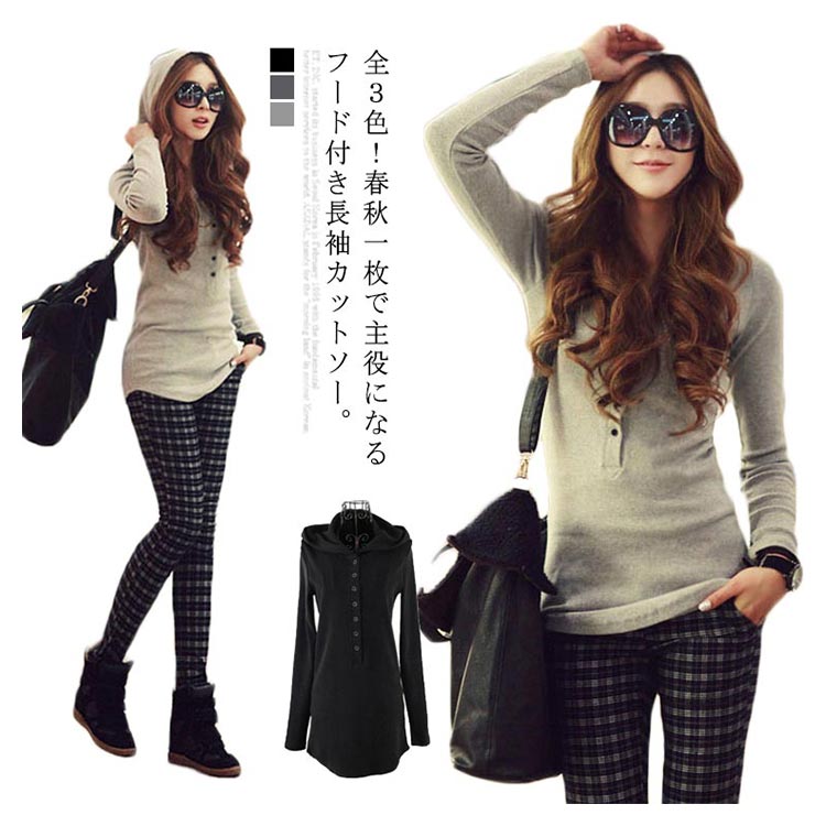 | 全3色!春秋一枚で主役になるフード付き長袖カットソー。 フロントボタン半開きデザインを採用しております。 体に程度よくフィットし、ボディラインが強調できます。 お尻ライン隠れる丈感もバランス良い。 シンプル無地だから合わせやすく、お手元のボトムスと好相性。 | |