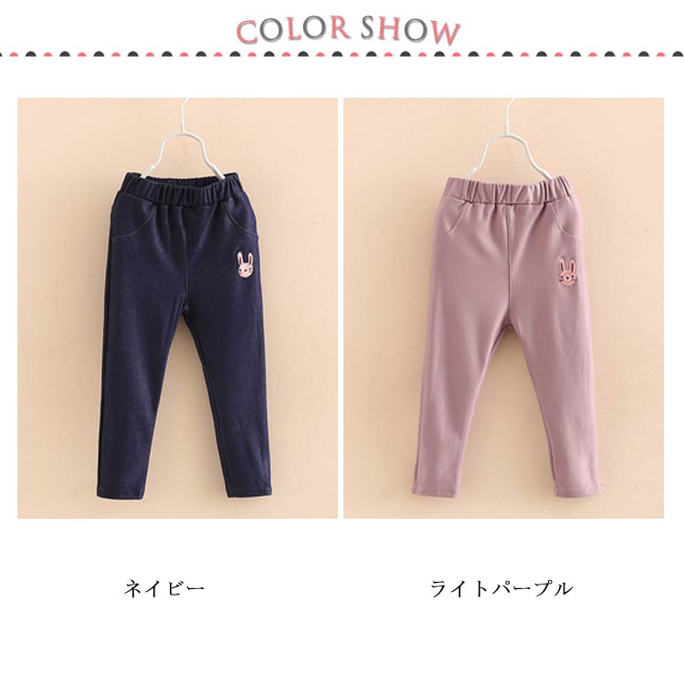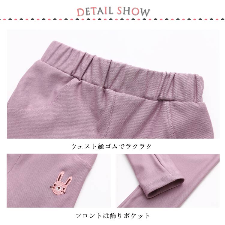 | 柔らかで伸縮性のある女の子スキニーパンツ。 繊細なうさぎ刺繍が可愛さをプラス。 無地シンプルデザインなので、デイリー使いにぴったりな楽チンストレッチパンツ。 オシャレなデニム風デザイン、トップスが選ばず、着回し力抜群。 | |