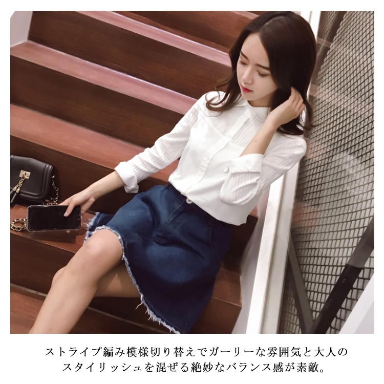 | 甘さ控えめの大人ホワイトシャツ。 ストライプ編み模様切り替えでガーリーな雰囲気と大人のスタイリッシュを混ぜる絶妙なバランス感が素敵。 レギュラーカラーと丸衿の2タイプをご用意し、カジュアルスタイルからキレイめスタイルまで活躍してくれます。 しっとりした生地と肌触りのの良い上品な1枚。 | |