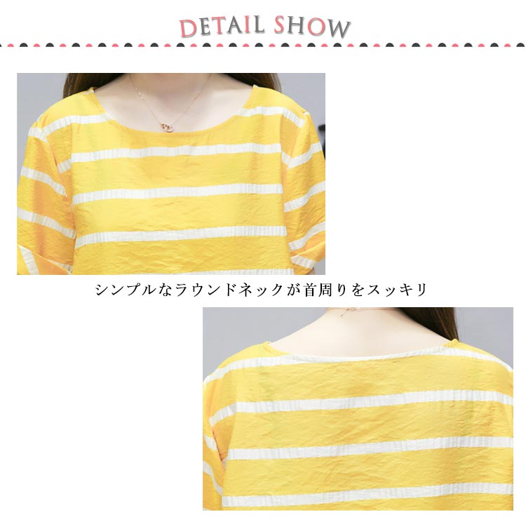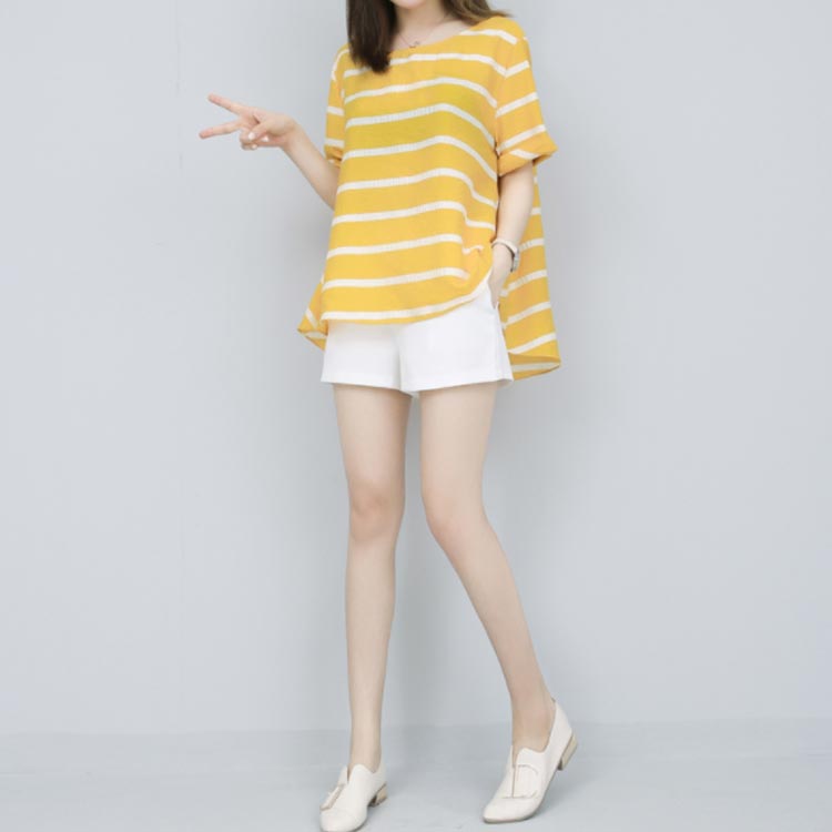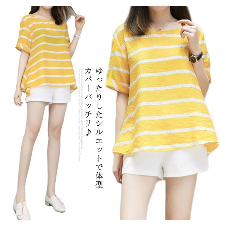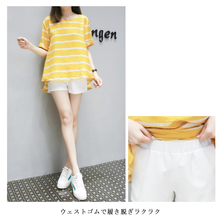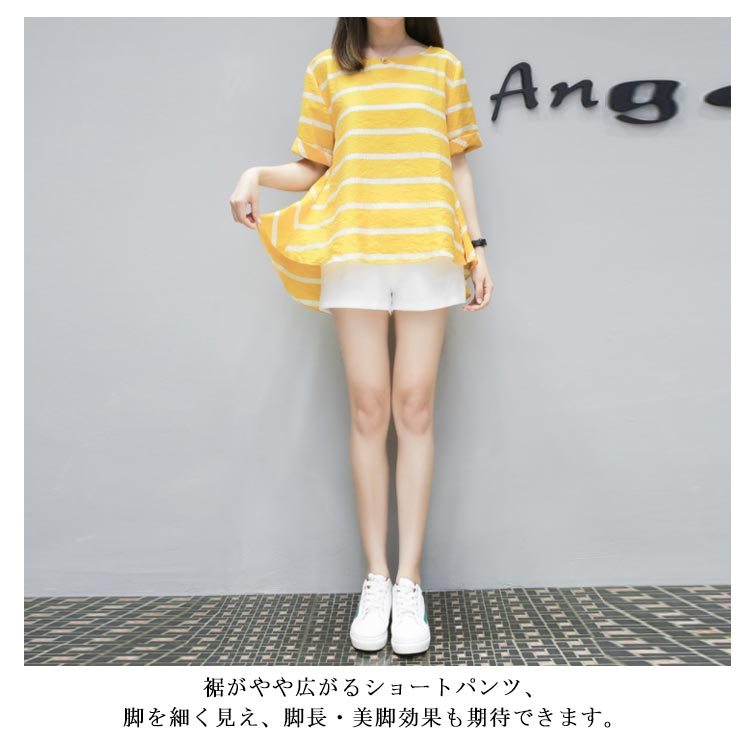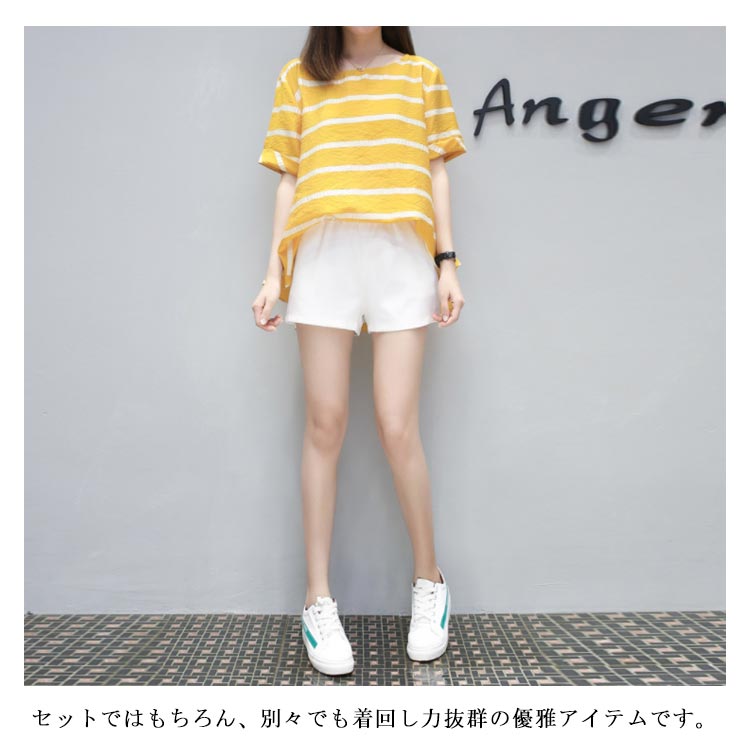 半袖ブラウス+ショートパンツ 2点セット 送料無料 レディース ボーダー柄 ゆったり 体型カバー 夏 ショパン ウェストゴム 涼しい セットアップ