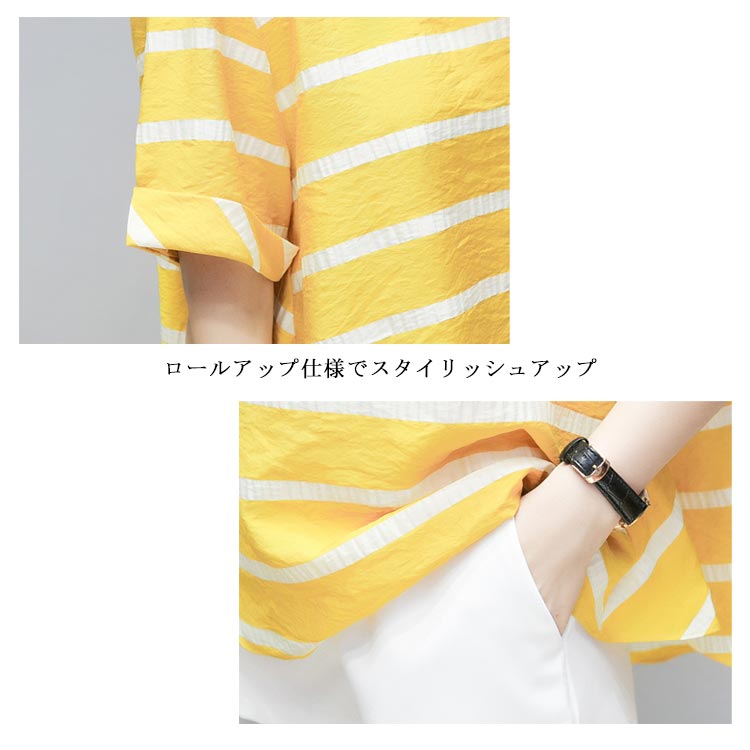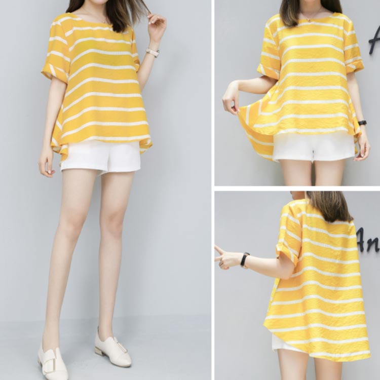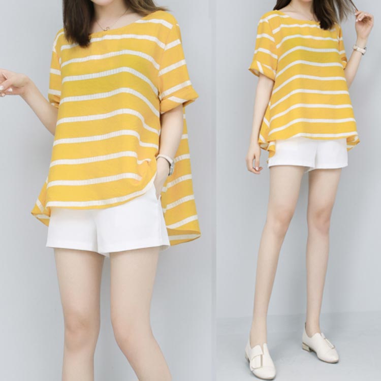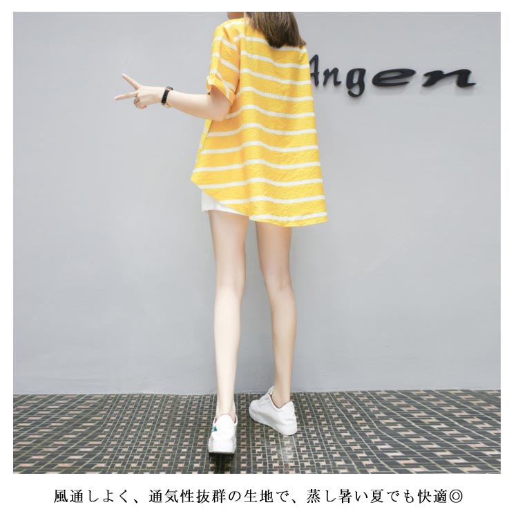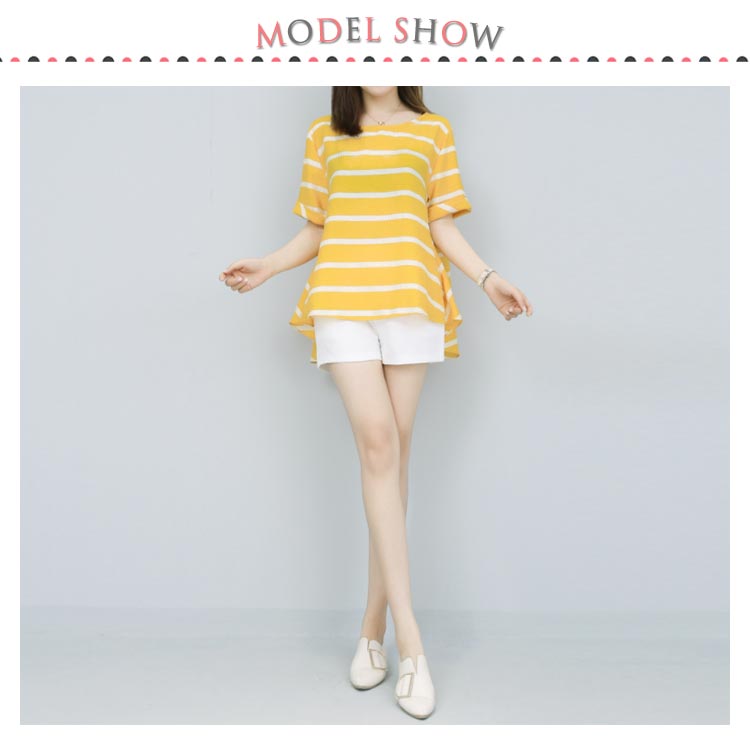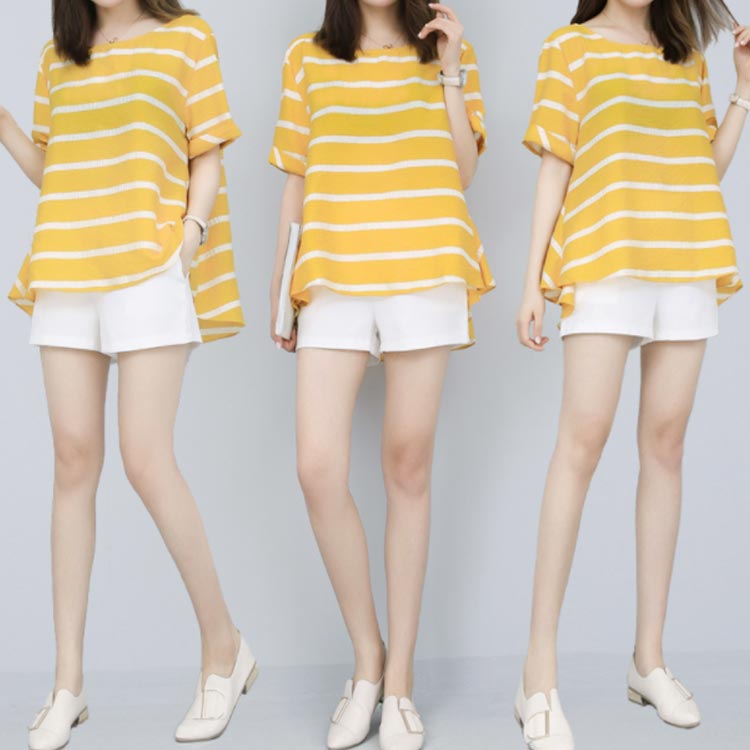 半袖ブラウス+ショートパンツ 2点セット 送料無料 レディース ボーダー柄 ゆったり 体型カバー 夏 ショパン ウェストゴム 涼しい セットアップ
