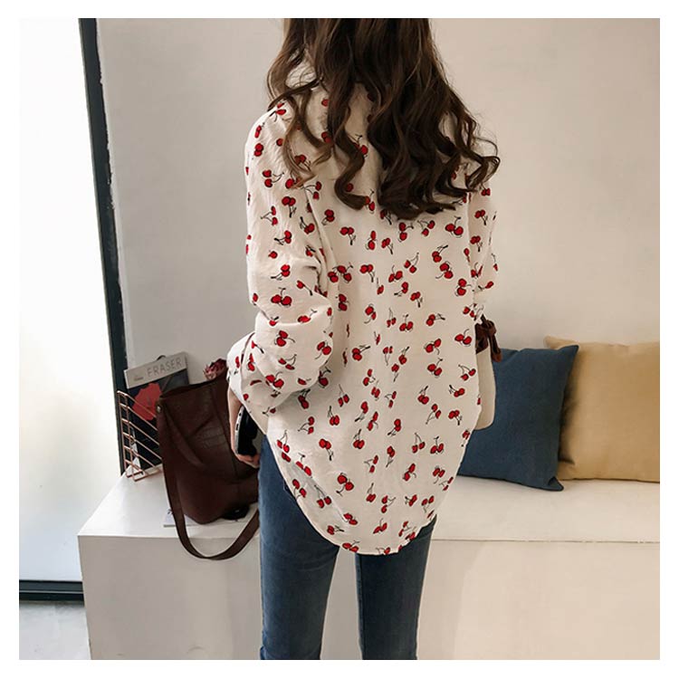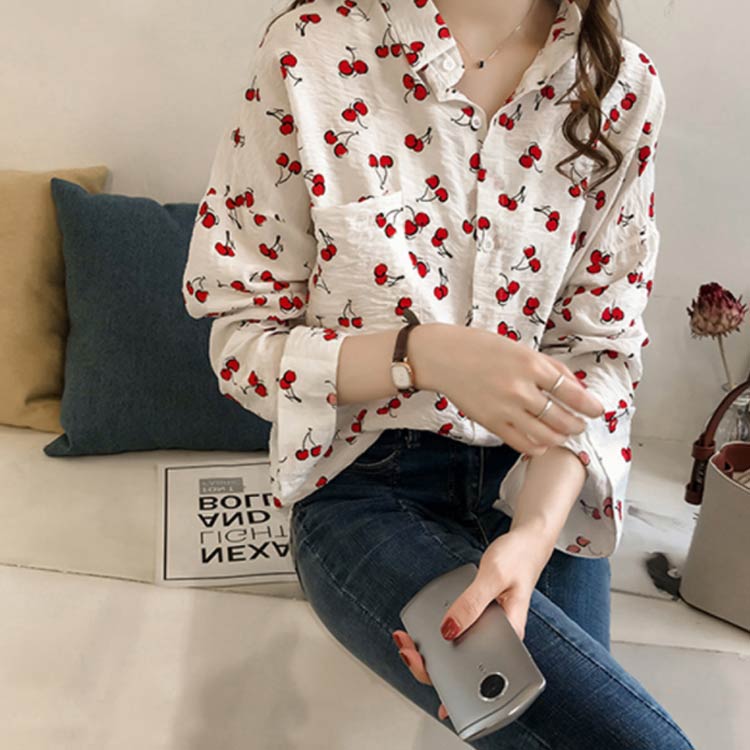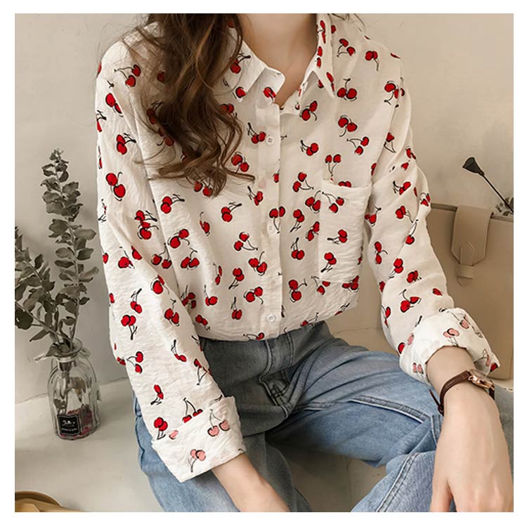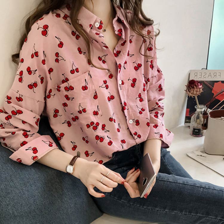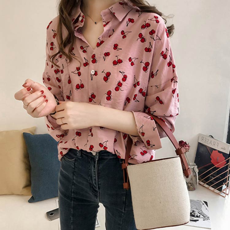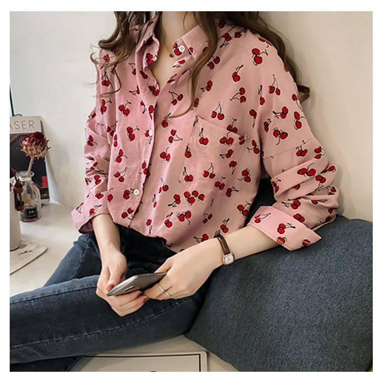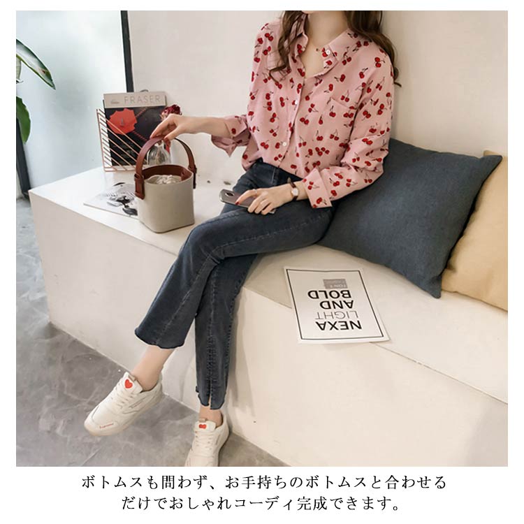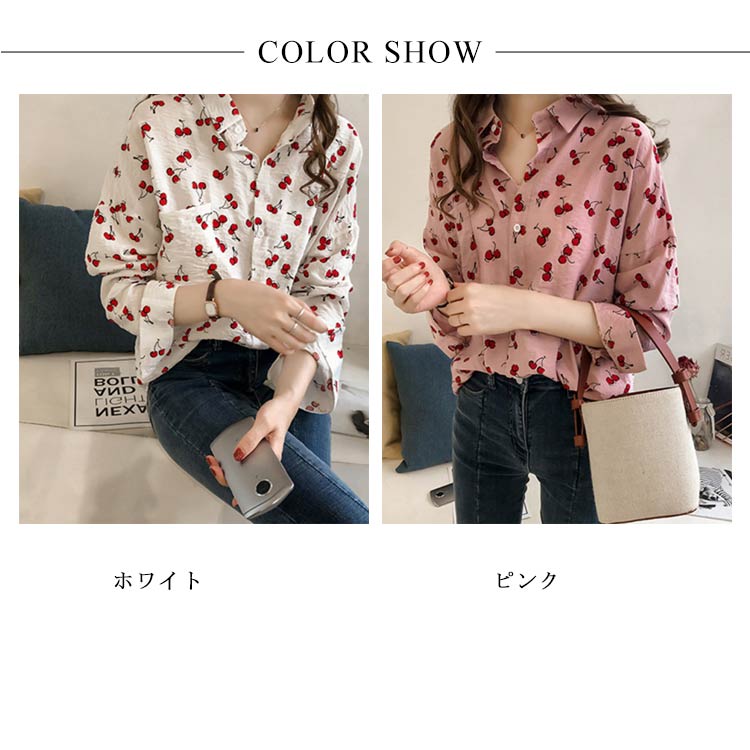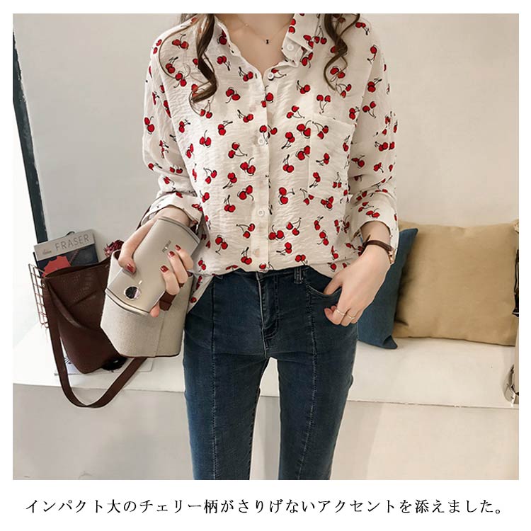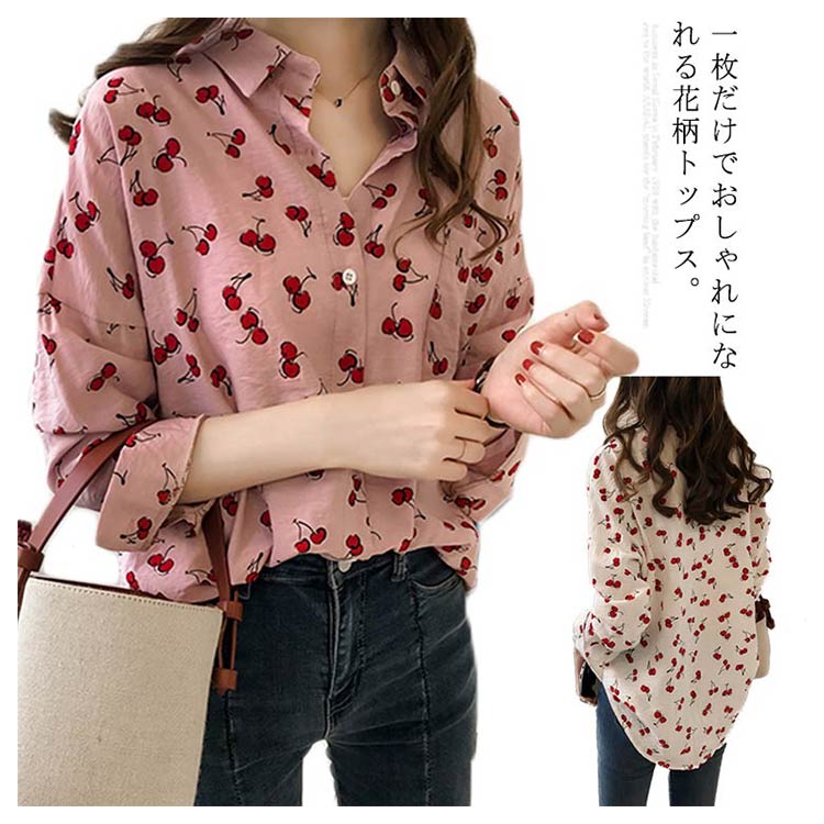 全2色×4サイズ!シャツ ブラウス レディース チェリー柄シャツ チェリー柄ブラウス 総柄 トップス ドロップスリーブ 長袖 カジュアルシャツ おしゃれ 可愛い