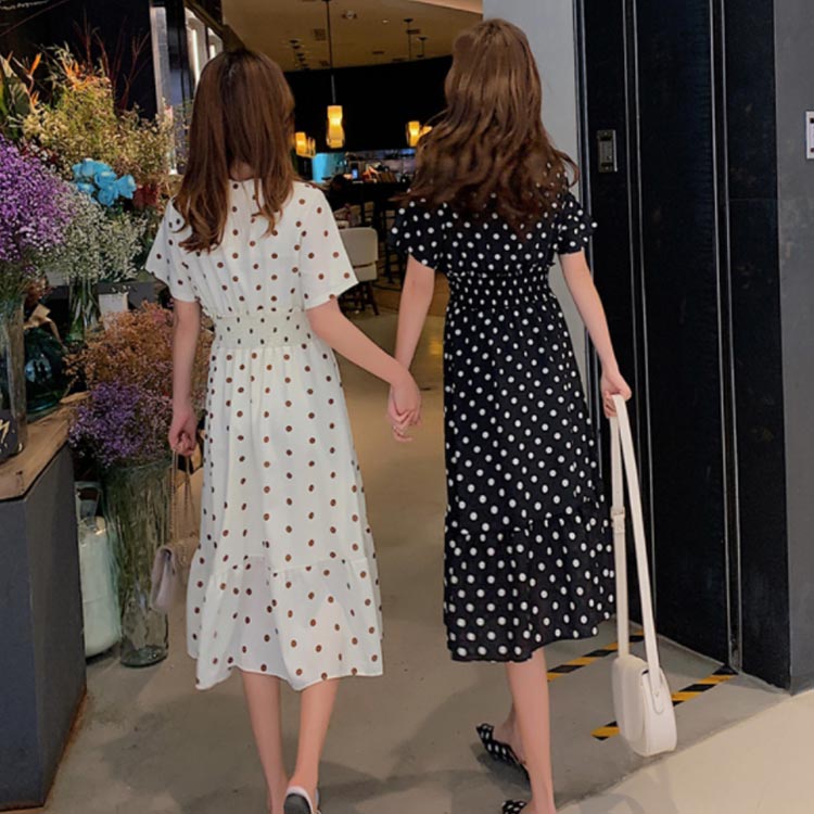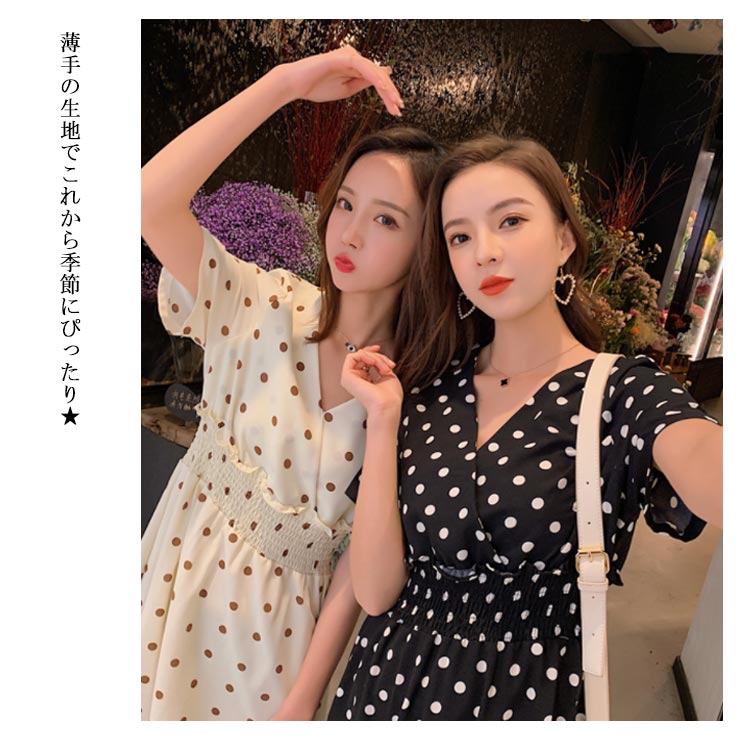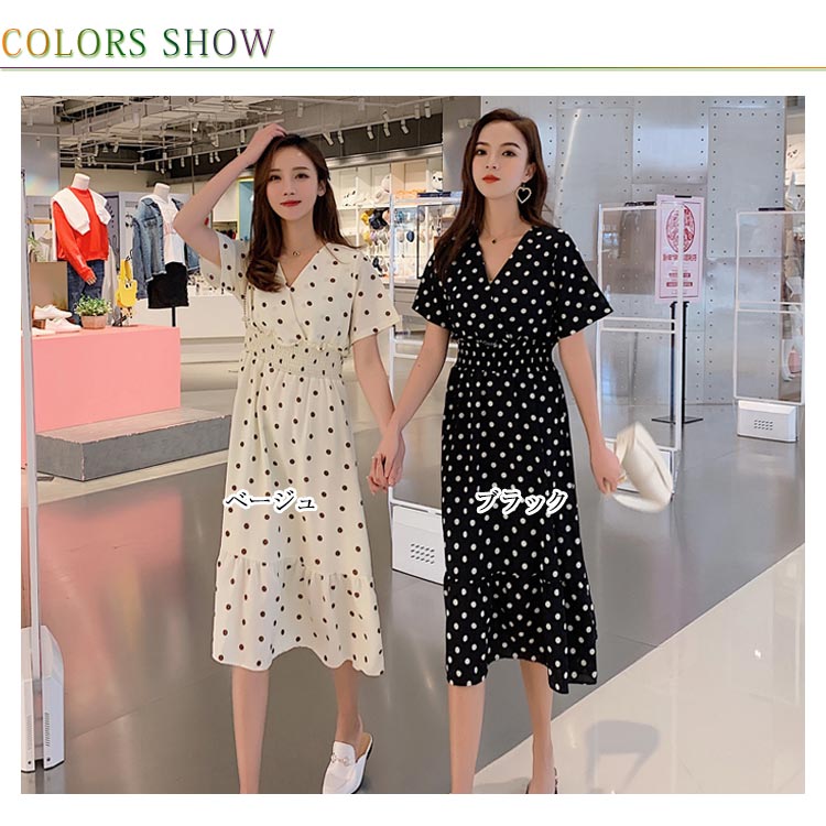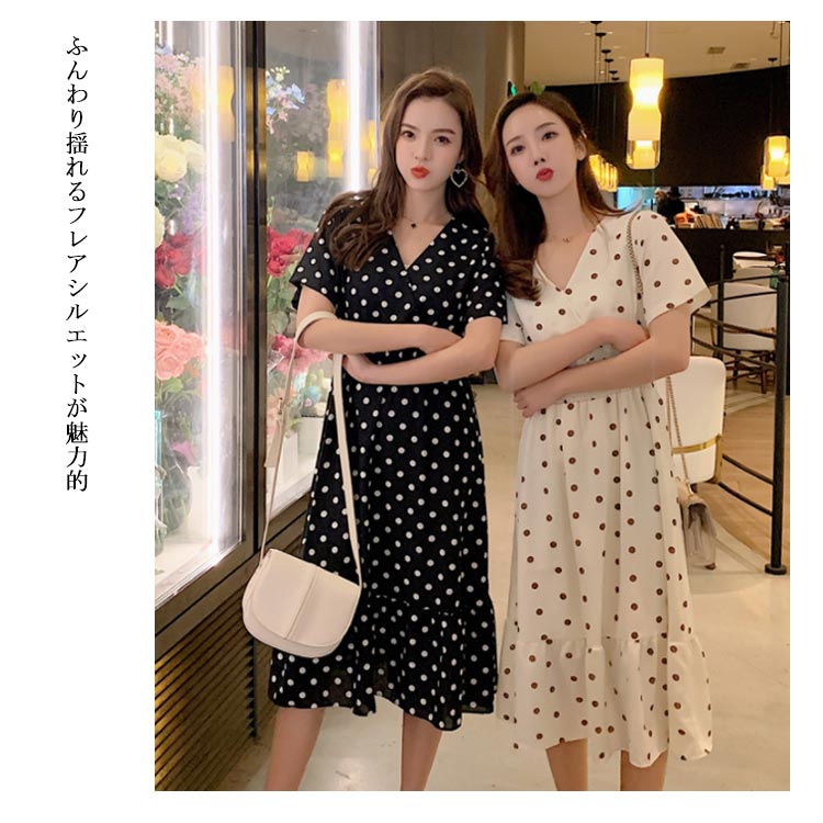 フレアワンピース レディース シフォンワンピース ドット柄 水玉柄 半袖 ロングワンピース ミモレワンピース ミモレ丈 ロング丈 シフォン Vネック フレア ふんわり ゆったり ウエストゴム シャーリング 薄手 お洒落 夏新作