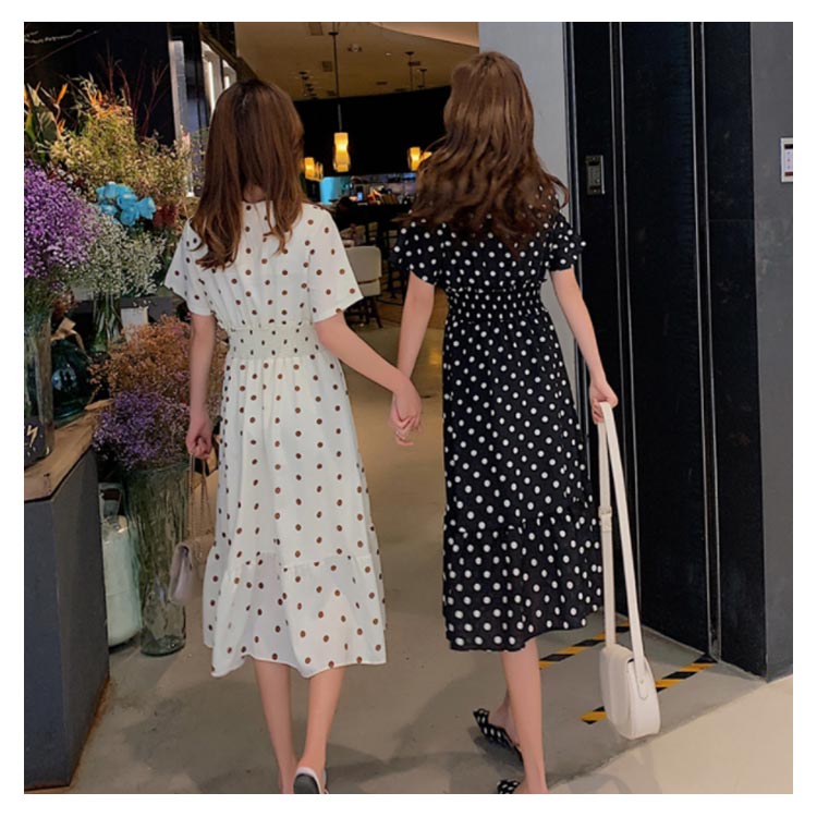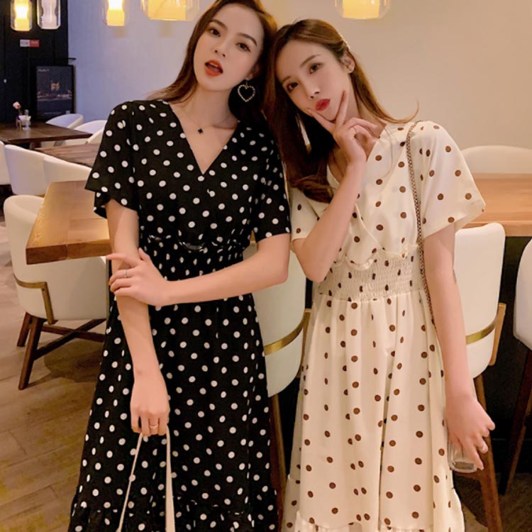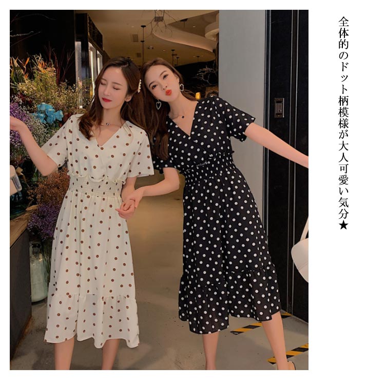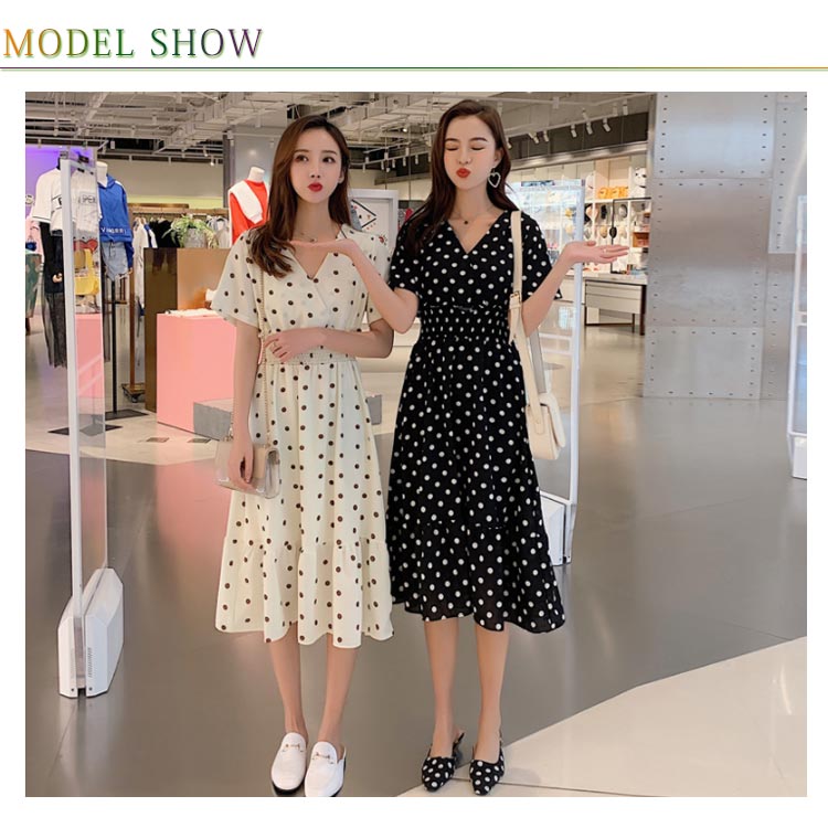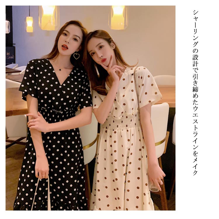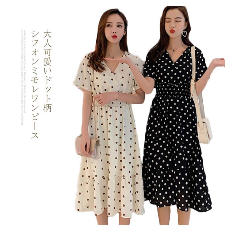 | 大人可愛いドット柄シフォンミモレワンピース デコルテをきれいに魅せるVネック ふんわり揺れるフレアシルエットが魅力的 シャーリングの設計で引き締めたウエストラインをメイク | |