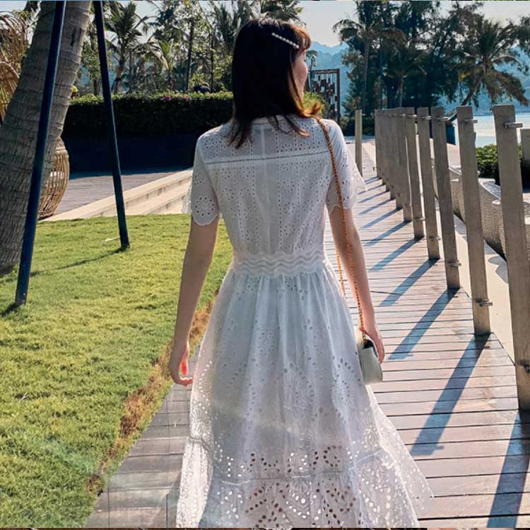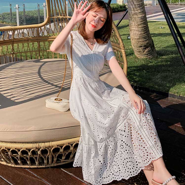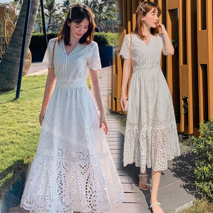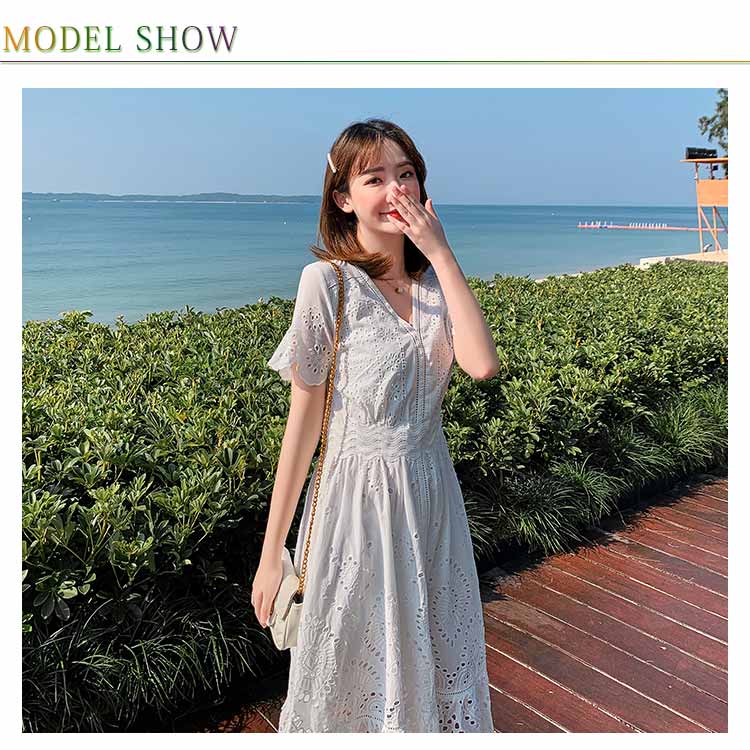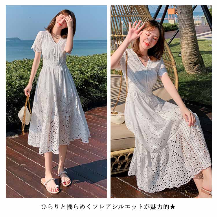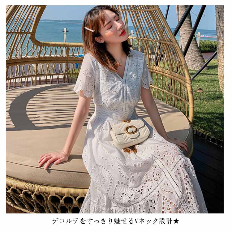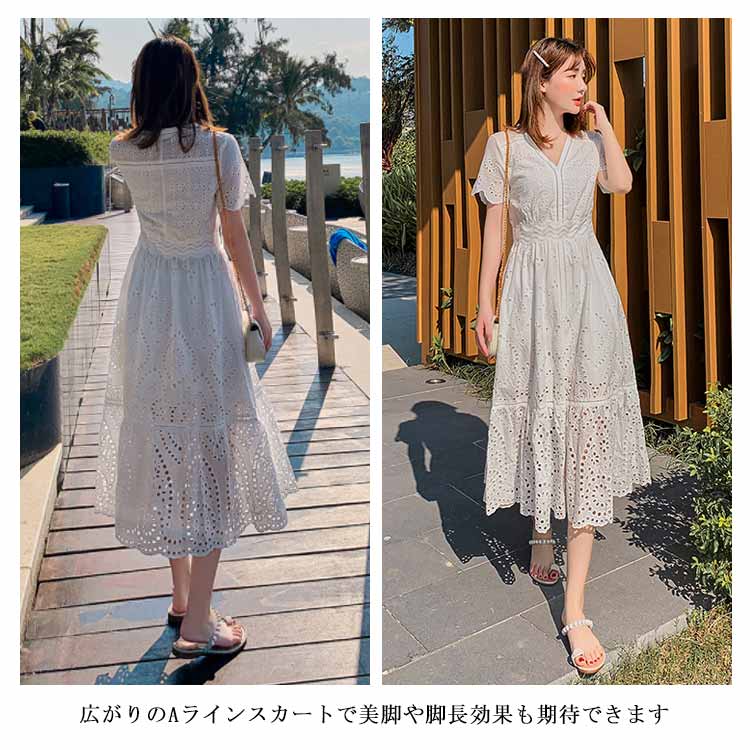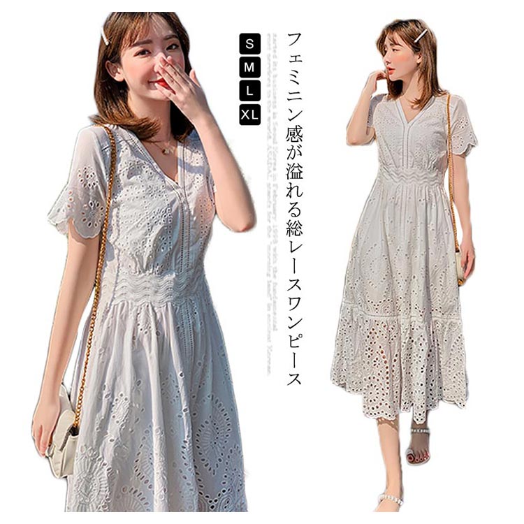 ワンピース レディース 総レースワンピース ロングワンピース ミモレワンピース マキシワンピース 半袖 透かしレース Vネック ハイウエスト 裏地付き キレイめ お洒落 大人可愛い フェミニン こなれ感 夏物 夏新作