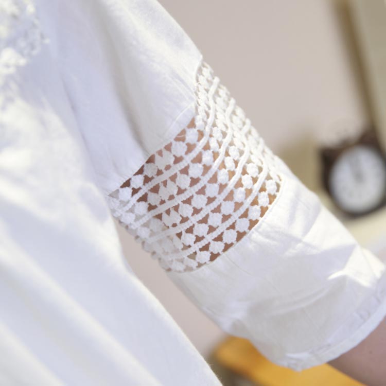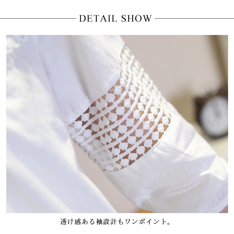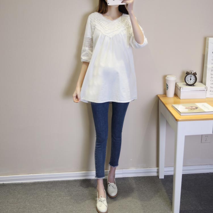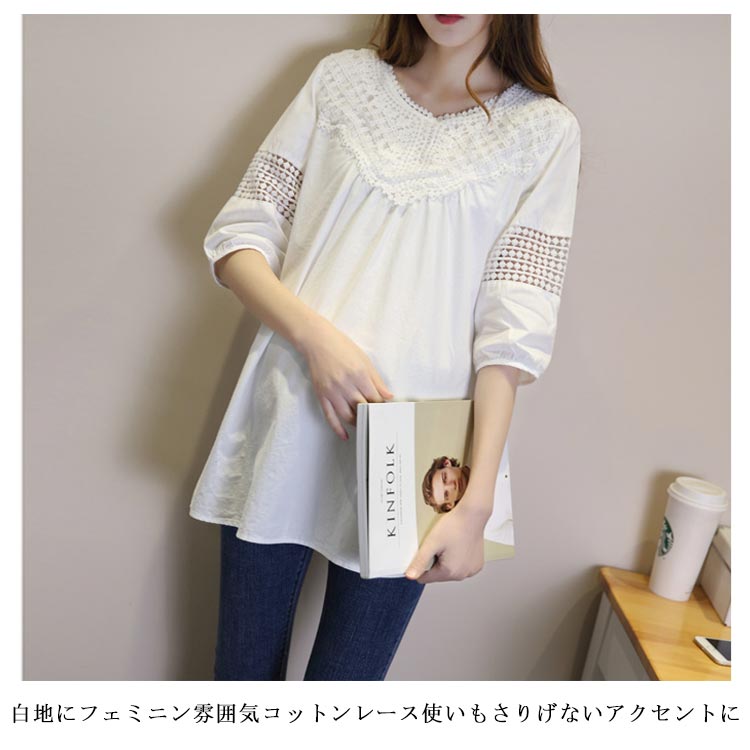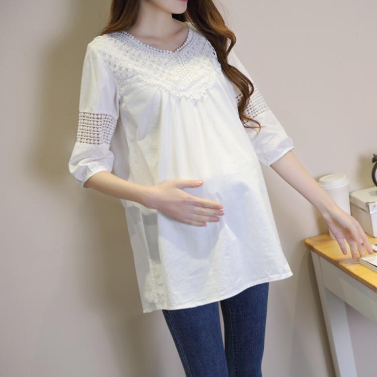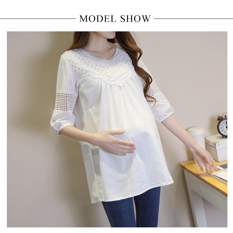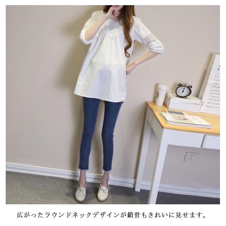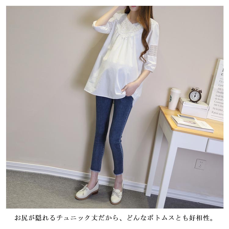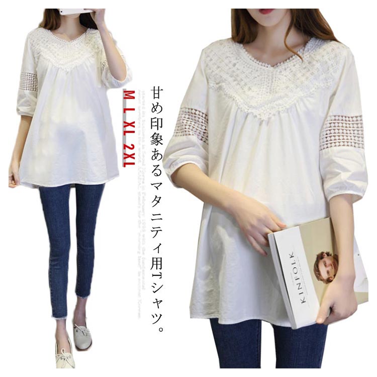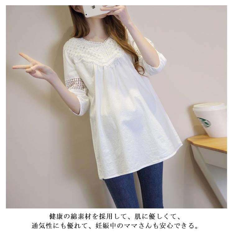 マタニティTシャツ Tシャツ マタニティ服 7分袖 トップス コットン レース 刺繍 透け感 aライン 体型カバー 産前産後兼用 春夏 白 大人可愛い