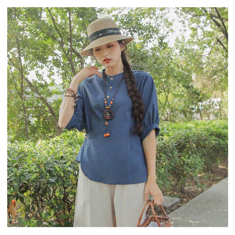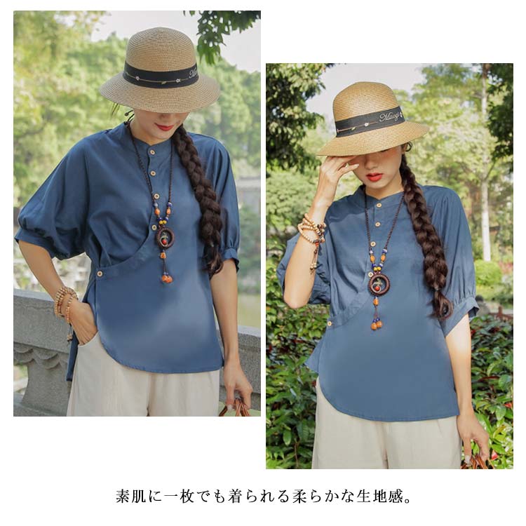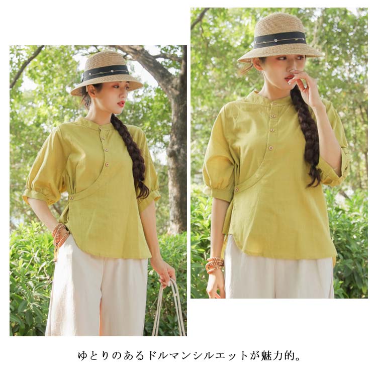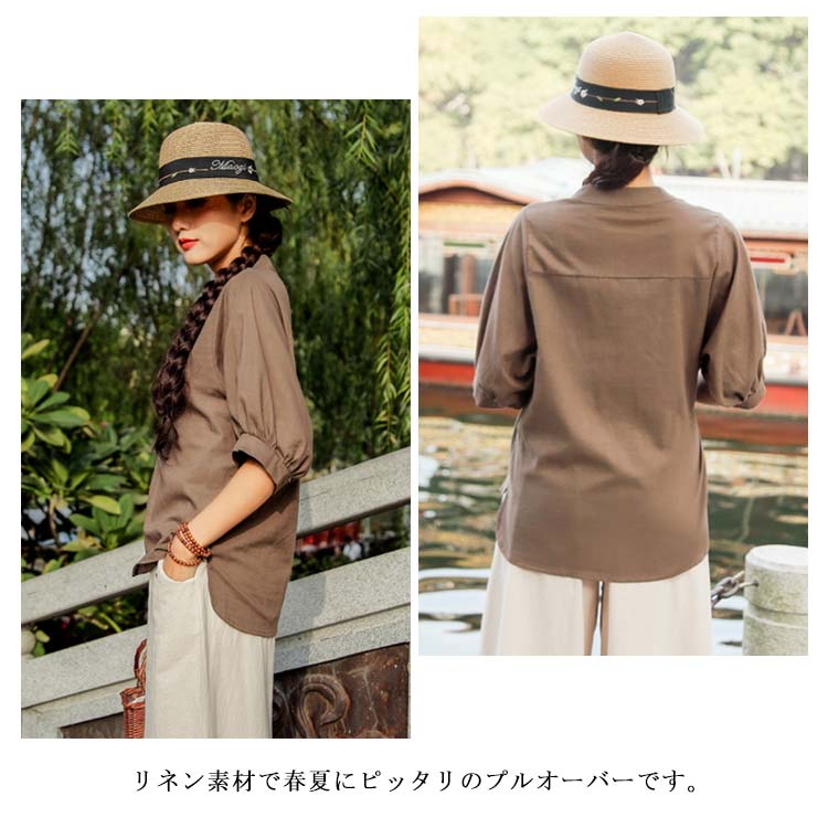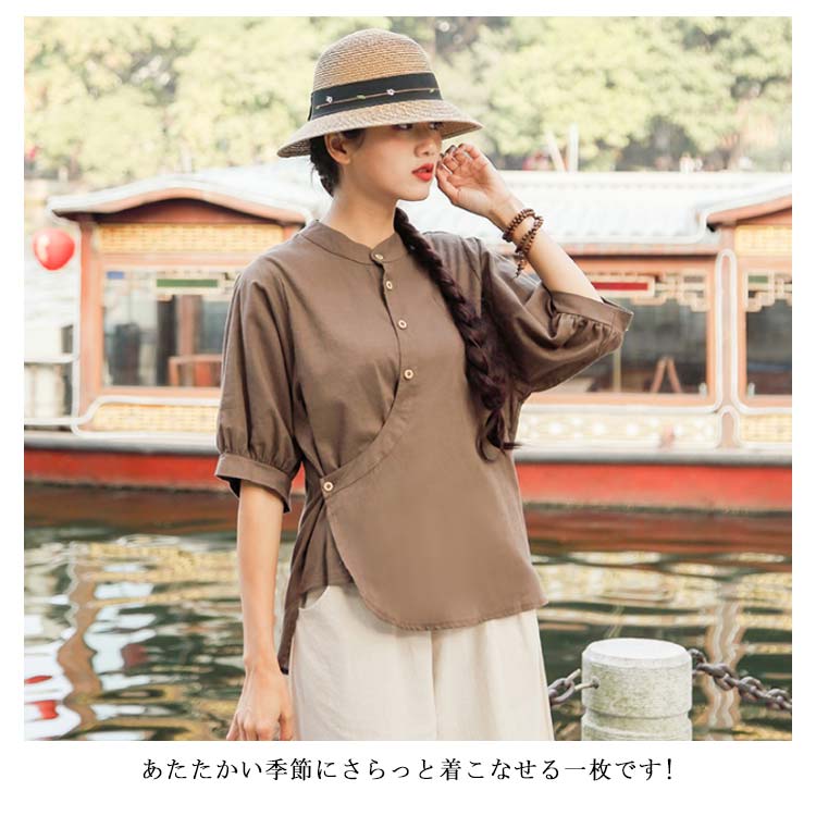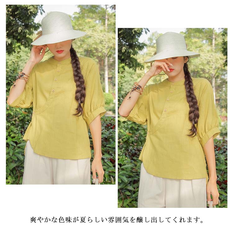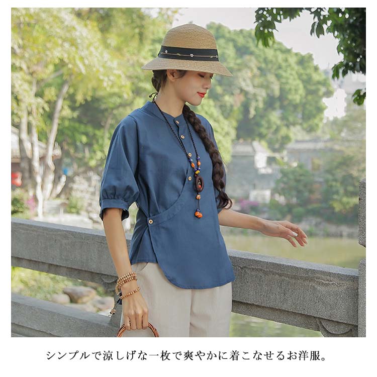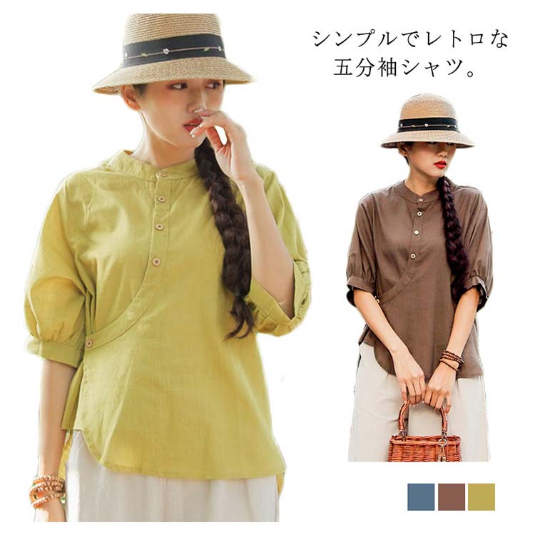リネンシャツ リネン シャツ レディース 綿 麻 綿麻 麻生地 綿麻シャツ 五分袖 ブラウス スタンドカラー エレガント 立ち襟 シンプル 無地 薄手 ゆったり お洒落 カジュアル トップス 夏物 夏新作 送料無料