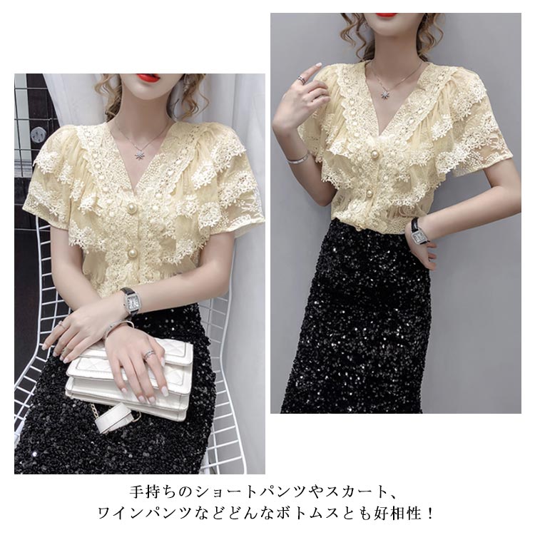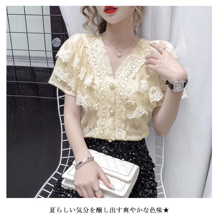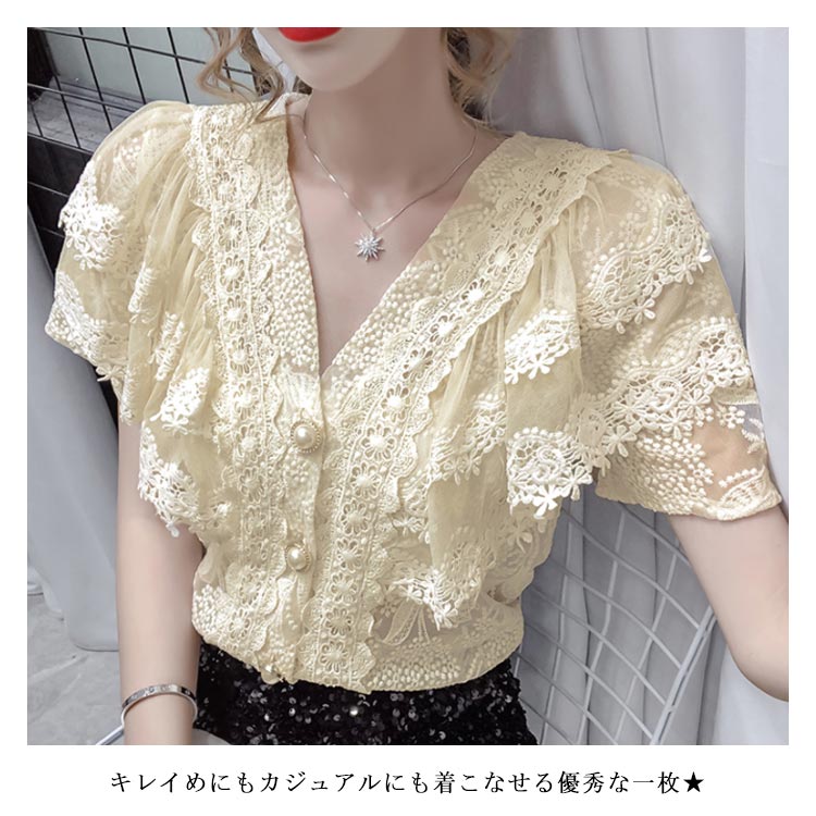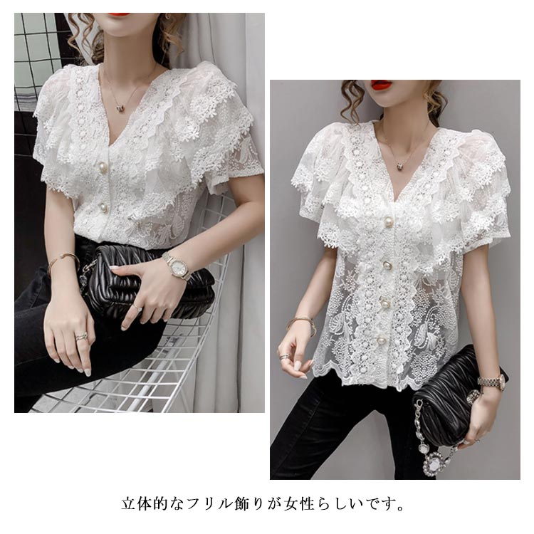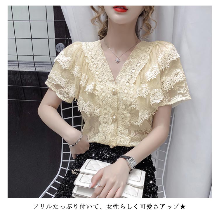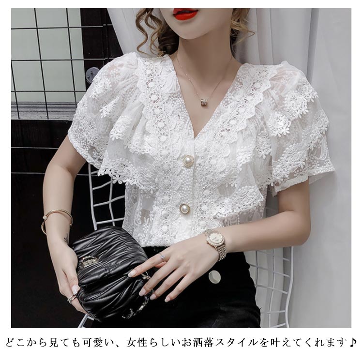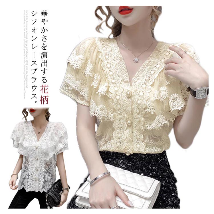 ブラウス レディース シフォンブラウス レース付き 半袖 シャツブラウス 半袖ブラウス Vネック 花柄レース シフォン 薄手 フリル フレアスリーブ お洒落 フェミニン エレガント 優雅 キレイめ トップス 春夏 夏新作 送料無料