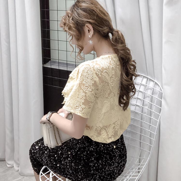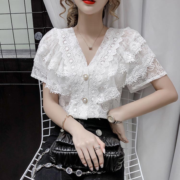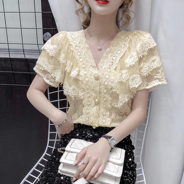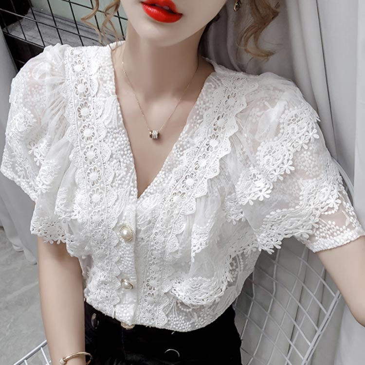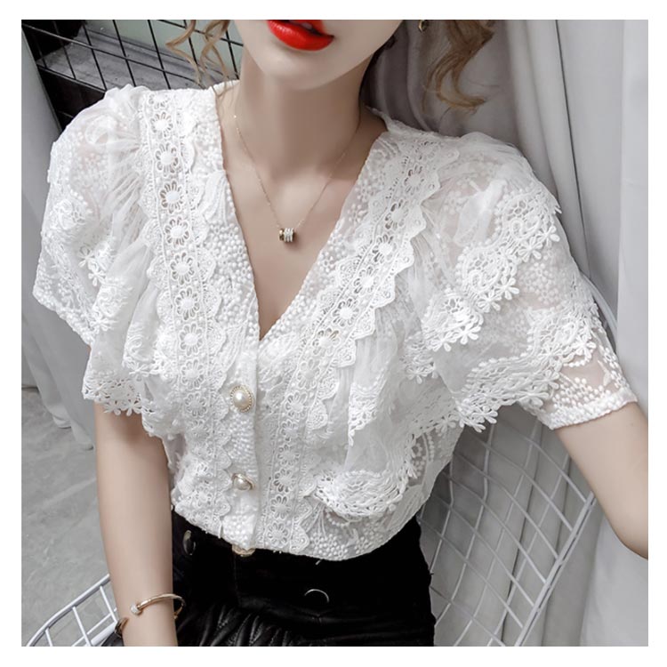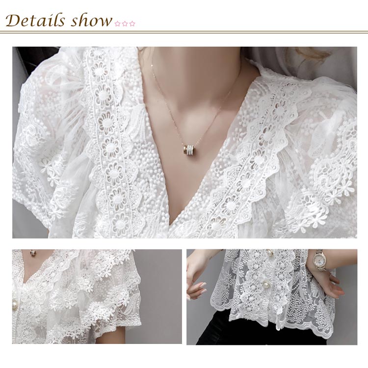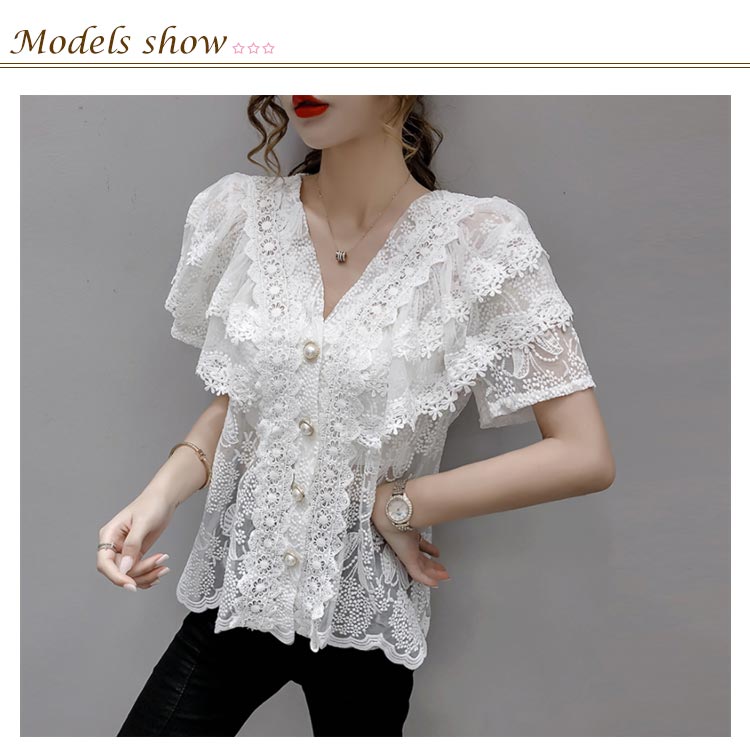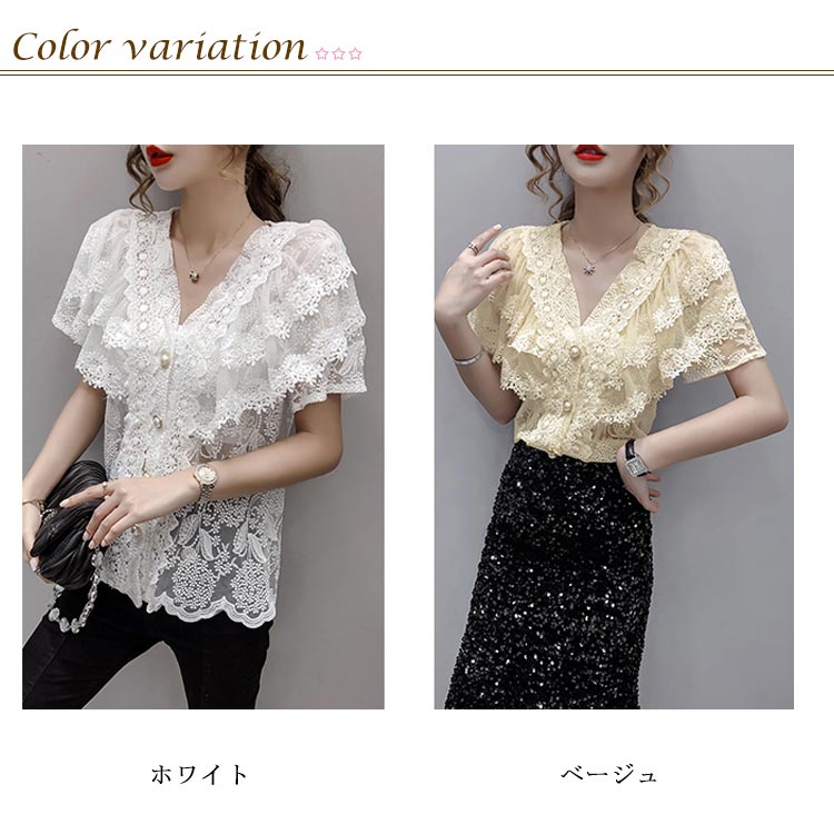 ブラウス レディース シフォンブラウス レース付き 半袖 シャツブラウス 半袖ブラウス Vネック 花柄レース シフォン 薄手 フリル フレアスリーブ お洒落 フェミニン エレガント 優雅 キレイめ トップス 春夏 夏新作 送料無料