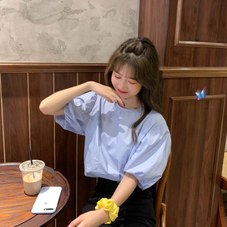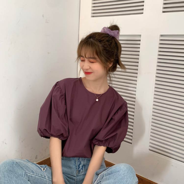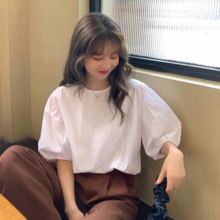 ブラウス レディース シャツ 無地ブラウス ボリュームスリーブ ブラウス パフスリーブ クルーネック 五分袖 ショート丈 ゆったり お洒落 薄手 大人可愛い こなれ感 フェミニン トップス プルオーバー 夏新作 送料無料