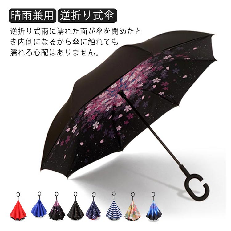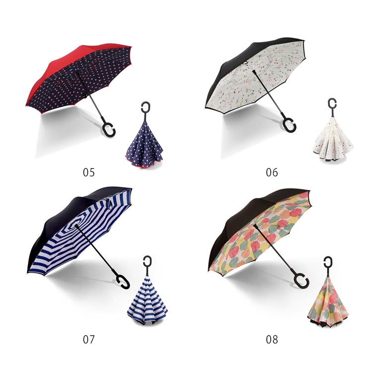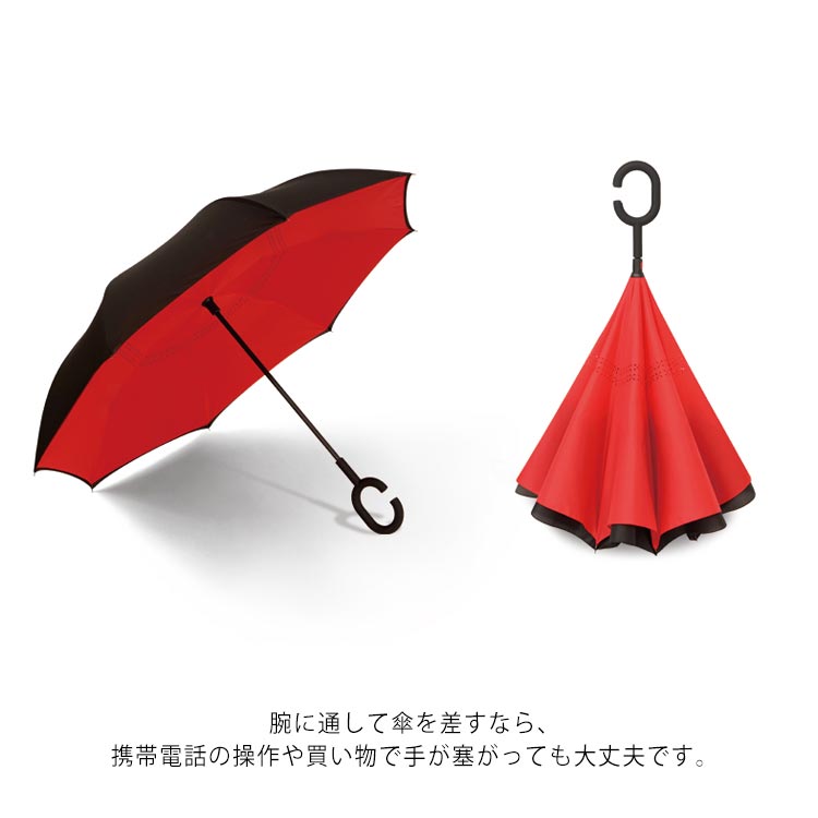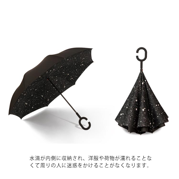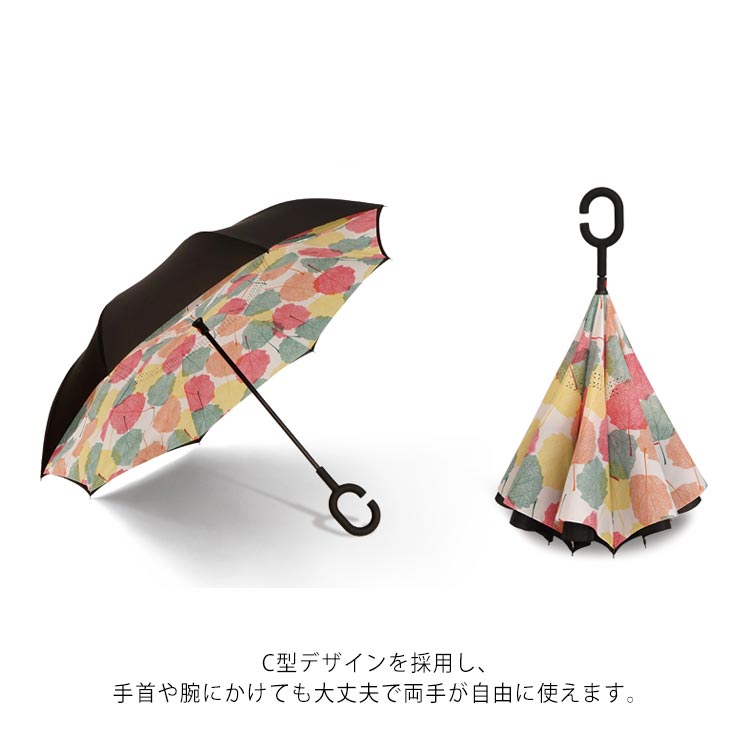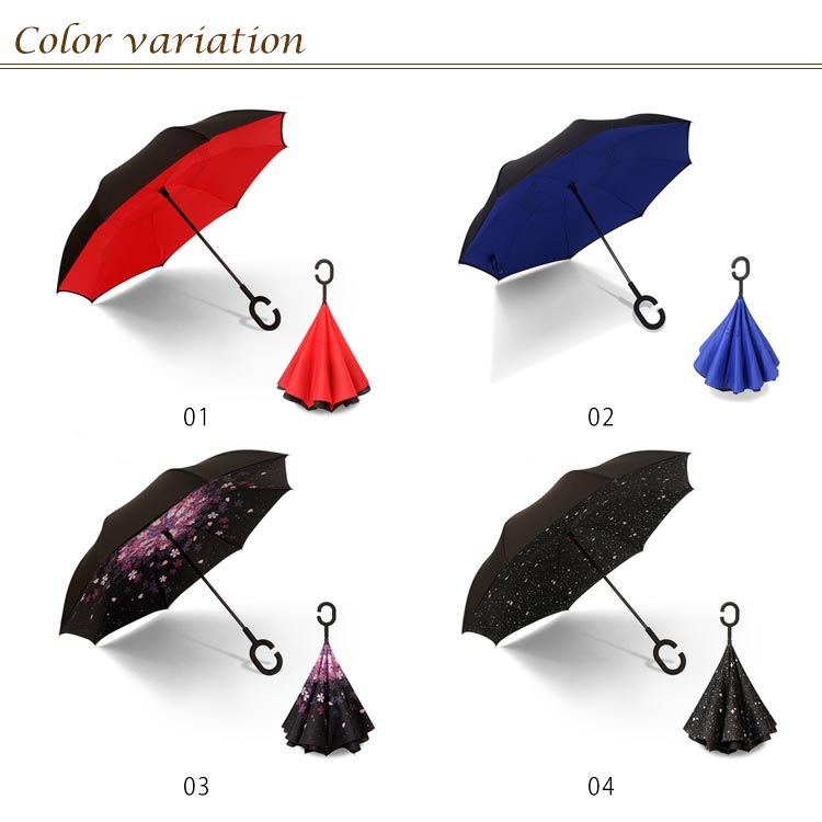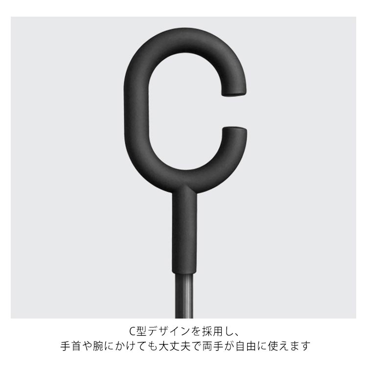 | 逆折り式雨に濡れた面が傘を閉めたとき内側になるから傘に触れても濡れる心配はありません。 水滴が内側に収納され、洋服や荷物が濡れることなくて周りの人に迷惑をかけることがなくなります。 C型デザインを採用し、手首や腕にかけても大丈夫で両手が自由に使えます。 腕に通して傘を差すなら、携帯電話の操作や買い物で手が塞がっても大丈夫です。 | |