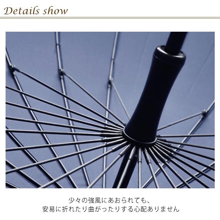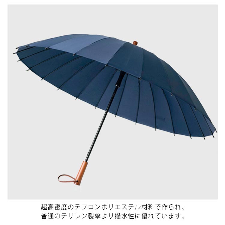 | 柔軟で丈夫なグラスファイバーを採用し、24本骨にすることで今までにない強度と耐久性を実現します。 少々の強風にあおられても、安易に折れたり曲がったりする心配ありません。 超高密度のテフロンポリエステル材料で作られ、普通のテリレン製傘より撥水性に優れています。 長い間使用しても雨の染み込みが気にならなくなりました。 天然の木で作された手元が高級です。 何年経ってもベトベトしなくて、手触り感もよいです。 | |