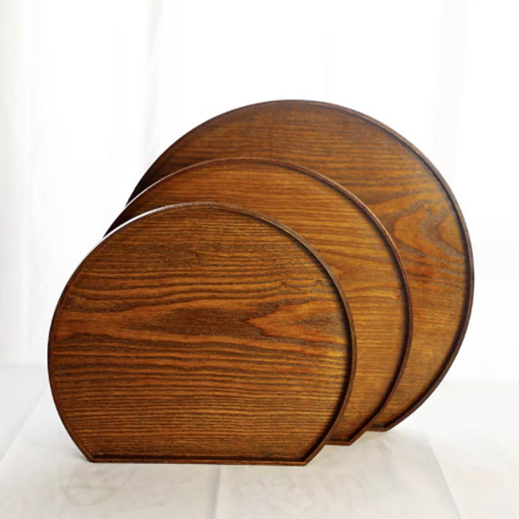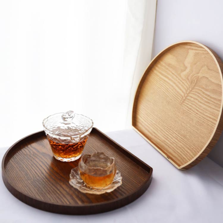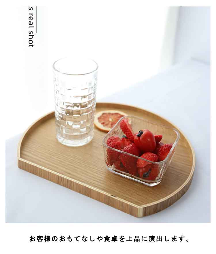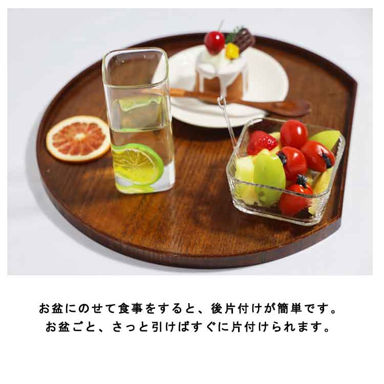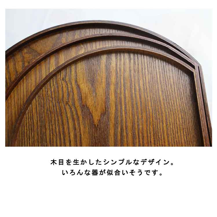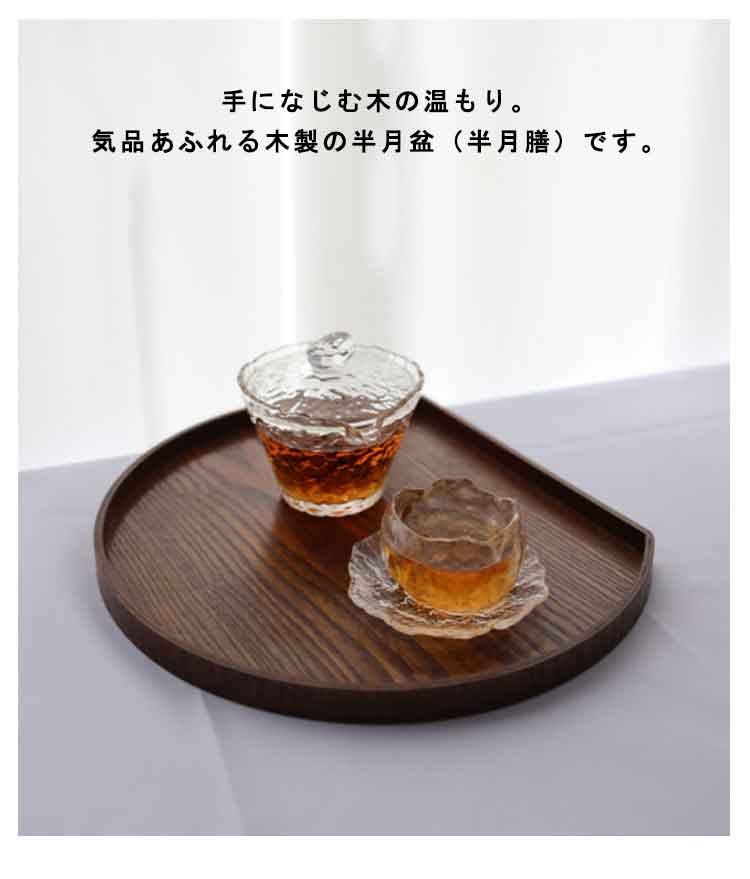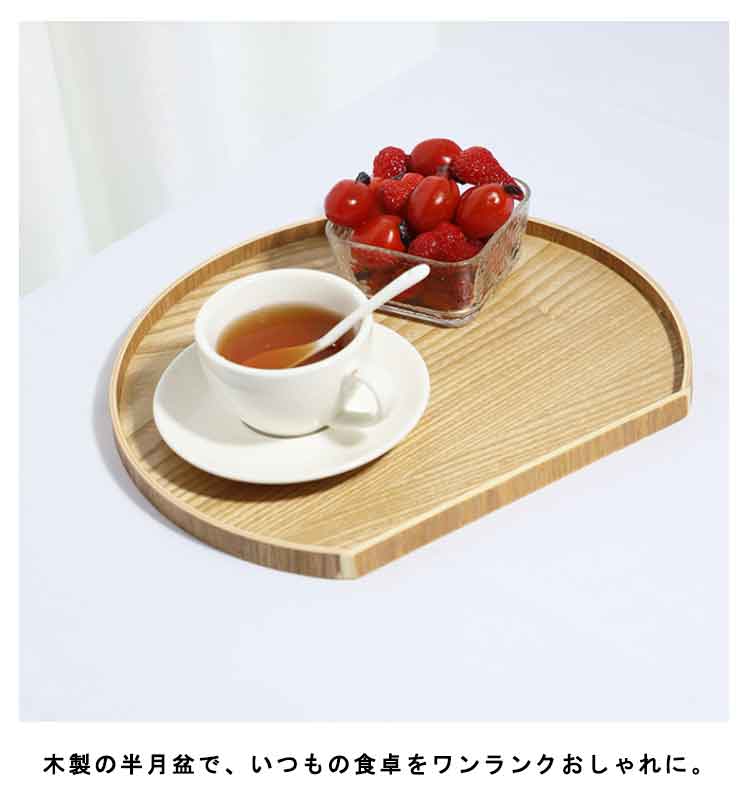 | 木製の半月盆で、いつもの食卓をワンランクおしゃれに。 手になじむ木の温もり。気品あふれる木製の半月盆(半月膳)です。 お客様のおもてなしや食卓を上品に演出します。 仕上げにはウレタンコーティングを施していますので、耐久性にも優れ、お店を営まれている方にもおすすめです。 木目を生かしたシンプルなデザイン。いろんな器が似合いそうです。 お食事を1ランク上質な時間に引き上げてくれますね。 お盆にのせて食事をすると、後片付けが簡単です。お盆ごと、さっと引けばすぐに片付けられます。 | |