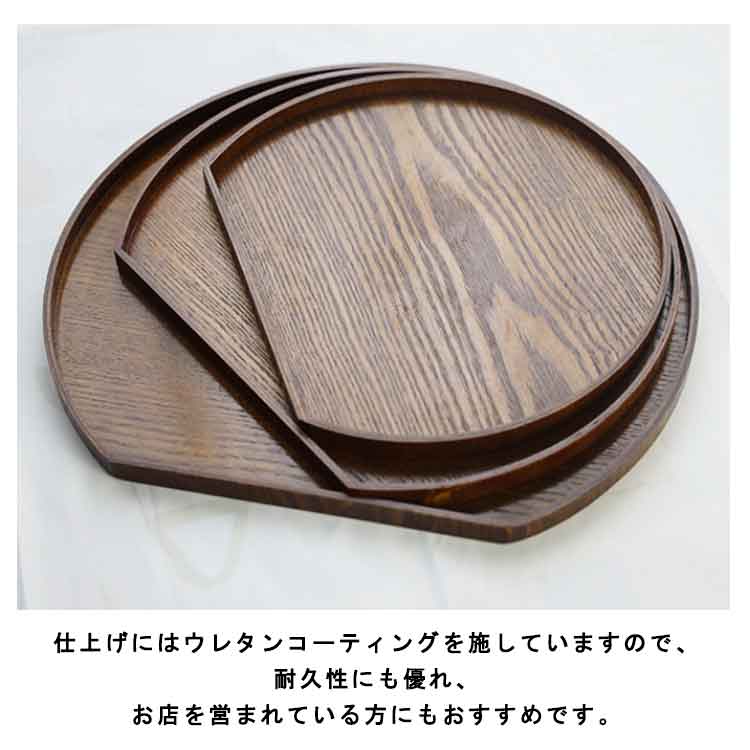 木製の半月盆で、いつもの食卓をワンランクおしゃれに。手になじむ木の温もり。気品あふれる木製の半月盆(半月膳)です。お客様のおもてなしや食卓を上品に演出します。仕上げにはウレタンコーティングを施していますので、耐久性にも優れ、お店を営まれている方にもおすすめです。木目を生かしたシンプルなデザイン。いろんな器が似合いそうです。お食事を1ランク上質な時間に引き上げてくれますね。お盆にのせて食事をすると、後片付けが簡単です。お盆ごと、さっと引けばすぐに片付けられます。