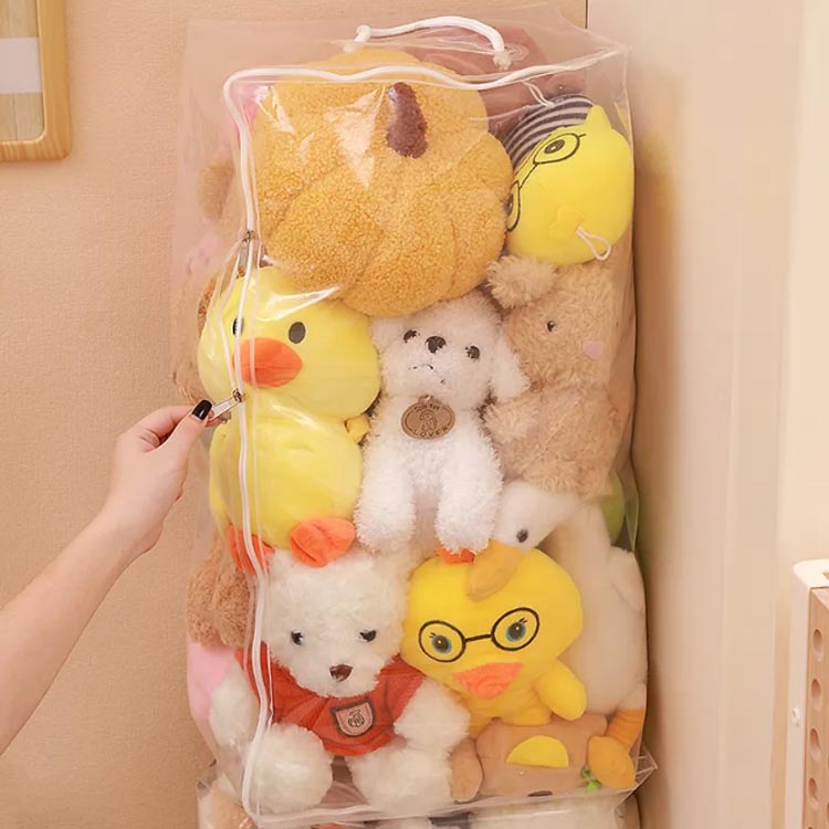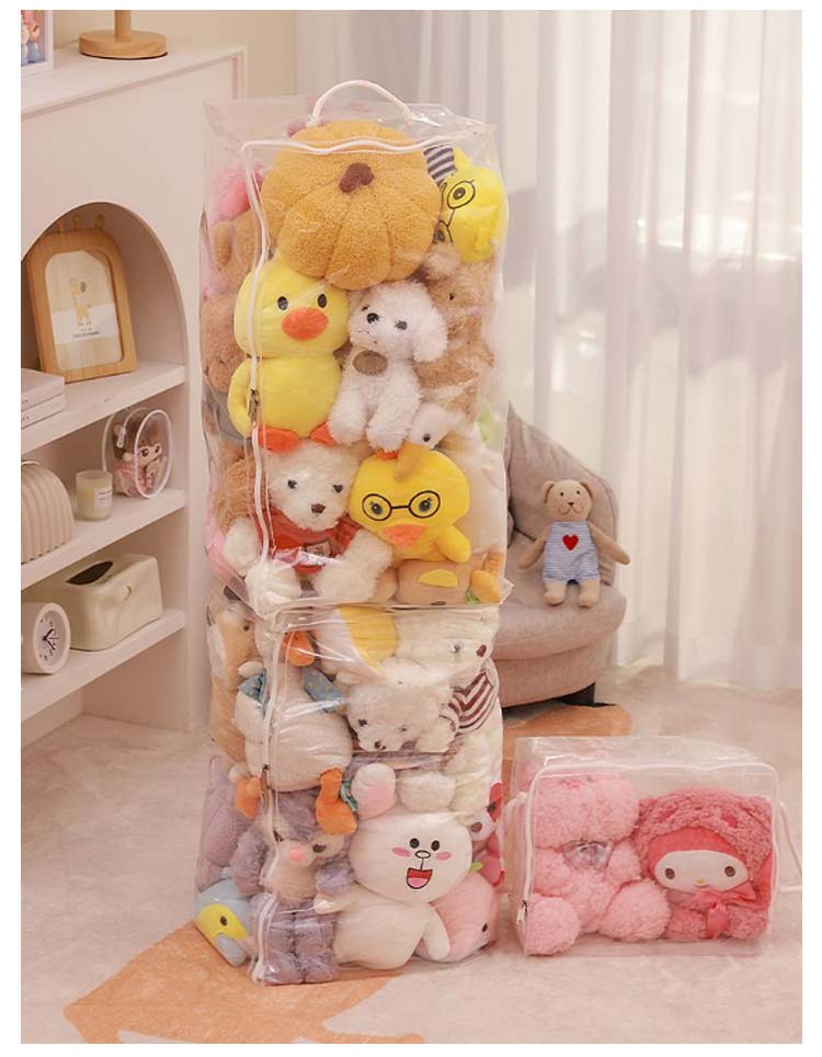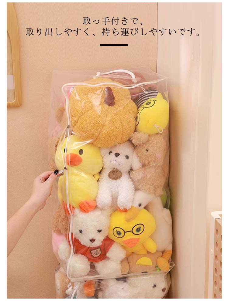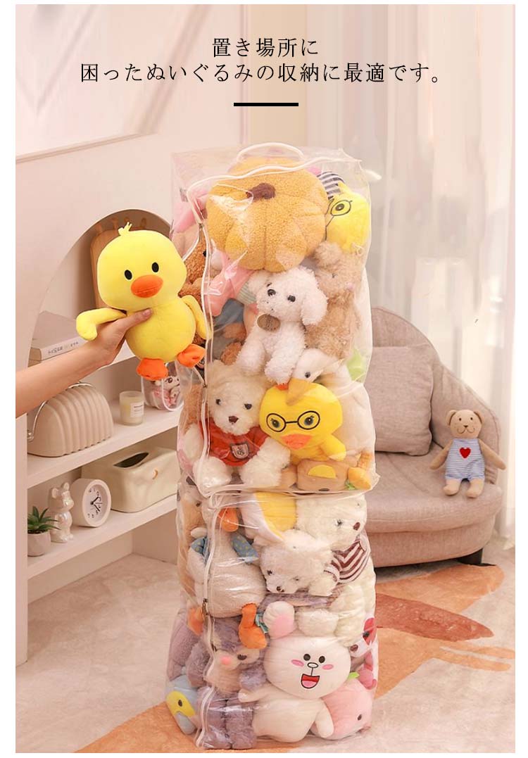 | おしゃれで機能的な収納袋。 透明の素材なので、おしゃれに収納でき、ファスナーを開けずに中身の確認が簡単にできます。 取っ手付きで、取り出しやすく、持ち運びしやすいです。 置き場所に困ったぬいぐるみの収納に最適です。 ぬいぐるみはもちろん、バッグ、ストール、マフラー、ベルトなどのファッション小物を入れておくのにもオススメ。 | |