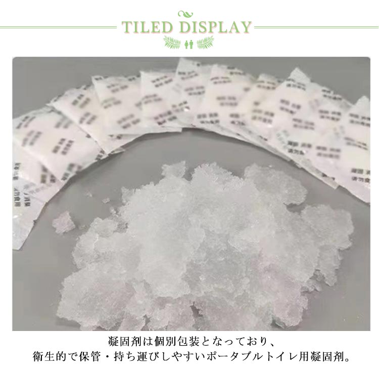 非常時や断水、停電でトイレが使えなくなった時に役立つ簡易トイレ用凝固剤。凝固剤は個別包装となっており、衛生的で保管・持ち運びしやすいポータブルトイレ用凝固剤。凝固剤1袋で約500mlの水分を固めることが可能です。水分を素早く固めるので使用後の水分モレの心配がありません。水がなくても、ふりかけるだけでゼリー状に固めるから、被災など時に重宝する間違いありません。アウトドアや車内の簡易トイレだけでなく、介護用ポータブルトイレにも役に立ちます。