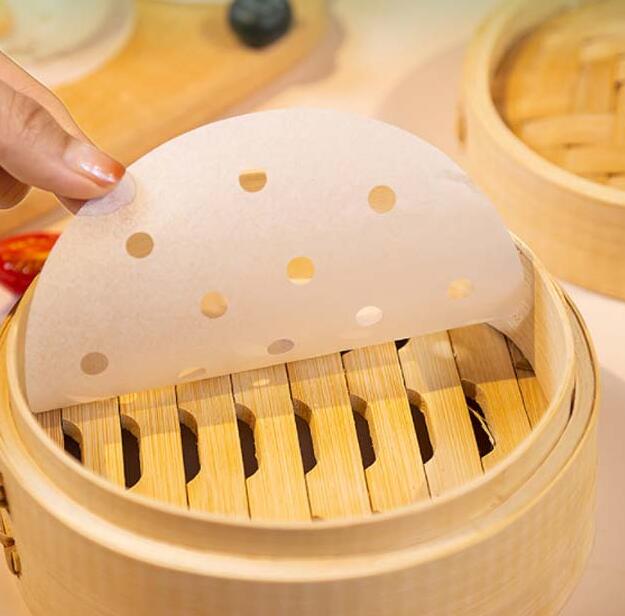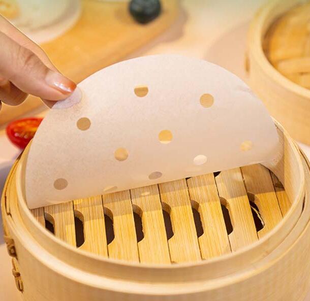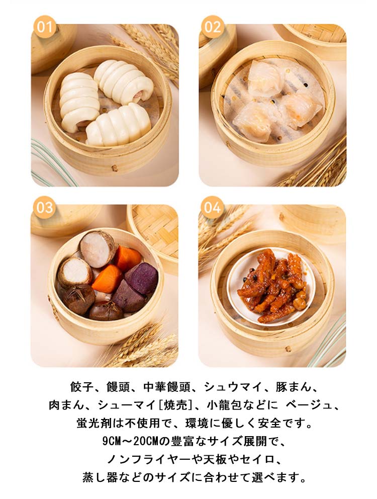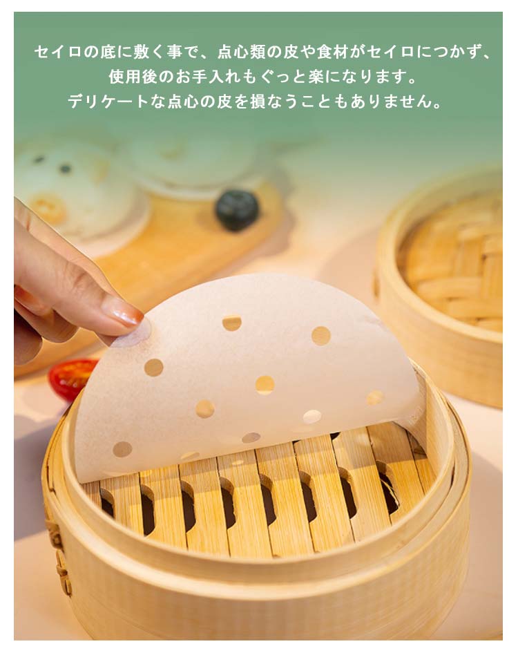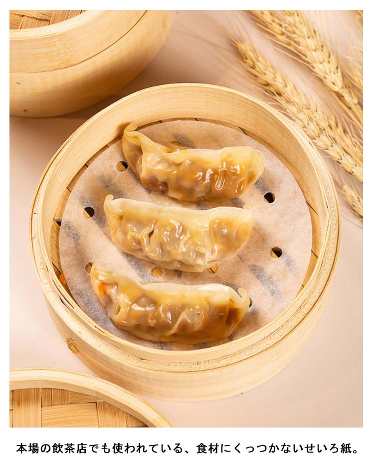 | 500枚入り せいろ専用クッキングシート? 本場の飲茶店でも使われている、食材にくっつかないせいろ紙。 セイロの底に敷く事で、点心類の皮や食材がセイロにつかず、使用後のお手入れもぐっと楽になります。デリケートな点心の皮を損なうこともありません。 蒸気の通る穴があるから効率よく蒸せます。 餃子、饅頭、中華饅頭、シュウマイ、豚まん、肉まん、シューマイ[焼売]、小龍包などに ベージュ、蛍光剤は不使用で、環境に優しく安全です。 直接食べ物と接触できます。 9cm~20cmの豊富なサイズ展開で、ノンフライヤーや天板やセイロ、蒸し器などのサイズに合わせて選べます。 | |
