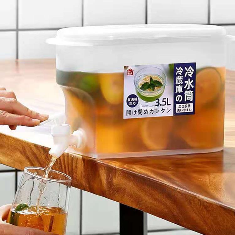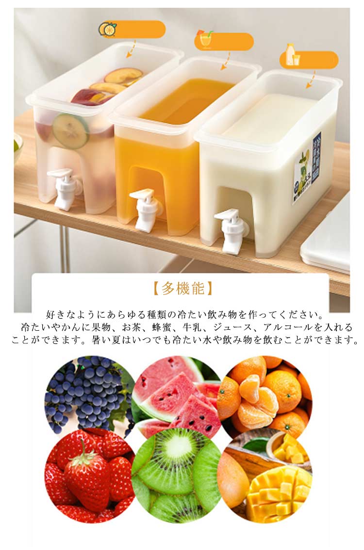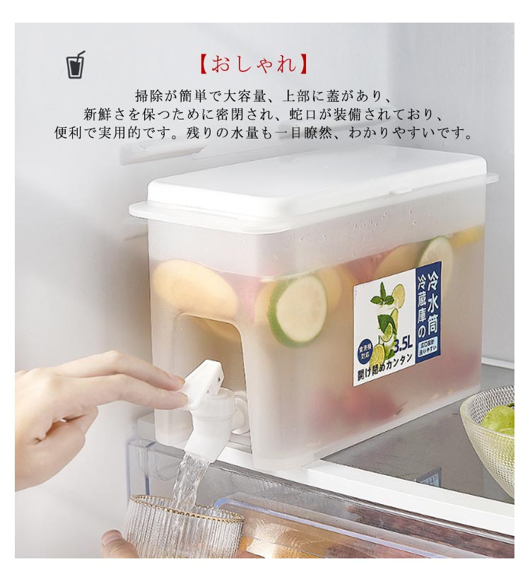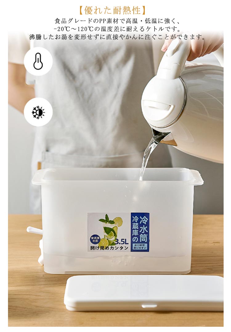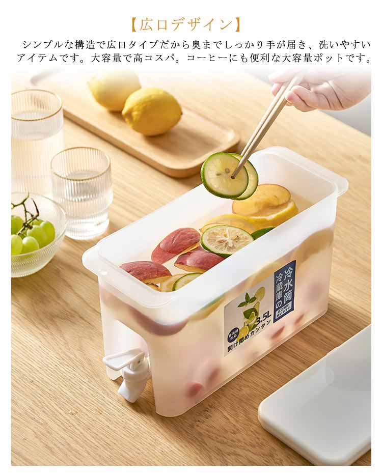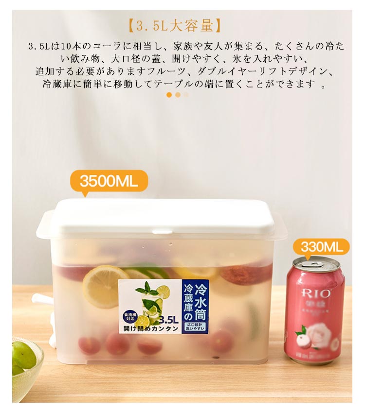 【3.5L大容量】3.5Lは10本のコーラに相当し、家族や友人が集まる、たくさんの冷たい飲み物、大口径の蓋、開けやすく、氷を入れやすい、追加する必要がありますフルーツ、ダブルイヤーリフトデザイン、冷蔵庫に簡単に移動してテーブルの端に置くことができます 。【蛇口付き】口式コック付きウォータータンクの水量はコックによる調節可能で、水の出す量を制御しやすい、使いやすいです。また、シリコンリングで密閉されるので、 水漏れの心配も必要はありません。【多機能】好きなようにあらゆる種類の冷たい飲み物を作ってください。冷たいやかんに果物、お茶、蜂蜜、牛乳、ジュース、アルコールを入れることができます。暑い夏はいつでも冷たい水や飲み物を飲むことができます。【優れた耐熱性】食品グレードのPP素材で高温・低温に強く、-20℃~120℃の温度差に耐えるケトルです。沸騰したお湯を変形せずに直接やかんに注ぐことができます。【おしゃれ】掃除が簡単で大容量、上部に蓋があり、新鮮さを保つために密閉され、蛇口が装備されており、便利で実用的です。残りの水量も一目瞭然、わかりやすいです。【広口デザイン】シンプルな構造で広口タイプだから奥までしっかり手が届き、洗いやすいアイテムです。大容量で高コスパ。コーヒーにも便利な大容量ポットです。