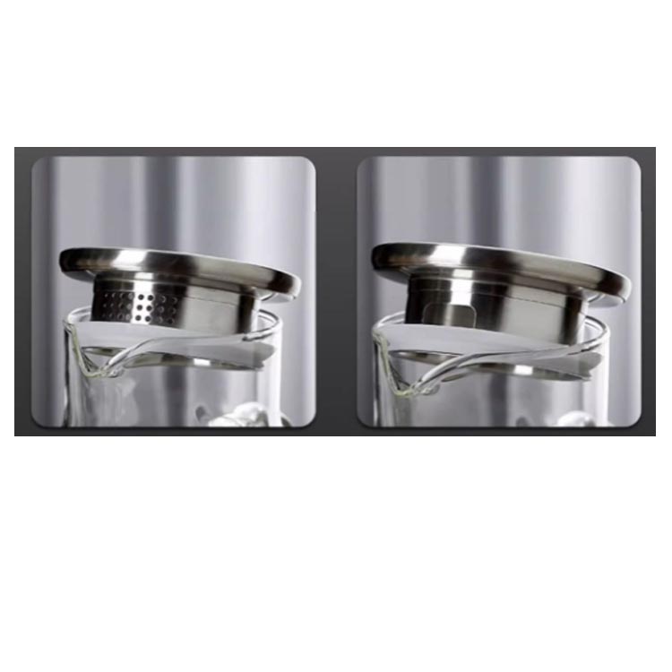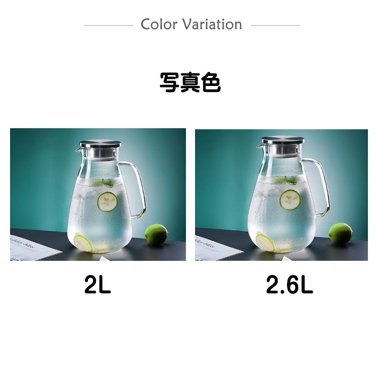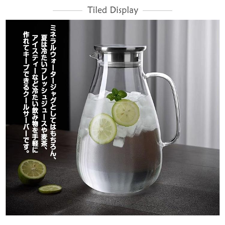 | 直火対応!耐熱ガラスで作られたガラスポット `-20℃~120℃対応可能!温かい飲み物にも冷たい飲み物にも使える耐熱ガラス製のピッチャーです。 ミネラルウォータージャグとしてはもちろん、夏は冷たいフレッシュジュースや麦茶、アイスティーなど冷たい飲み物を手軽に作れてキープできるクールサーバーです。冬には暖かいお茶など1年を通してお使いいただけます。 二つの機能を付けたフィルター、ニーズに合わせて転換可能です。 オシャレなクリアデザイン、中身の量が一目で確認できます。 手が奥まで入る広口なデザインで、洗いやすくて、茶渋などのしつこい汚れもしっかり洗い落として頂けます。 電気陶炉、ガスコンロともご使用可能です。(IH調理器対応できません) | |