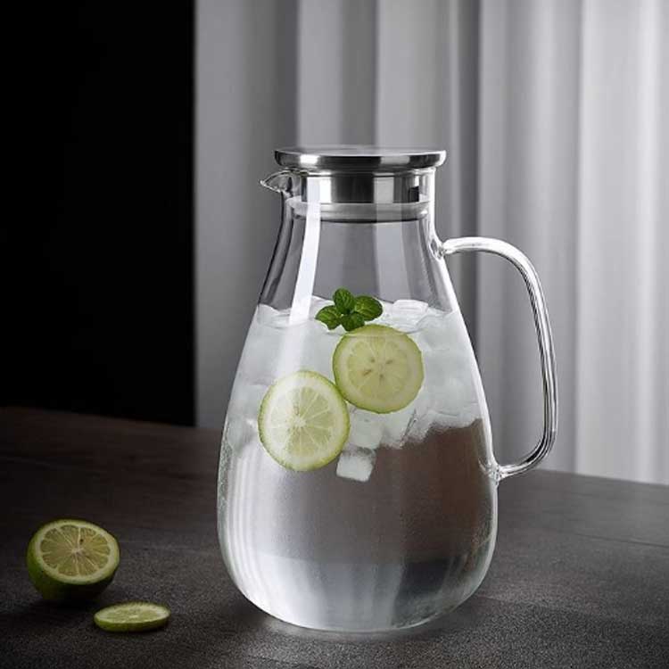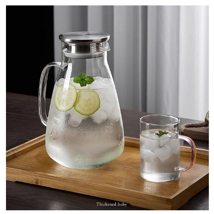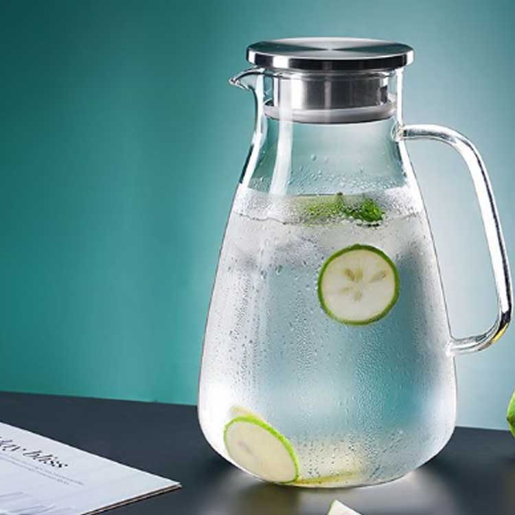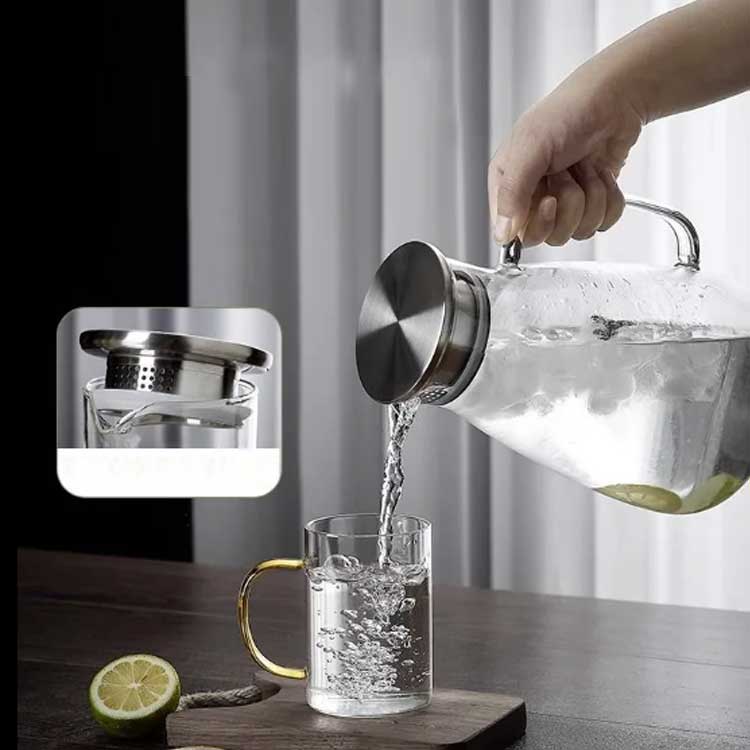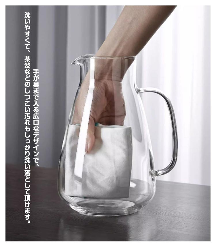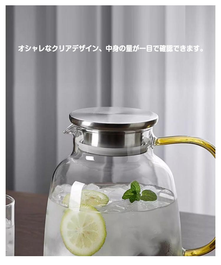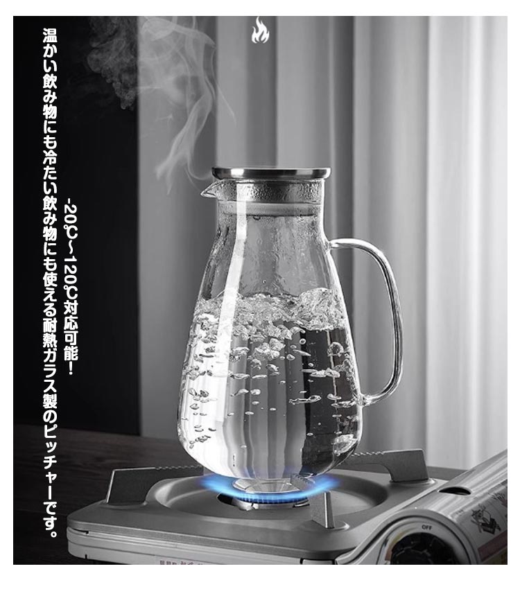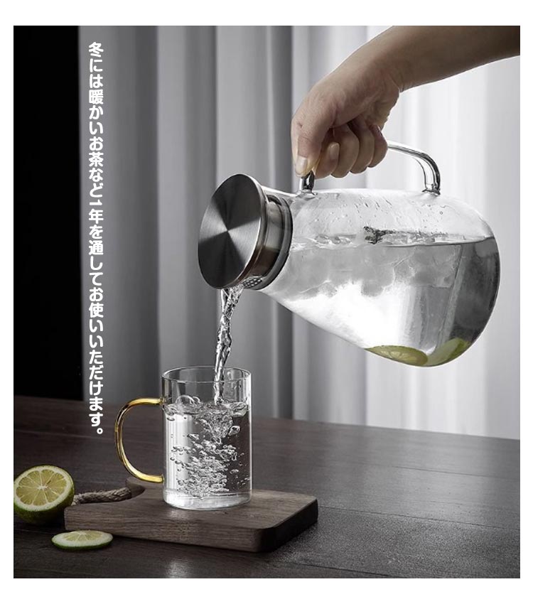 直火対応!耐熱ガラスで作られたガラスポット`-20℃~120℃対応可能!温かい飲み物にも冷たい飲み物にも使える耐熱ガラス製のピッチャーです。ミネラルウォータージャグとしてはもちろん、夏は冷たいフレッシュジュースや麦茶、アイスティーなど冷たい飲み物を手軽に作れてキープできるクールサーバーです。冬には暖かいお茶など1年を通してお使いいただけます。二つの機能を付けたフィルター、ニーズに合わせて転換可能です。オシャレなクリアデザイン、中身の量が一目で確認できます。手が奥まで入る広口なデザインで、洗いやすくて、茶渋などのしつこい汚れもしっかり洗い落として頂けます。電気陶炉、ガスコンロともご使用可能です。(IH調理器対応できません)