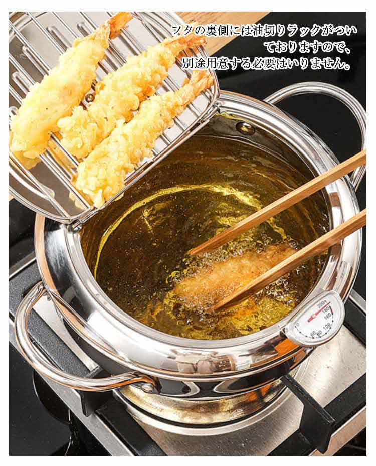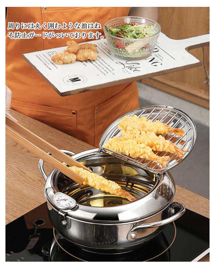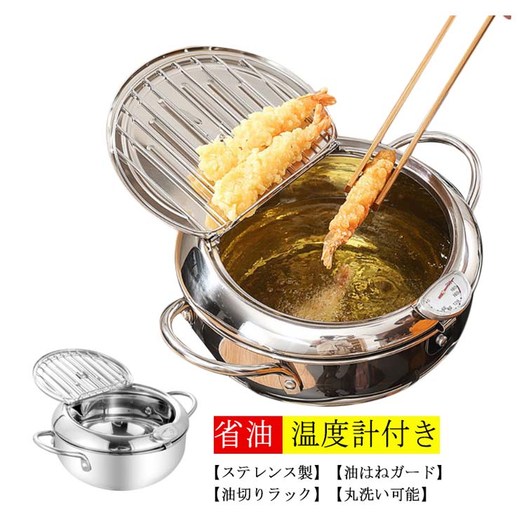 揚げ物鍋 ステンレス 天ぷら鍋 てんぷらなべ 揚げ物 両手天ぷら鍋 ステンレス鍋 304ステンレス 鍋 温度計付き 温度制御 油切りラック 省油 健康生活 IH対応 ガス対応 蓋付き 鍋つかみ 分解可能 丸洗い 油はねガード 油ハネ防止フード 油ハネ 20cm 24cm 28cm